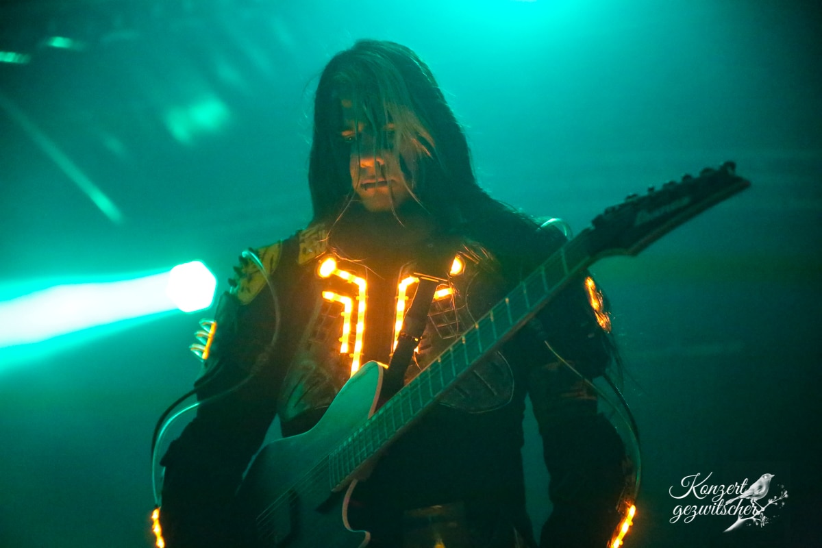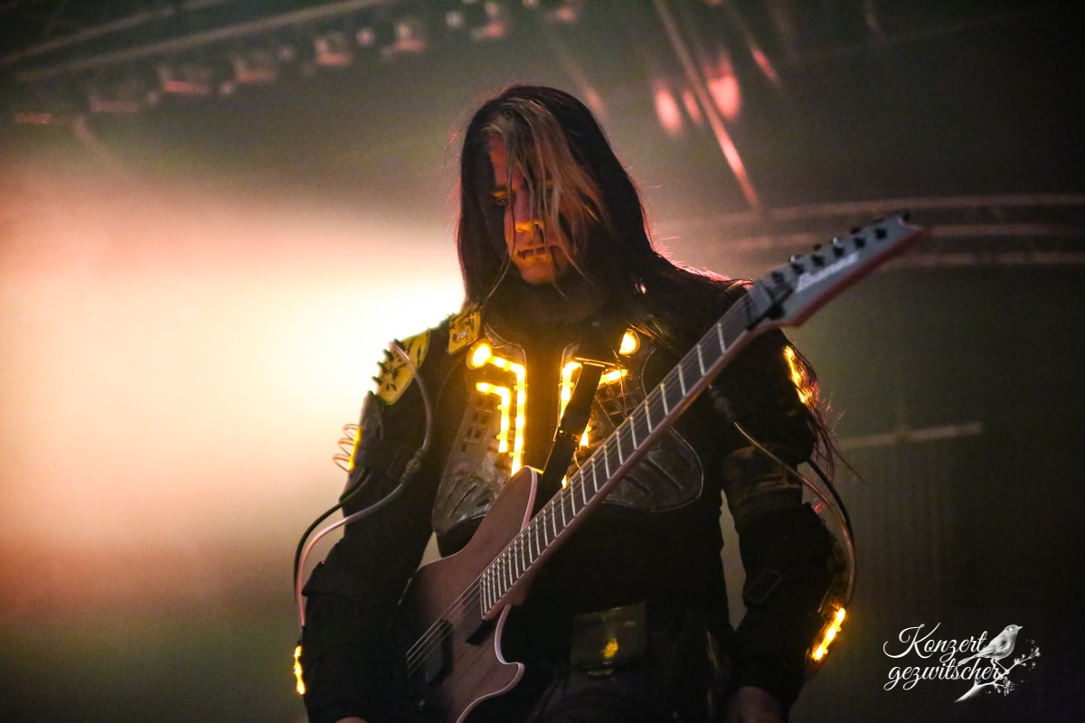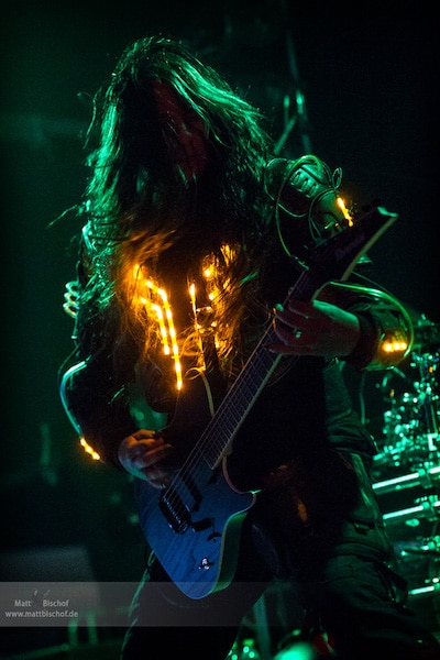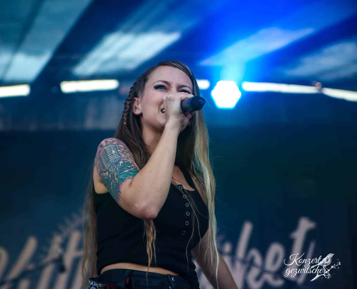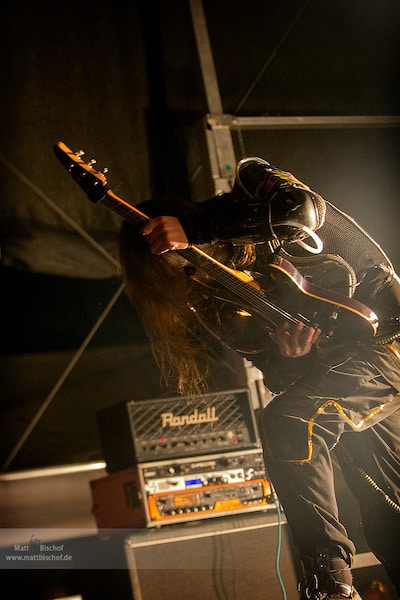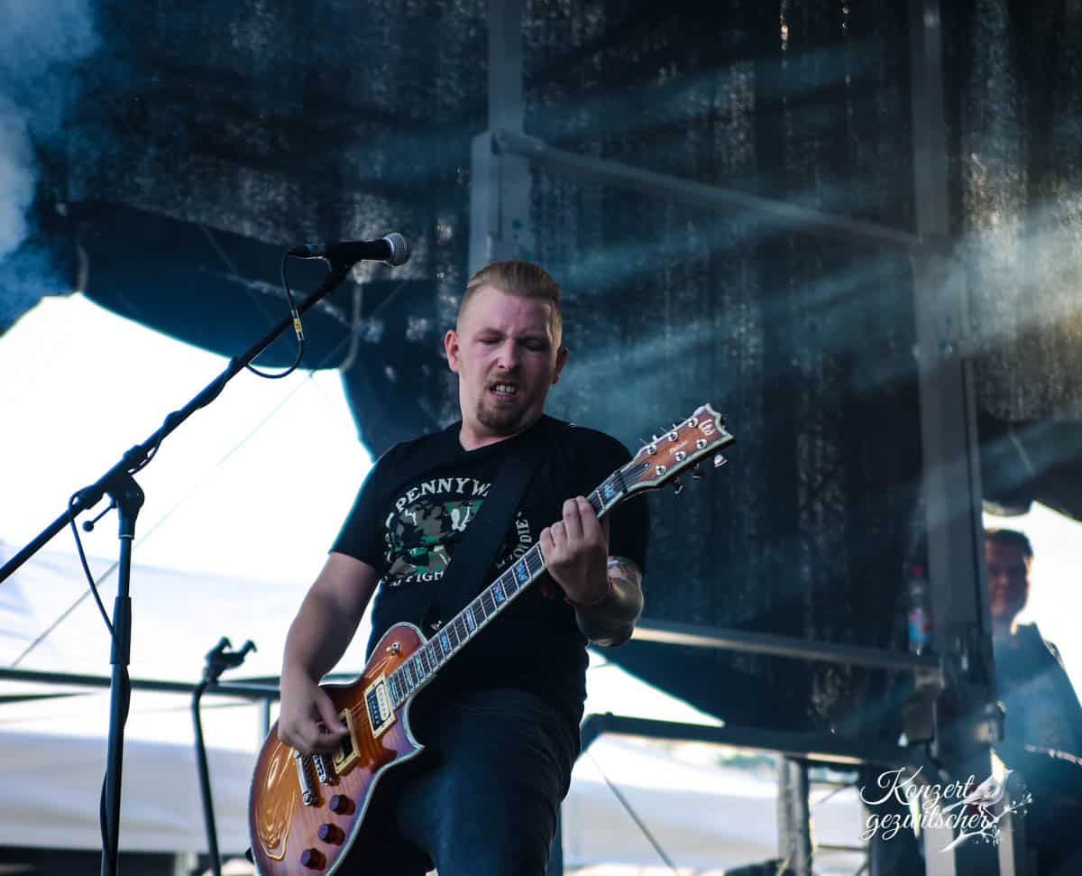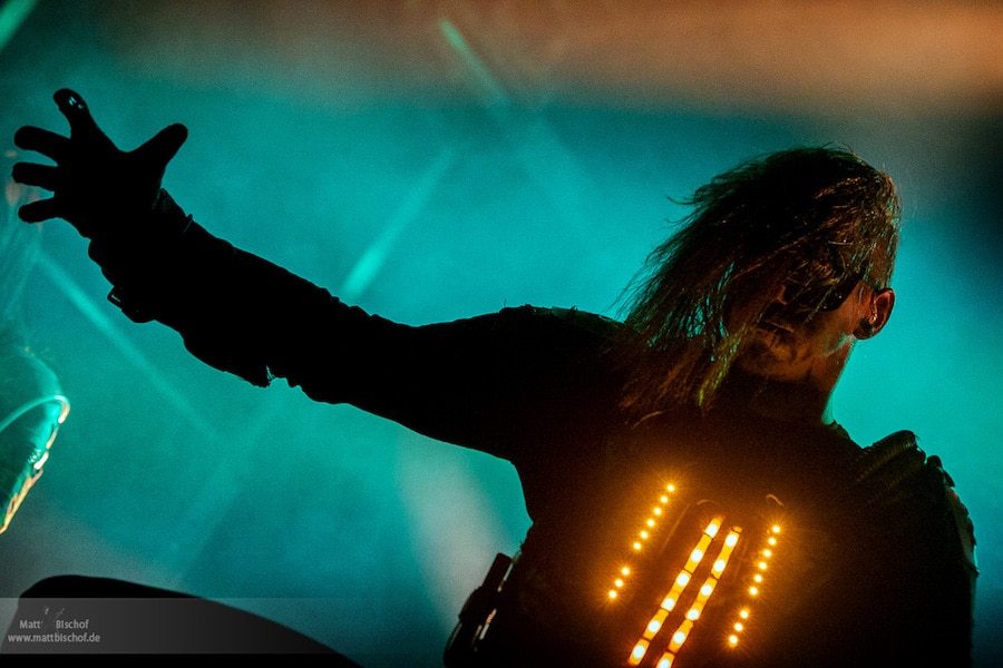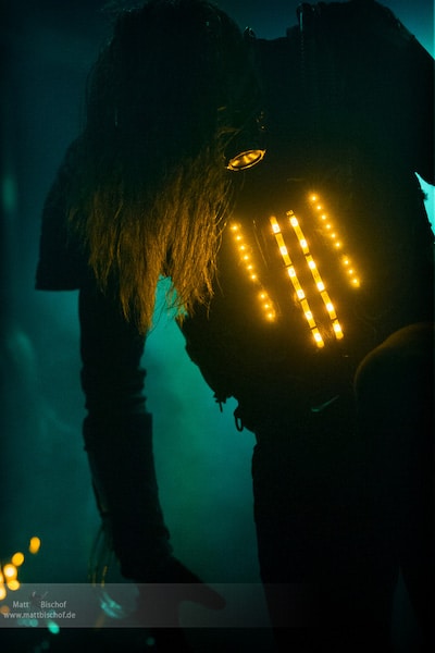 “Wir befinden uns im 22. Jahrhundert. Der dritte Weltkrieg hat dazu geführt, dass die komplette Menschheit ausgelöscht und die Erde radioaktiv verstrahlt ist.“ Nein, das ist nicht der Vorspann eines postapokalpytischen Science-Fiction-Films, sondern das Konzept der Mannheimer von CYPECORE. Die Industrial-Metal-Band macht in ihren Schutzanzügen ordentlich etwas her – würde man sie denn auf der mittlerweile dunklen Camel Stage denn wenigstens sehen! CYPECORE macht jedoch auch keine Anstalten, denn zahlreichen Gästen vor der Bühne die Sicht ein wenig zu erleichtern, hüllen sie sich stattdessen in dichten Bühnennebel. Und so bleiben die Blinklichter an den Brustpanzern der Musiker alles, was mir bleibt, um mich daran zu orientieren, wo da was vor mir steht. CYPECORE geht in der Rolle der futuristischen Maschinen mit ruckhaften Bewegungen voll und ganz auf, auch wenn der Sound auf der kleinen Nebenbühne aus dem saftigen, brachialen Donnern ein dumpfer Brei entsteht, aus dem zum Beispiel der Klargesang von Dominic Christoph nur noch schwer herauszufiltern ist. Immerhin hört man die Jungs gut genug, um die Voraussage zu treffen: Der Geheimtipp des SUMMER BREEZE hat noch eine (Vorsicht, Wortspiel) strahlende Zukunft vor sich.