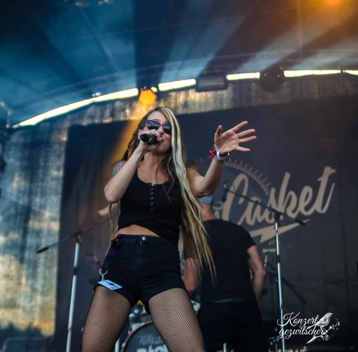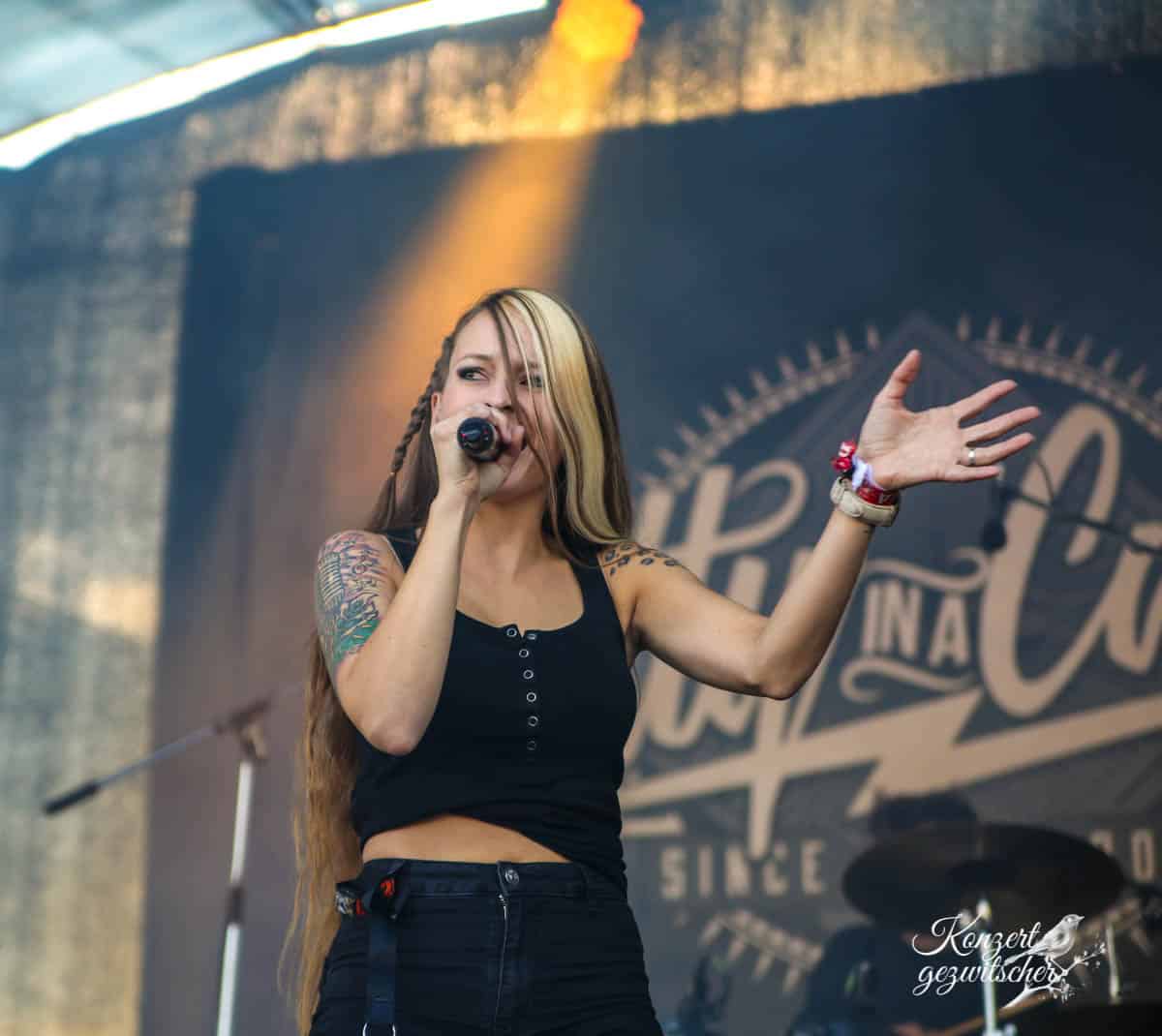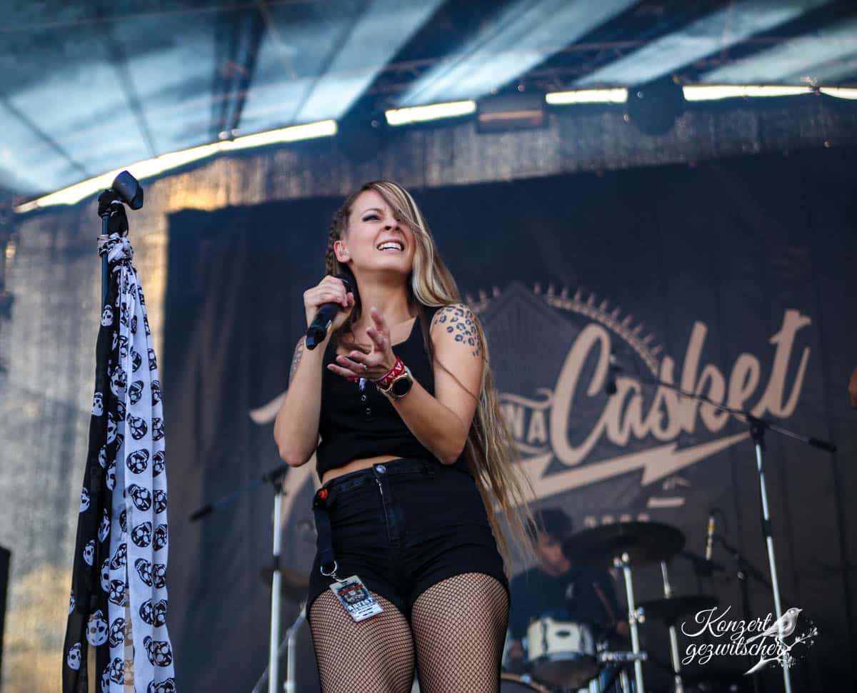 Holla, die Waldfee! Der Auftritt von KITTY IN A CASKET zwischen der T Stage und den Hauptbühnen ist ein wahres Fest für Kollegen mit langsamem Autofokus. Denn nicht nur die Saitenhexer der österreichischen Rockabilly-Punk-Band sorgen mit dynamischen Posen für ein atemberaubendes Tempo auf der Bühne. Vor allem die Frontfrau Kitty wirbelt sichtlich gut gelaunt und wild tanzend über die Bühne, strahlt und hat absolut gar keine Probleme, das ihr wohl gesonnene Publikum ebenfalls zur ausgelassenen Front-Of-Stage-Party zu animieren. Fast ist es, als sähe man KITTY IN A CASKET bei einer privaten WG-Party zu, derart gehen die Musiker in ihrem mitreißenden, beinahe swingenden Sound auf – stets mit einem seligen Lächeln auf den Lippen. Auch musikalisch machen die Herren mit ihrer Lady in der Mitte einiges her. Musikalisch versorgt KITTY IN A CASKET die Festivalgänger vor allem mit neuem Material von ihrem frischen Langspieler „Rise“, ein eindrucksvoller Schlag der Wiener mit dem sie sich als wesentlich gereifter und auch auf der Bühne optisch weniger verspielter als in den Vorjahren präsentierten. Damit wirft Kitty in Dinkelsbühl bereits mit einer halben Stunde Spielzeit einen Köder für die Herbst-Tour mit THE OTHER auf den HELL NIGHTS aus…