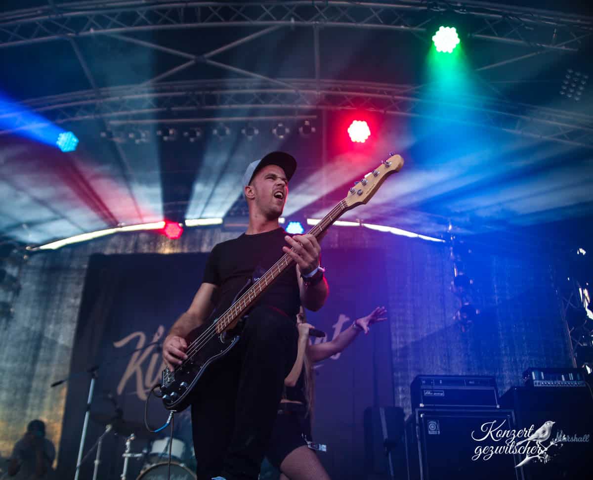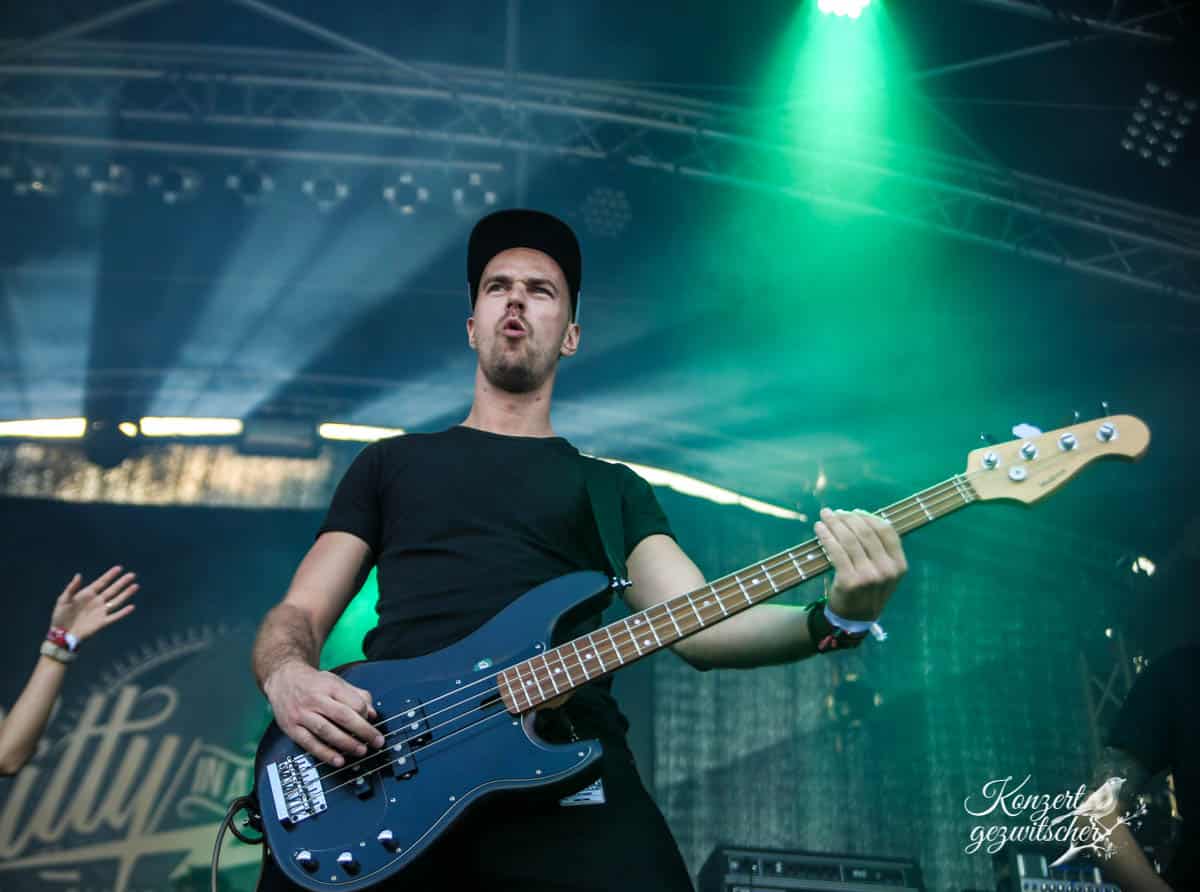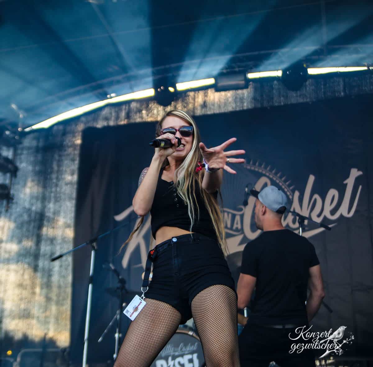 Holla, die Waldfee! Der Auftritt von KITTY IN A CASKET zwischen der T Stage und den Hauptbühnen ist ein wahres Fest für Kollegen mit langsamem Autofokus. Denn nicht nur die Saitenhexer der österreichischen Rockabilly-Punk-Band sorgen mit dynamischen Posen für ein atemberaubendes Tempo auf der Bühne. Vor allem die Frontfrau Kitty wirbelt sichtlich gut gelaunt und wild tanzend über die Bühne, strahlt und hat absolut gar keine Probleme, das ihr wohl gesonnene Publikum ebenfalls zur ausgelassenen Front-Of-Stage-Party zu animieren. Fast ist es, als sähe man KITTY IN A CASKET bei einer privaten WG-Party zu, derart gehen die Musiker in ihrem mitreißenden, beinahe swingenden Sound auf – stets mit einem seligen Lächeln auf den Lippen. Auch musikalisch machen die Herren mit ihrer Lady in der Mitte einiges her. Musikalisch versorgt KITTY IN A CASKET die Festivalgänger vor allem mit neuem Material von ihrem frischen Langspieler „Rise“, ein eindrucksvoller Schlag der Wiener mit dem sie sich als wesentlich gereifter und auch auf der Bühne optisch weniger verspielter als in den Vorjahren präsentierten. Damit wirft Kitty in Dinkelsbühl bereits mit einer halben Stunde Spielzeit einen Köder für die Herbst-Tour mit THE OTHER auf den HELL NIGHTS aus…