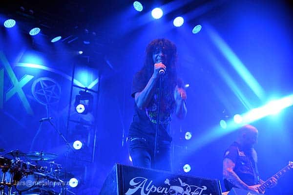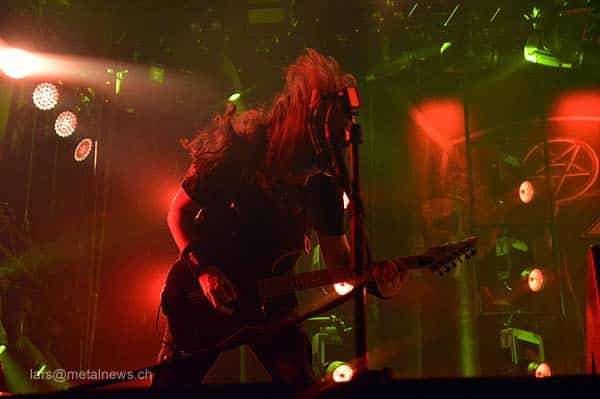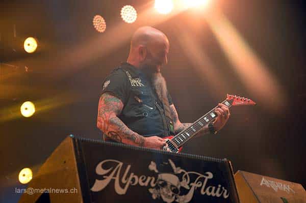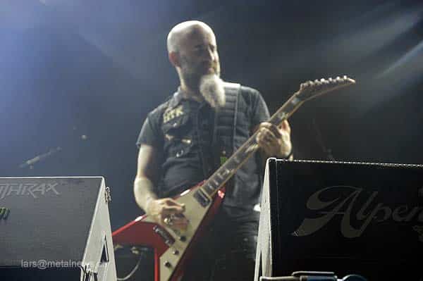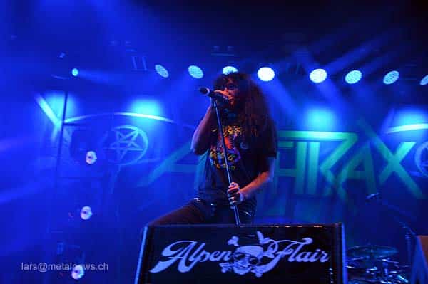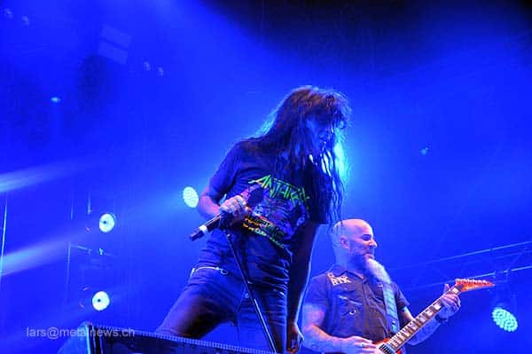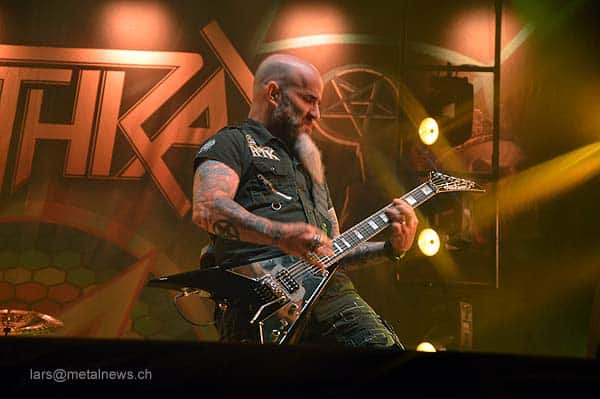 Erneut wieder eine Band die ich dieses Jahr schon sah. Das Jahr läuft wohl unter dem Motto der Wiederholungen. Trotzdem freute ich mich wie ein Kleinkind auf einer der Big Four Thrash Metal Bands. Die Freude rührt vorrallem daher, dass ich bei den ersten drei Songs im Fotograben war und ich die Jungs rund um Sänger Joey Belladonna, hautnah erleben kann. Im Fotograben positioniert, liessen die Amis noch auf sich warten. Mir fiel nichts besseres ein, als ANTHRAX rufen anzustimmen. Verblüfend, dass sehr viele Fans dann einstimmten. Plötzlich wars soweit. Joey Belladonna, Scott Ian, Frank Bello und Jonathan Donais stürmten die Bühne. Mit dem Song „Among the Living“ ging es los ohne rücksicht auf Verluste. Als Fotograf war vorrallem schwer Sänger Joey einzufangen. Er war flink wie ein Wiesel.
