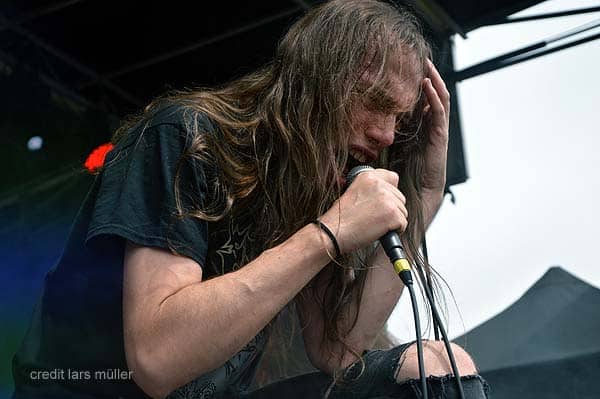Bei den Österreichern von HARAKIRI FOR THE SKY war ich sehr skeptisch, ob mir diese Band zusagt. Ihre Mischung aus Black und Extreme Metal ist sehr eigen, vor allem, weil die Black Metal Elemente nicht typisch sind. Da war viel, sehr viel Energie dahinter. Am besten gefiel mir das Spiel des Gitarristen, dessen Namen ich nicht in Erfahrung bringen konnte, da im Internet nur zwei Bandmitglieder aufgeführt werden. Auch die kräftige Stimme des Sängers J.J war überwältigend. Zwischendurch konnte man meinen, dass er am Boden zerstört war. Natürlich war das nicht der Fall. Er ging zwischendurch auf die Knie, um seiner kraftvollen Stimme noch mehr Ausdruck zu verleihen. Eine echte Überraschung für mich. Ich werde die Jungs sicherlich wieder an einem Konzert bestaunen.)