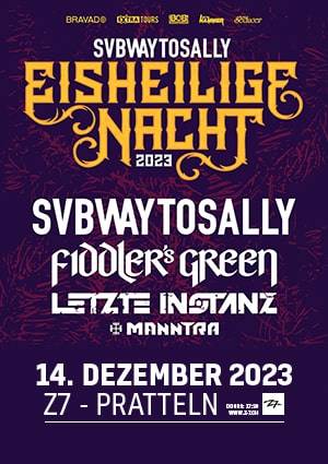 Am 14. Dezember laden SUBWAY TO SALLY zur Eisheiligen Nacht. Die Eisheilige Nacht 2023 wird mit einem Ensemble der Allstars der vergangenen 12 Festivals glänzen, denn neben Subway To Sally werden Fiddler’s Green und die Letzte Instanz aufspielen. Den Abend eröffnen die kroatischen Newcomer Manntra.