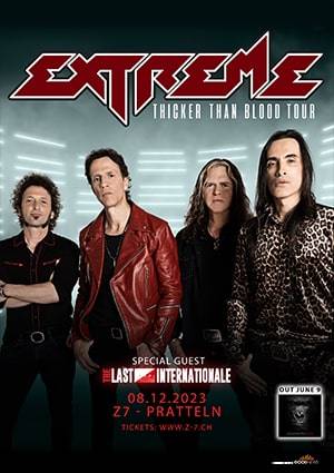 Neues Album, neue Tour und eine Band, die auf der Bühne noch nie so gut harmonierte. Die Multi-Platinum-Rocker Extreme kommen nach sechs Jahren mit ihrem sechsten Longplayer zurück nach Pratteln. Mit den Songs von „Six“ (Album-Release am 9. Juni 2023) und zahlreichen Klassikern stehen Gary Cherone (Gesang), Nuno Bettencourt (Gitarre), Pat Badger (Bass) und Kevin Figueiredo (Schlagzeug) am 8. Dezember auf der Bühne des Z7.