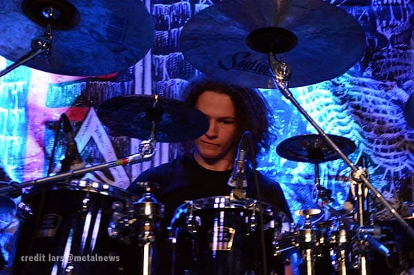 Kurz nachdem ich meine Freunde begrüsst habe und von Lars die Kamera in die Hand gedrückt bekam, ging es auch schon los mit dem Intro. Die viel zu heisse und viel zu leere kleine Halle wird von einer regelrechten Gewitterwand aus Death Metal überrollt!