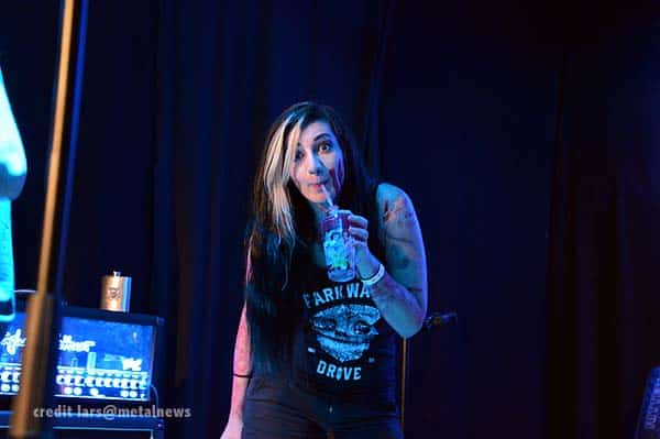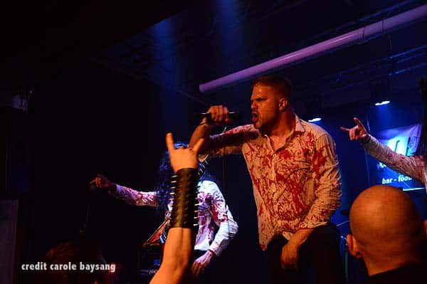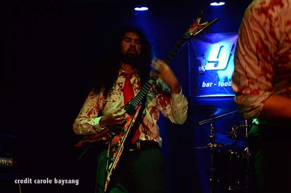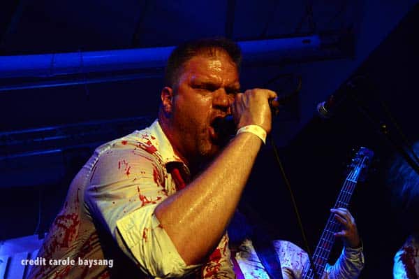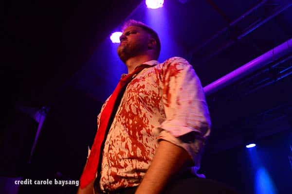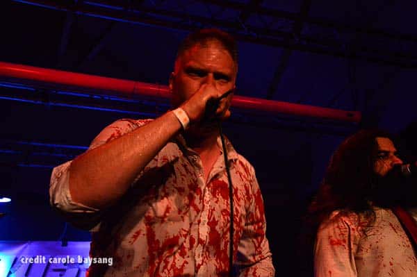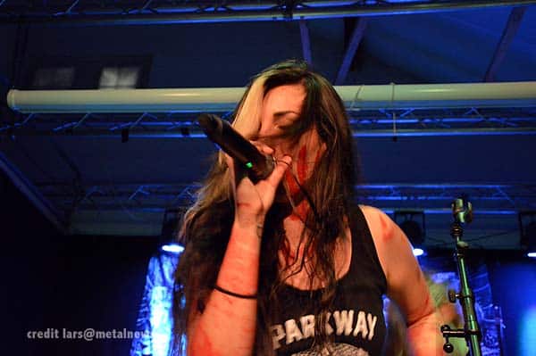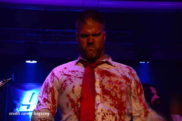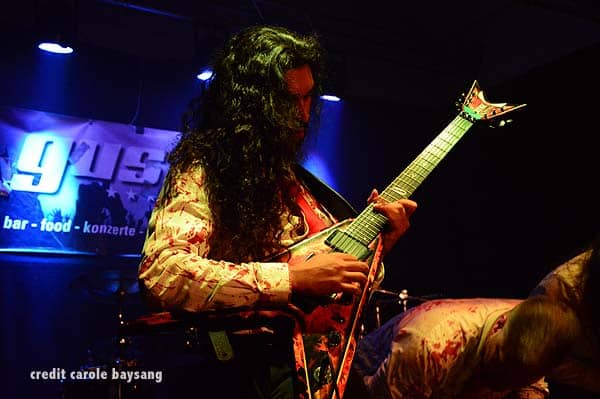 Der Sound ist perfekt und die Musiker machen mit ihren mit Blut befleckten Hemden und roten Krawatten so richtig Eindruck. Man könnte meinen, Geschäftsmänner hätten dem Schlachthaus einen Besuch abgestattet. Frontmann Beni weiss seine Stimme einzusetzen und lässt einwandfreie Screams vom Stapel. Bei zwei Songs wird ein Gründungsmitglied, welches jedoch nicht mehr aktiv ist, auf die Bühne gerufen und unterstütz die Band an der Gitarre. Da legt er so ganz neben bei mal perfekte Gitarrensoli hin. Das Publikum würdigt ihn mit Gejubel und Geklatsche. Raphael, so heisst er, kriegt das Grinsen nicht mehr aus dem Gesicht.