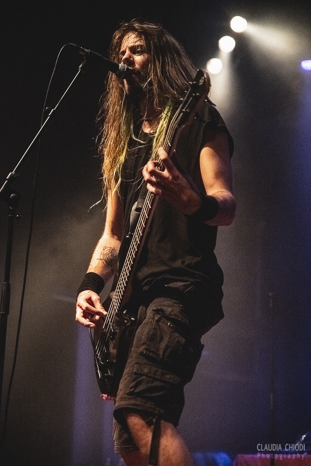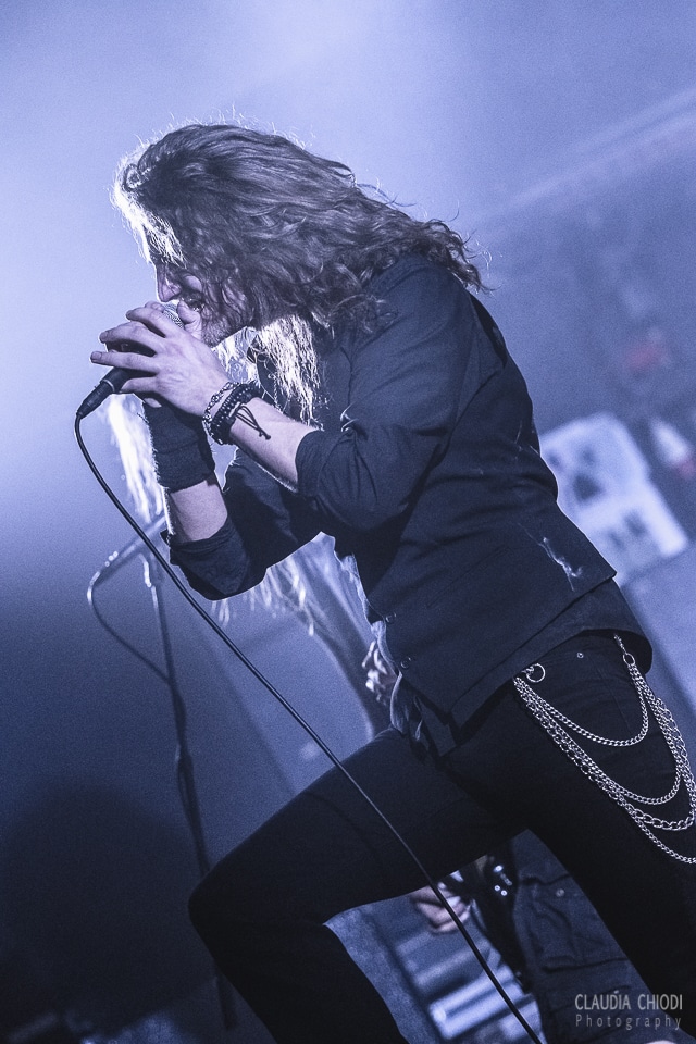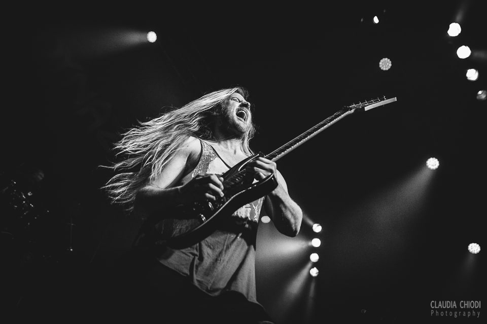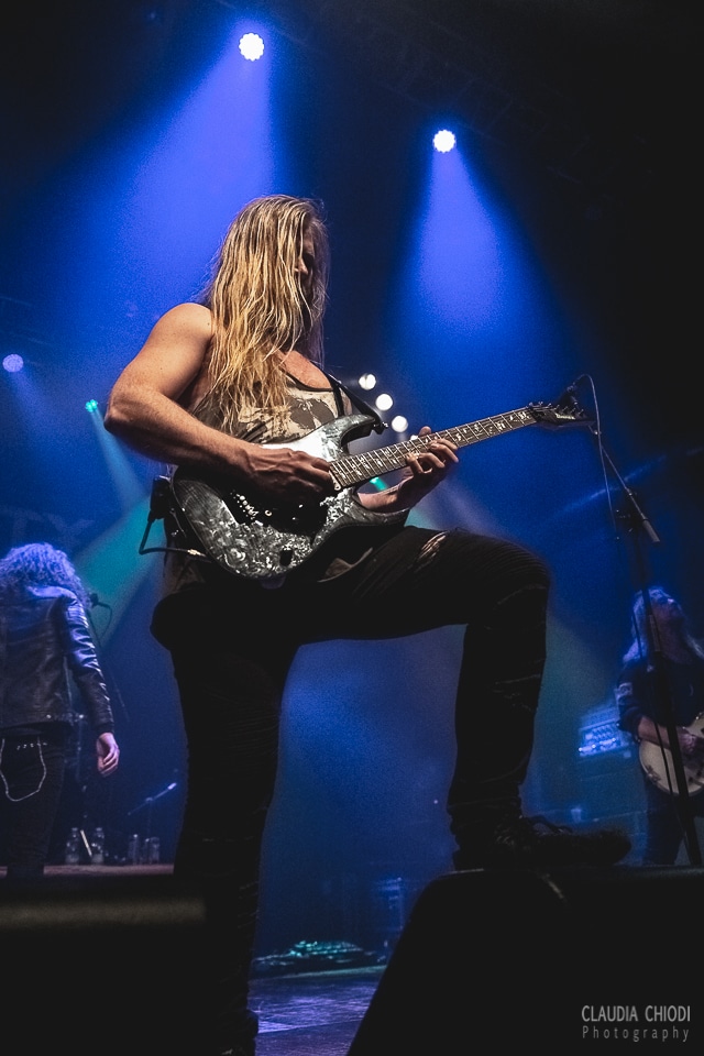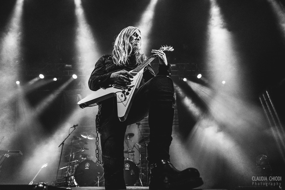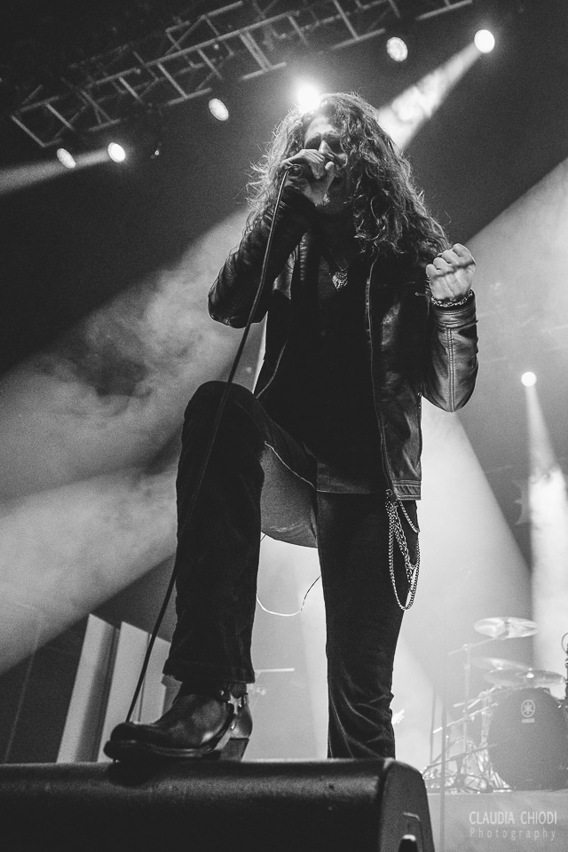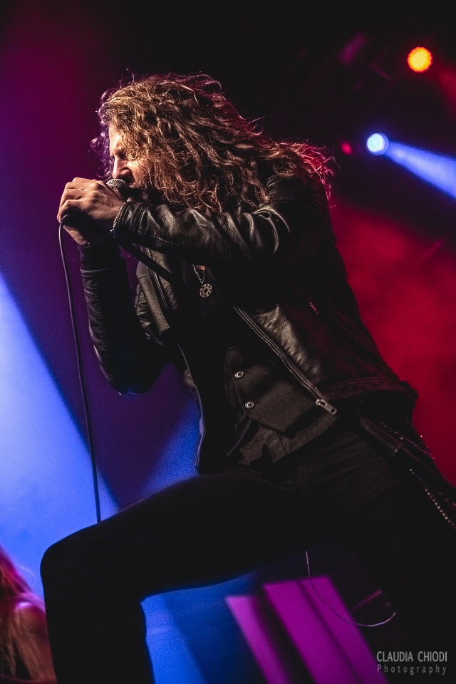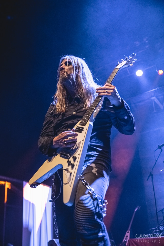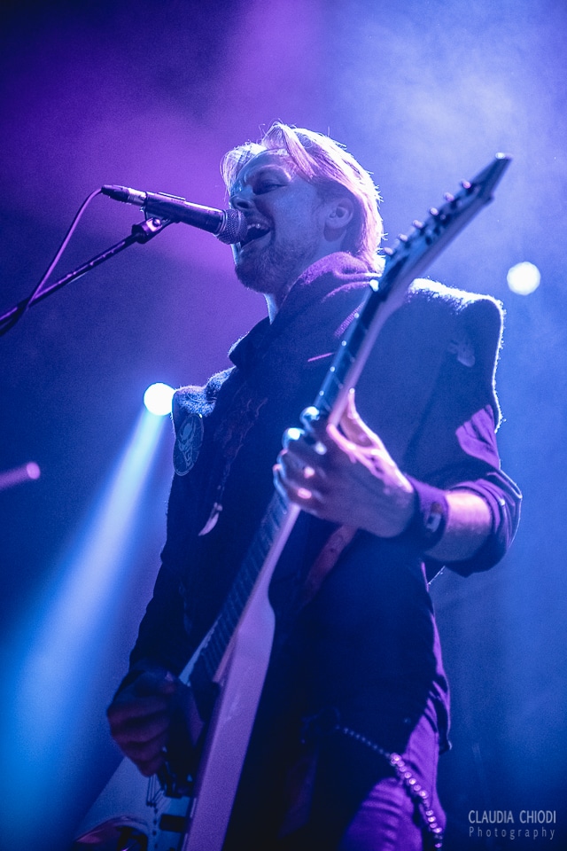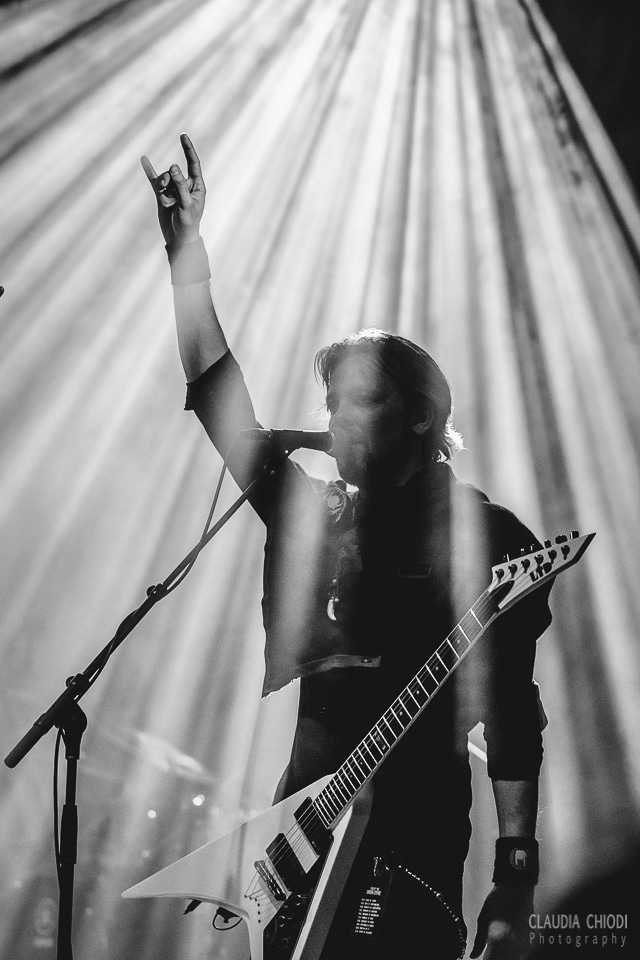 Die Göteborger bieten mit Gesichtsbemahlung zwar einen leicht martialischen Anblick, musikalisch finden wir uns aber im Bereich Power/Heavy Metal wieder, angereichert hie und da mit etwas raueren Klängen. Während drei der Band auch immer wieder sehr grimmig aus der Wäsche kucken, ist Basser Kenny Boufadene offenbar der Spaßvogel der Truppe und Grimassen nicht abgeneigt. Die Setliste ist gut gewählt, mit drei Alben auf dem Markt hat man etwas an Auswahl zu bieten und das zeigen sie auch. Nach knapp 40 min beenden sie ihren Auftritt mit Irresistible, dem Song, welcher mir auch nach einer Woche noch fester im Ohr hängt, als Sänger Samuel in seiner Zwangsjacke steckt. Mit wenigen Mitteln, ein Spot im Riser, die „Pandaaugen“ und natürlich die eigene Präsenz, hat das Quartett eine Performance abgeliefert, welche sowohl auf grossen als auch kleinen Bühnen Wirkung entfaltet.
