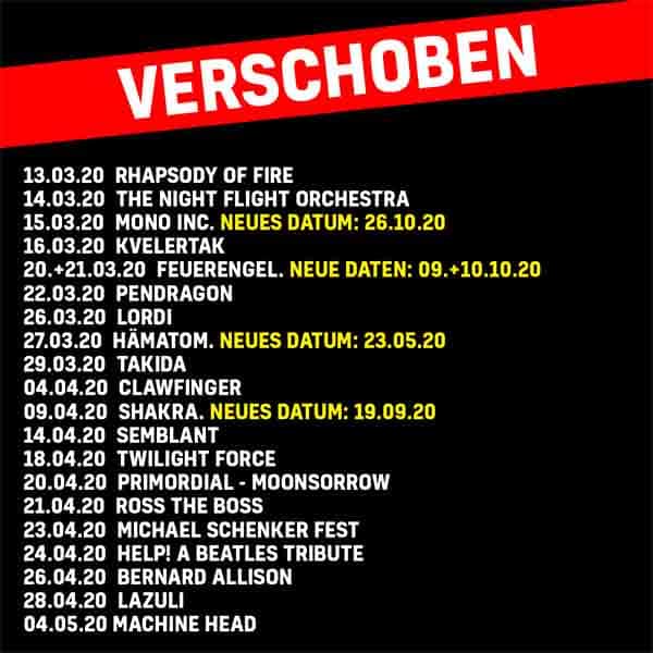 | Heute wurde beschlossen, alle Konzerte mit mehr als 100 Personen bis Ende April landesweit zu verbieten. Dies betrifft ausnahmslos alle der im Z7 stattfindenen Konzerte im genannten Zeitraum. Wir bemühen uns sehr, für alle betroffenen Konzerte einen Ersatztermin zu finden. Diese Abklärungen benötigen aber etwas Zeit und daher bitten wir euch alle um Verständnis und Geduld. Wir halten euch über unsere Webseite (www.z-7.ch), unsere Facebook-Seite und Newsletter stetig auf dem Laufenden und berichten euch umgehend, wenn z.B. Ersatzdaten gefunden werden. Alle bereits gekauften Tickets behalten vorerst ihre Gültigkeit für die Nachholkonzerte.Uns bleibt nur noch zu sagen: Wir hätten mit euch allen in den nächsten Wochen nur zu gerne ganz viele, tolle Konzerte erlebt! Viel viel viel wichtiger ist uns aber, dass ihr gesund und munter bleibt, auf euch aufpasst und keine unnötigen Risiken eingeht! Konzerte kann man – und werden wir – nachholen!! Bis dahin, rockt euer zu Hause |