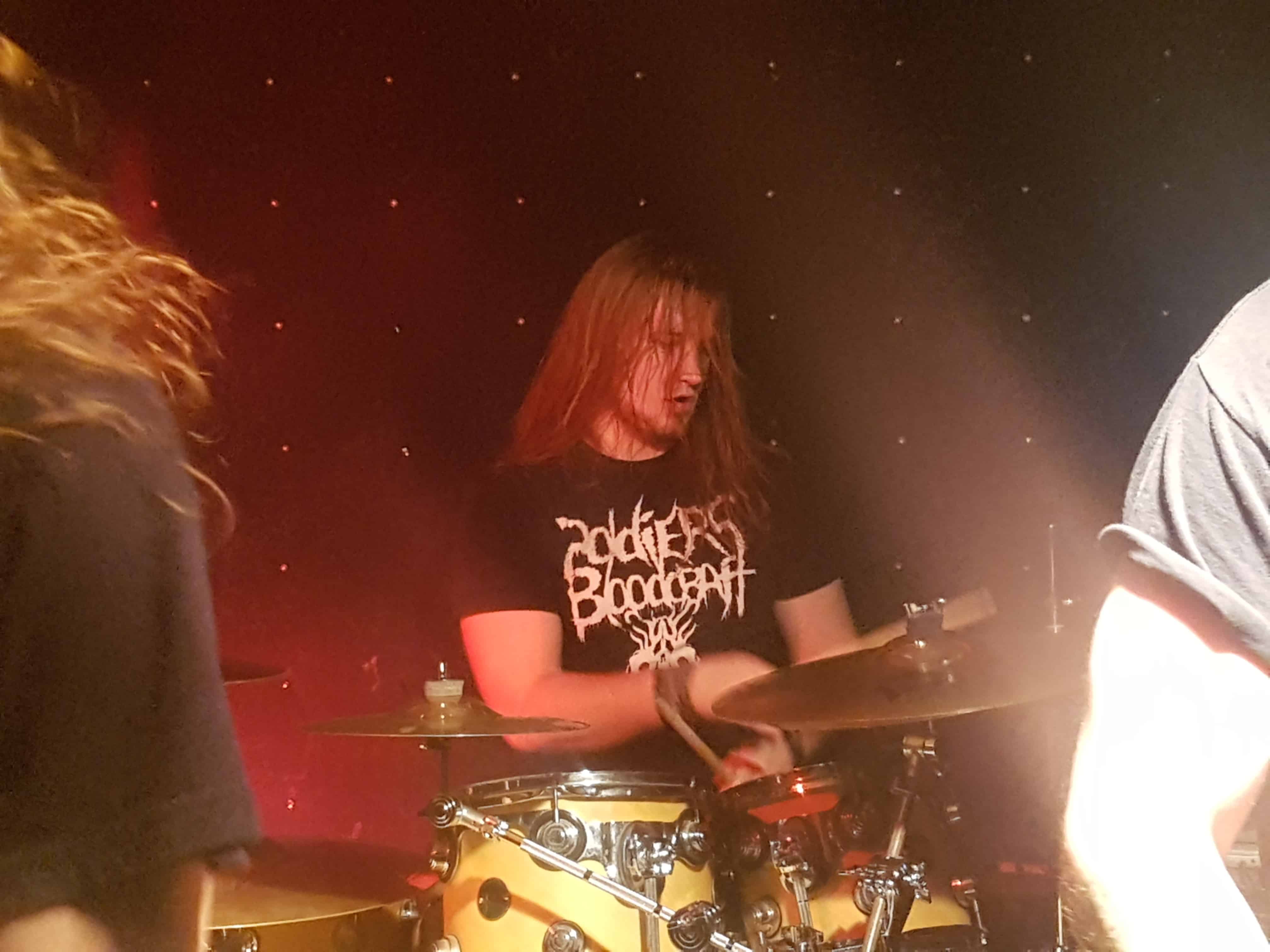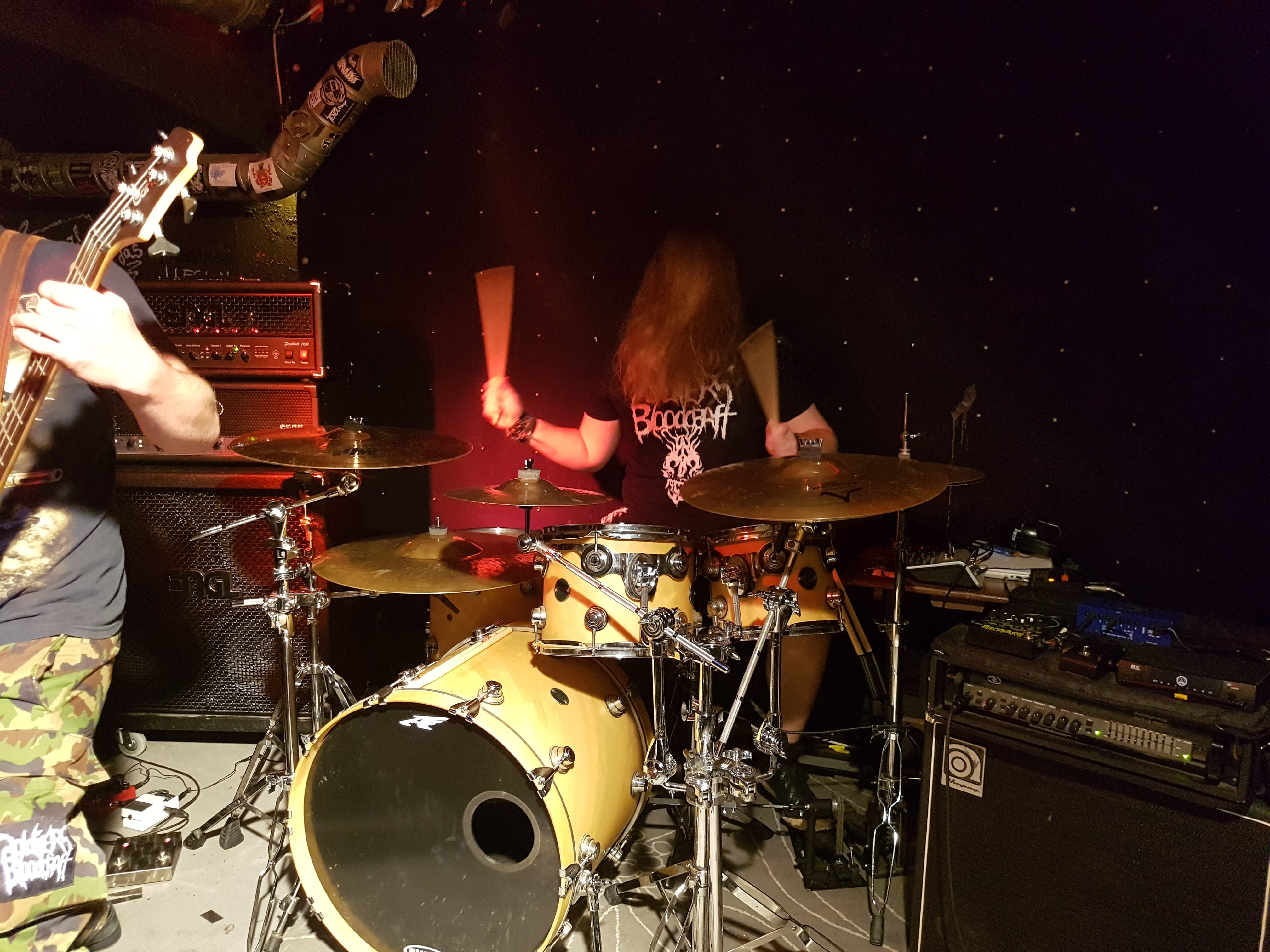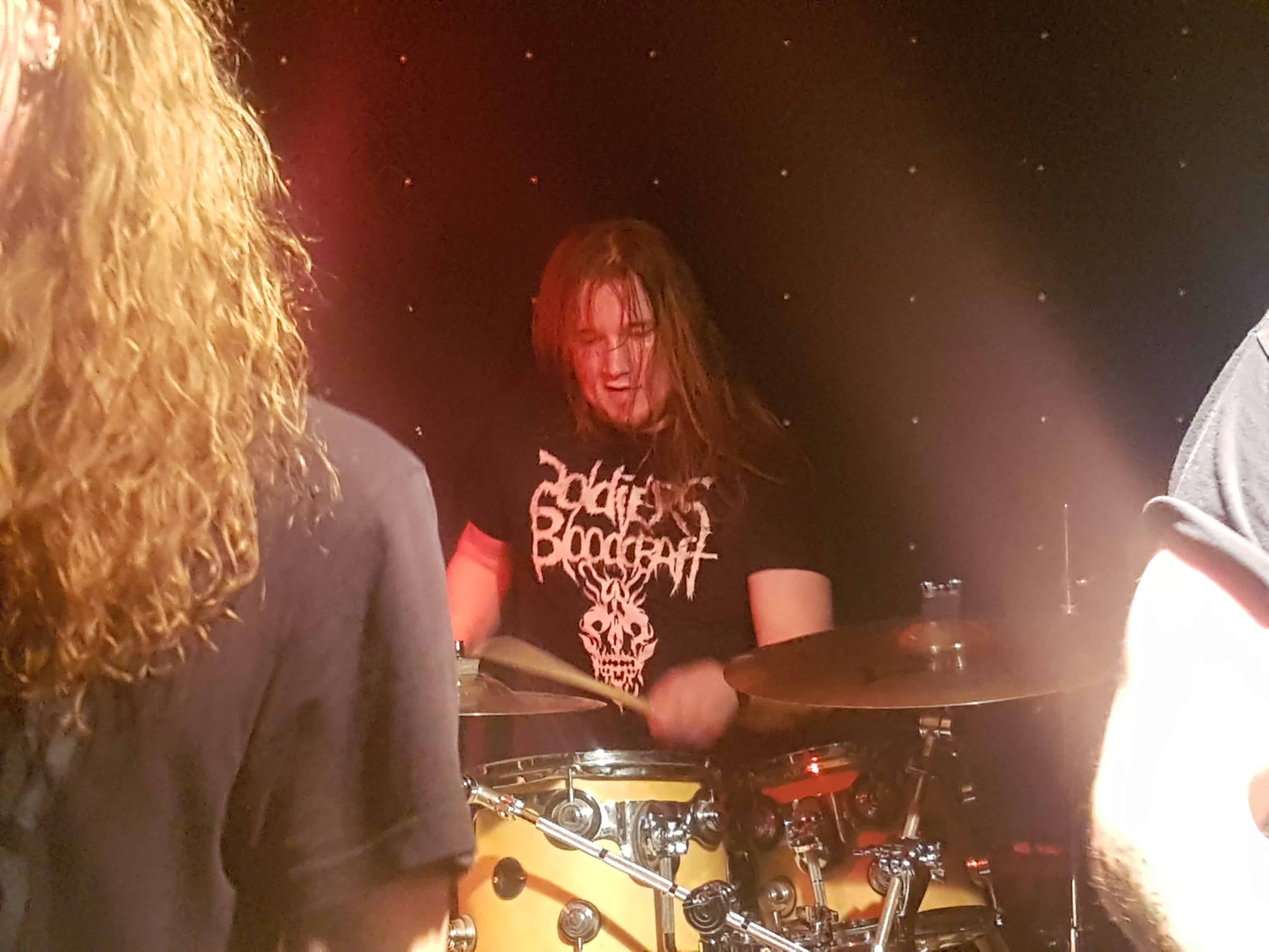 Schnell merkte man dass der Drummer Erebos ein Naturtalent sein muss. Früher immer Gitarre und Gesang und diesmal Drummer. Zwischendurch bei seinem Gesichtsausdruck, konnte man vernehmen, dass er wohl insbrünstig an seine Gitarre denkt. Trotzdem machte er einen gewaltigen Job. Auch der Sänger Tobias war klasse. Er hatt eine Brachiale Stimme, die schon an Bands im Brutal Death Metal Genre errinnern.