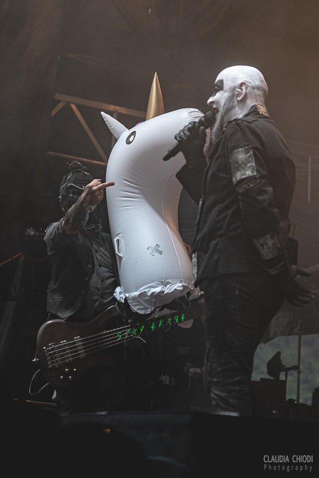 Während des Auftritts versuchten Fans ein Einhorn auf die Bühne zu bringen, welches aber im Fotograben landete – unsere Fotografin Claudia mit einem Herz für Einhörner – gab diesem dann den nötigen Schubs um es dennoch auf die Bühne zu schaffen. Der Bassist schien ebenfalls ein Einhorn Fan zu sein. So trug er dieses auf der Bühne umher und machte sich einen Spass daraus den Sänger damit zu ärgern, bevor er es wieder zum crowdsurfing ins Publikum entliess. Leider mussten HÄMATOM wegen des nahenden Unwetters ihren Auftritt frühzeitig abbrechen und so suchten auch wir den sicheren Pressebereich auf.