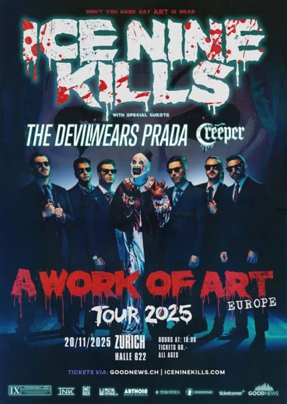 Outfits, Masken, Waffen und nachgespielten Filmszenen: Die Horrorcore-Meister ICE NINE KILLS kehren mit ihrer Work Of Art Tour 2025 zurück in die Schweiz und verwandeln die Halle 622 in Zürich am 20. November 2025 in ein düsteres Spektakel. Mit dabei: die Metalcore-Giganten THE DEVIL WEARS PRADA und die Gothic-Rocker CREEPER als Special Guests. Ein Abend voller Schrecken, Energie und brachialer Live-Action – nichts für schwache Nerven!