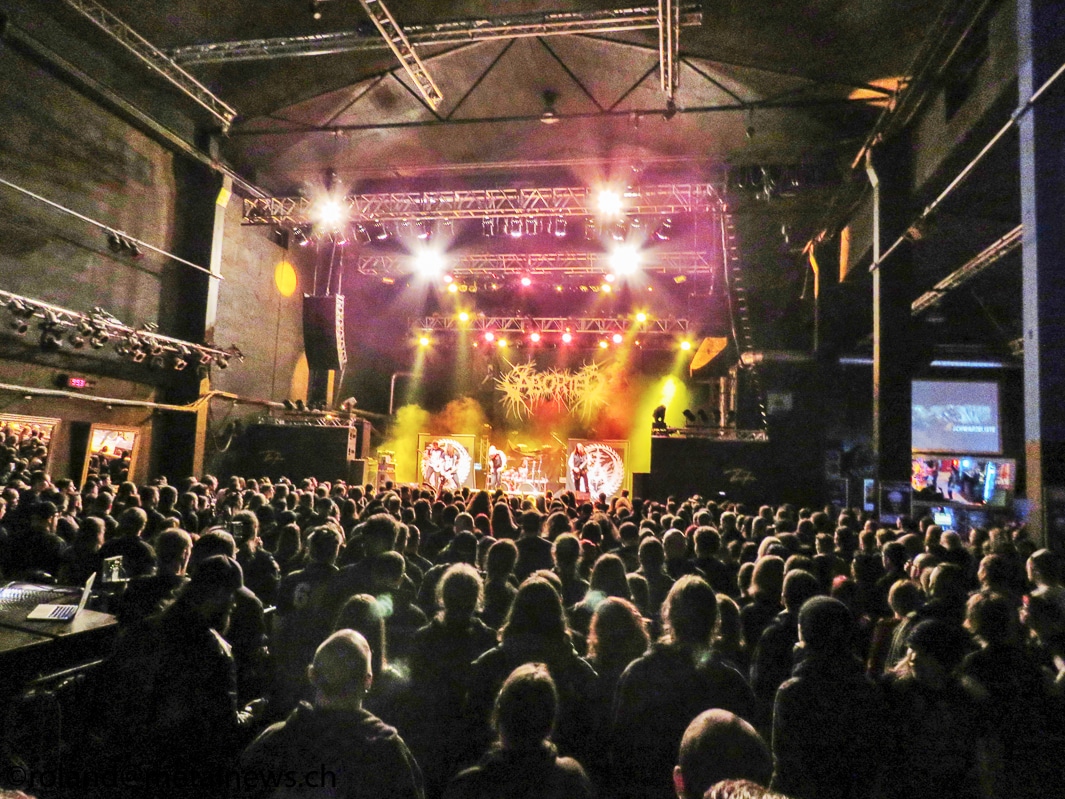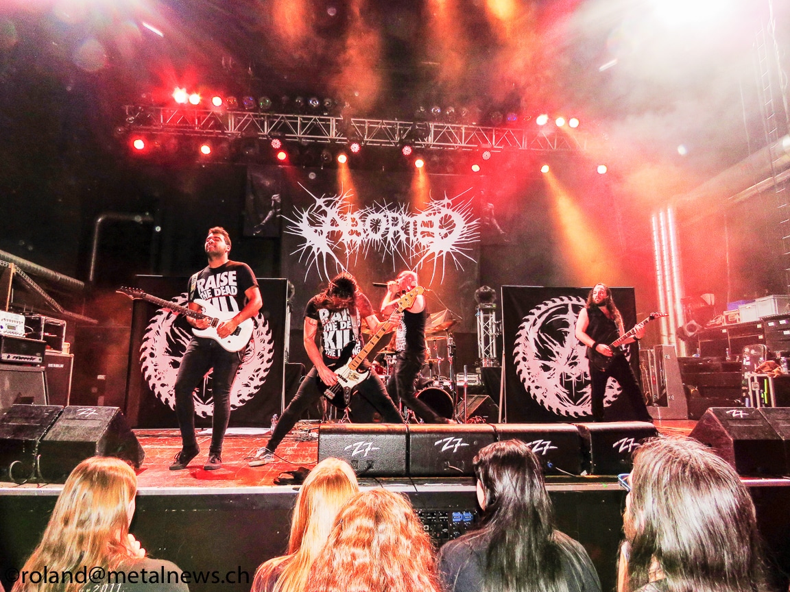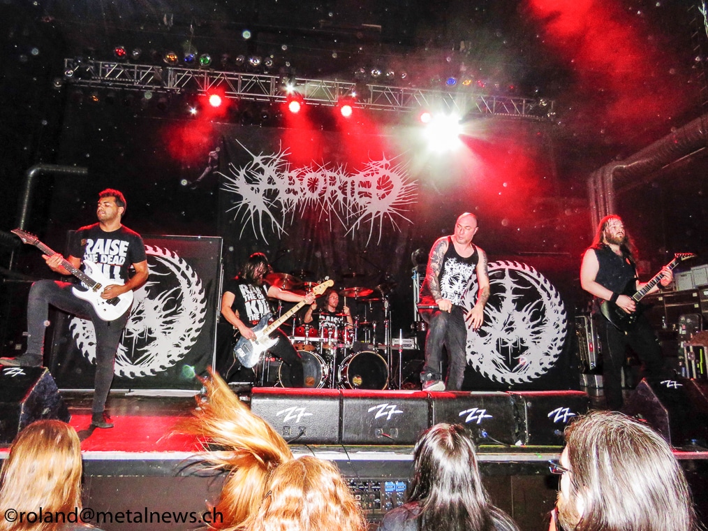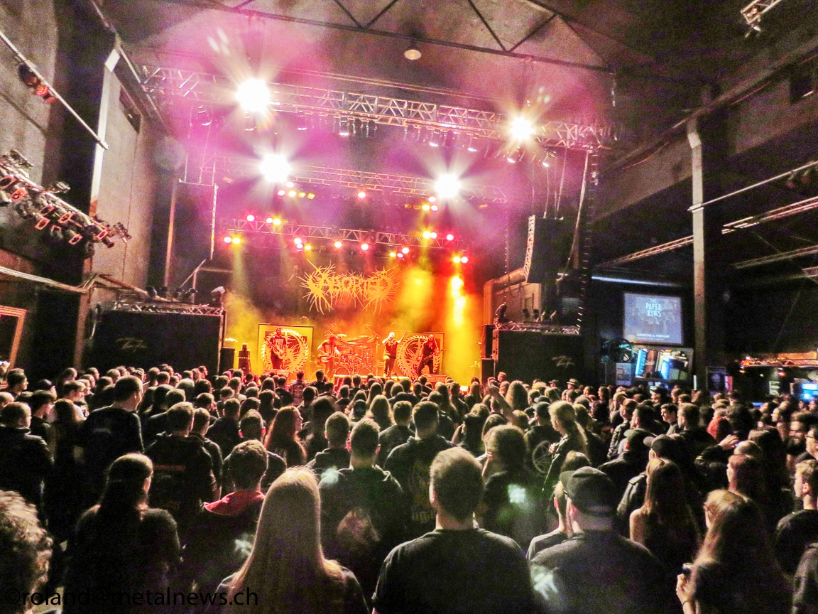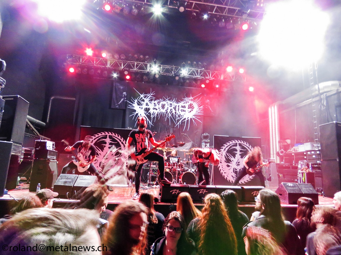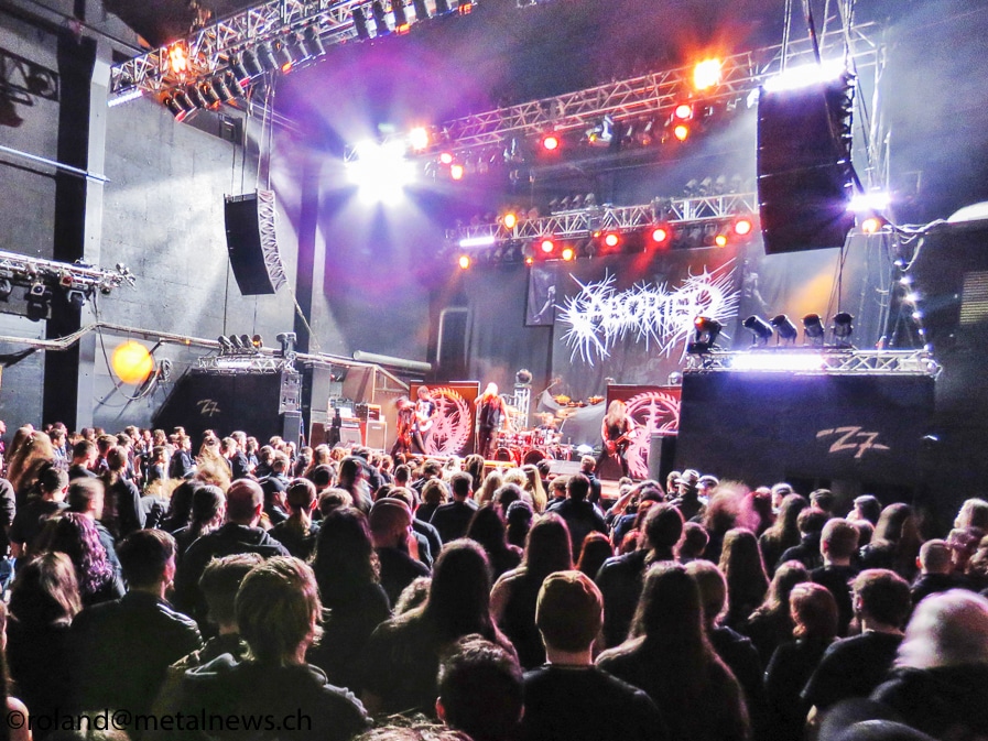 Schon nach wenigen Minuten entdecke ich ein paar bekannte Gesichter, das Z7 ist eben schon DER Treffpunkt für die schweizerische Metalszene und die ist ja nicht so immens gross. Nachdem ich mit diesen Freunden ein paar Worte gewechselt habe, beginnt auch schon die erste Band zu spielen, es ist dies die belgische Death Metal- und Grindcore-Band ABORTED. Die ersten drei Songs darf ich aus der ersten Reihe verfolgen, ein Privileg für akkredierte Fotografen. Auch dort entdecke ich ein mir bekanntes Gesicht. Zugegebenermassen spielt mir ABORTED zu Beginn zu schnell, ich gewöhne mich aber recht schnell daran. Nach den ersten drei Songs gehe ich hinter die Abschrankung vor der Bühne, bin danach also immer noch sehr nahe am Geschehen. Die aus fünf Mitgliedern bestehende Band macht ordentlich Stimmung, gegen Ende des Konzerts, genauer gesagt beim Song „Sanguine Verses (…Of Extirpation)“, bildet sich sogar eine Wall of Death und ich stehe direkt daneben. Ausschnitte von diesem ABORTED-Gig kann man sich übrigens auf meinem Youtube-Channel „JudR666“ anschauen, die Songs „Sanguine Verses (…Of Extirpation)“ sowie „The Saw And The Carnage Done“ habe ich nämlich in voller Länge gefilmt und hochgeladen.