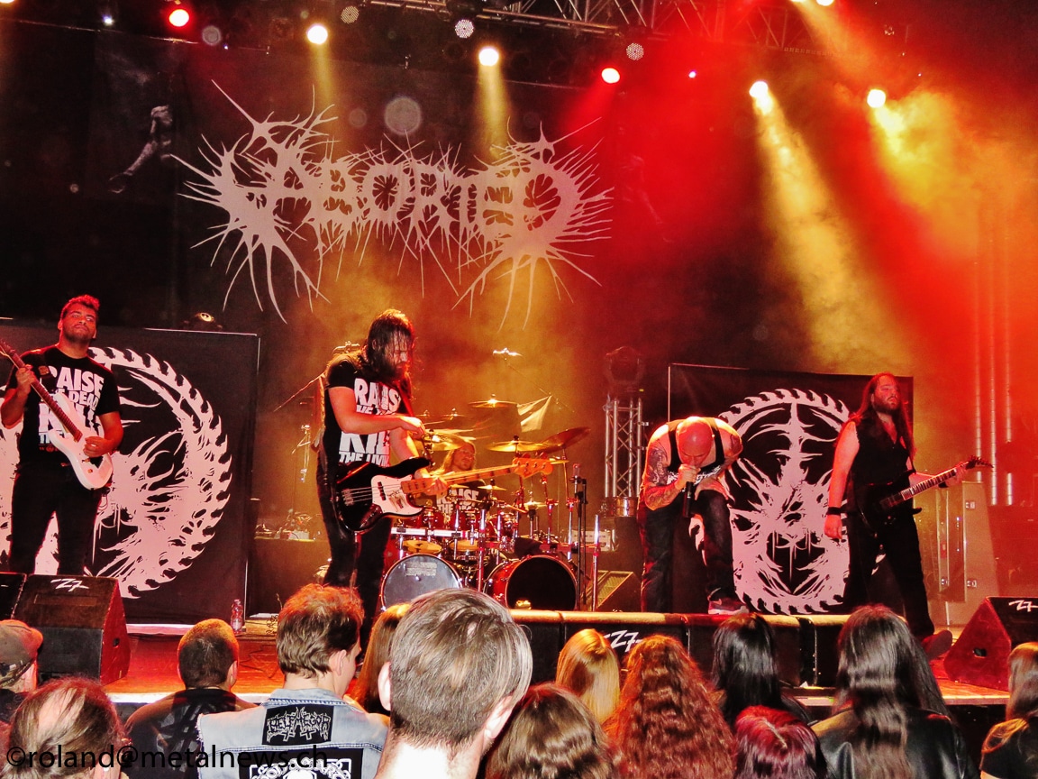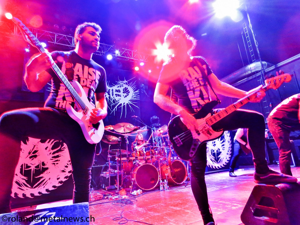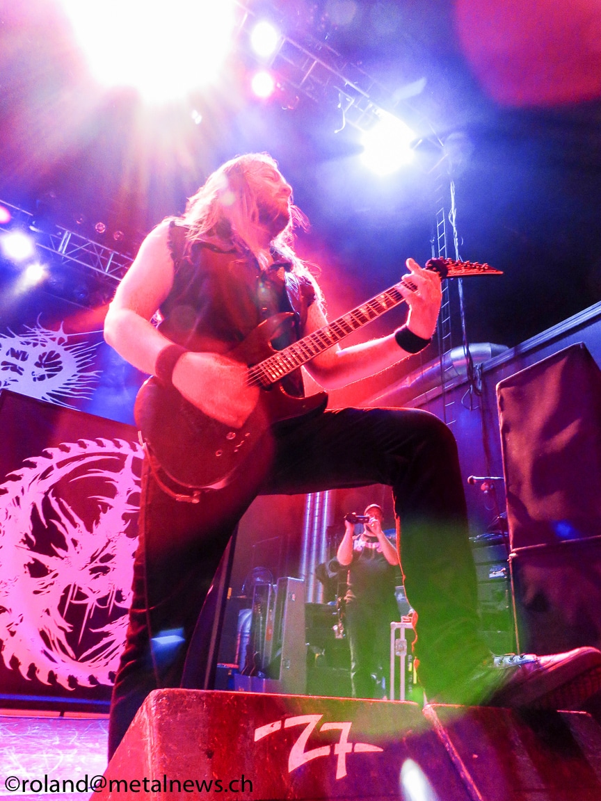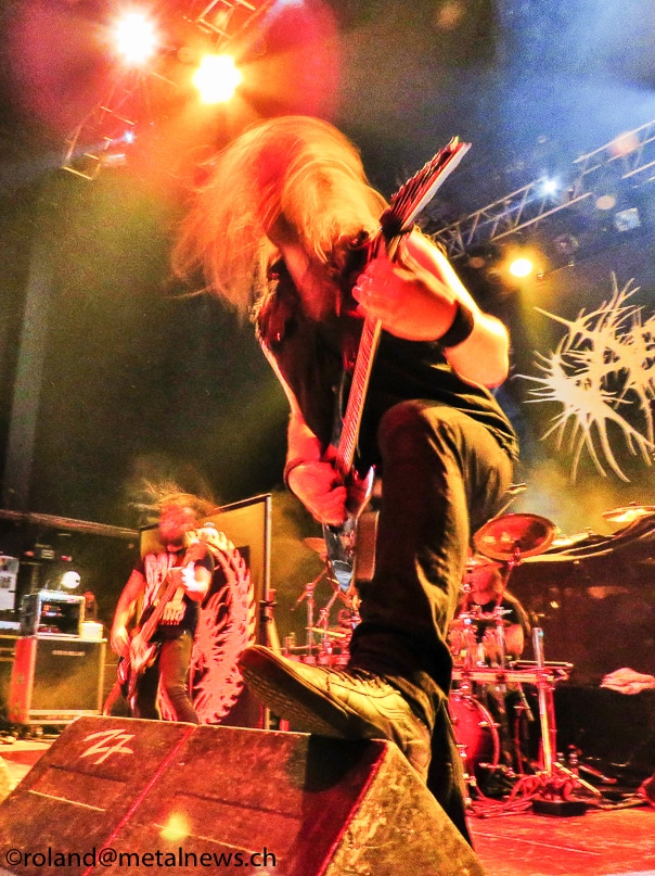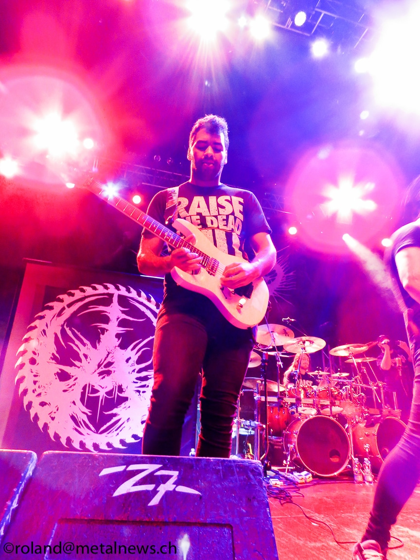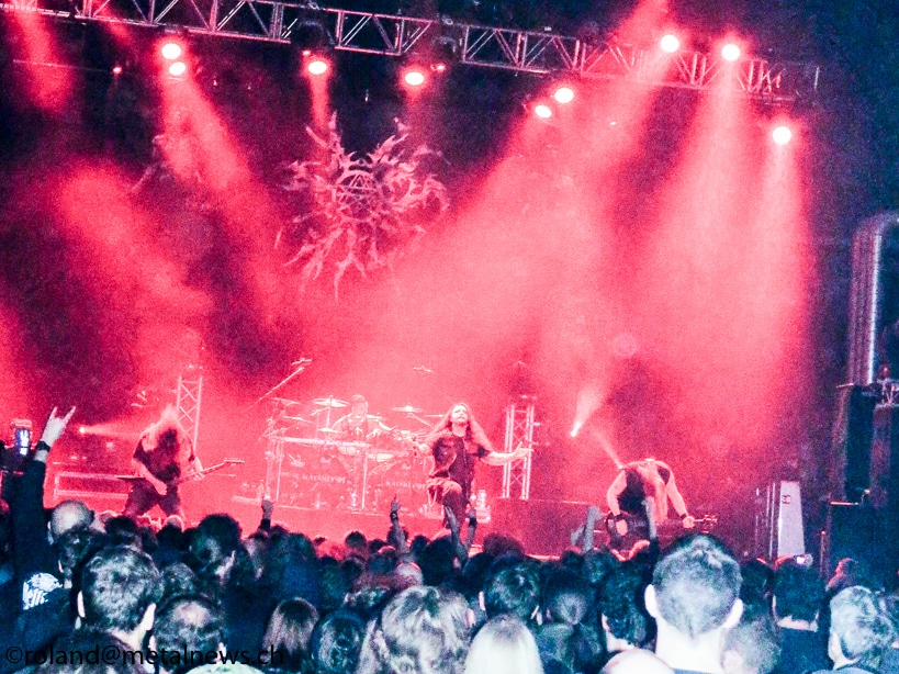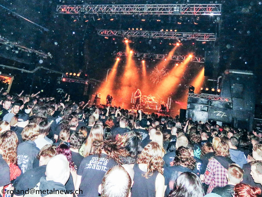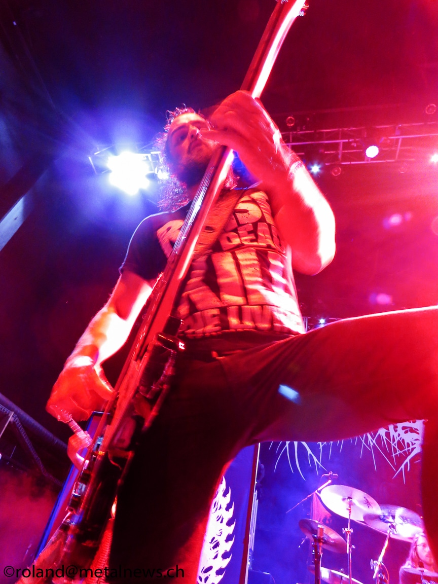 Schon nach wenigen Minuten entdecke ich ein paar bekannte Gesichter, das Z7 ist eben schon DER Treffpunkt für die schweizerische Metalszene und die ist ja nicht so immens gross. Nachdem ich mit diesen Freunden ein paar Worte gewechselt habe, beginnt auch schon die erste Band zu spielen, es ist dies die belgische Death Metal- und Grindcore-Band ABORTED. Die ersten drei Songs darf ich aus der ersten Reihe verfolgen, ein Privileg für akkredierte Fotografen. Auch dort entdecke ich ein mir bekanntes Gesicht. Zugegebenermassen spielt mir ABORTED zu Beginn zu schnell, ich gewöhne mich aber recht schnell daran. Nach den ersten drei Songs gehe ich hinter die Abschrankung vor der Bühne, bin danach also immer noch sehr nahe am Geschehen. Die aus fünf Mitgliedern bestehende Band macht ordentlich Stimmung, gegen Ende des Konzerts, genauer gesagt beim Song „Sanguine Verses (…Of Extirpation)“, bildet sich sogar eine Wall of Death und ich stehe direkt daneben. Ausschnitte von diesem ABORTED-Gig kann man sich übrigens auf meinem Youtube-Channel „JudR666“ anschauen, die Songs „Sanguine Verses (…Of Extirpation)“ sowie „The Saw And The Carnage Done“ habe ich nämlich in voller Länge gefilmt und hochgeladen.