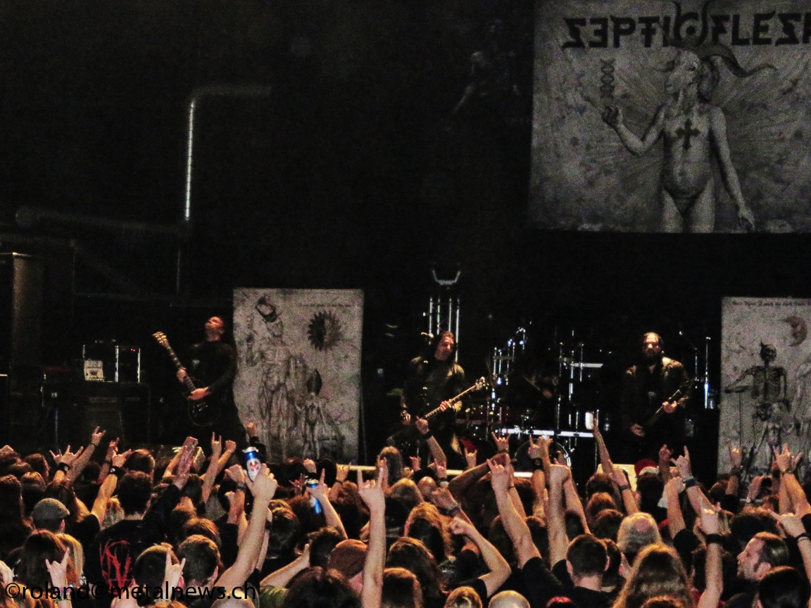 In der Pause vor der zweiten Supportband gehe ich draussen zuerst mal eine rauchen und unterhalte mich weiter mit meinen Freunden. Danach gehe ich wieder in die Halle und in die erste Reihe. Wieder für drei Songs, schade dass es nicht mehr sein dürfen. Auf der Bühne performen nun die Symphonic Death Metaller SEPTICFLESH aus Athen. Definitiv mehr mein Sound als ABORTED, technischer Death Metal vermischt mit atmosphärischen Gothic Metal-Elementen kommt bei mir einfach mehr an als Grindcore. Dem Publikum gefällt es auch, es herrscht gute Stimmung und man sieht einige Metaller headbangen. Nach den ersten drei Songs gehe ich zur Bar und treffe dort auf die drei ebenfalls akkreditierten Fotografen. Wir unterhalten uns ein paar Minuten lang und trinken kurz was zusammen. Danach gehe ich wieder an die Arbeit und fotografiere weiter. Kurz bevor SEPTICFLESH ihren letzten Song performen schalte ich die Videofunktion bei meiner Kamera ein und filme den letzten Song. Dieser nennt sich „Prometheus“ und kann ebenfalls auf meinem Yotube-Channel betrachtet werden.