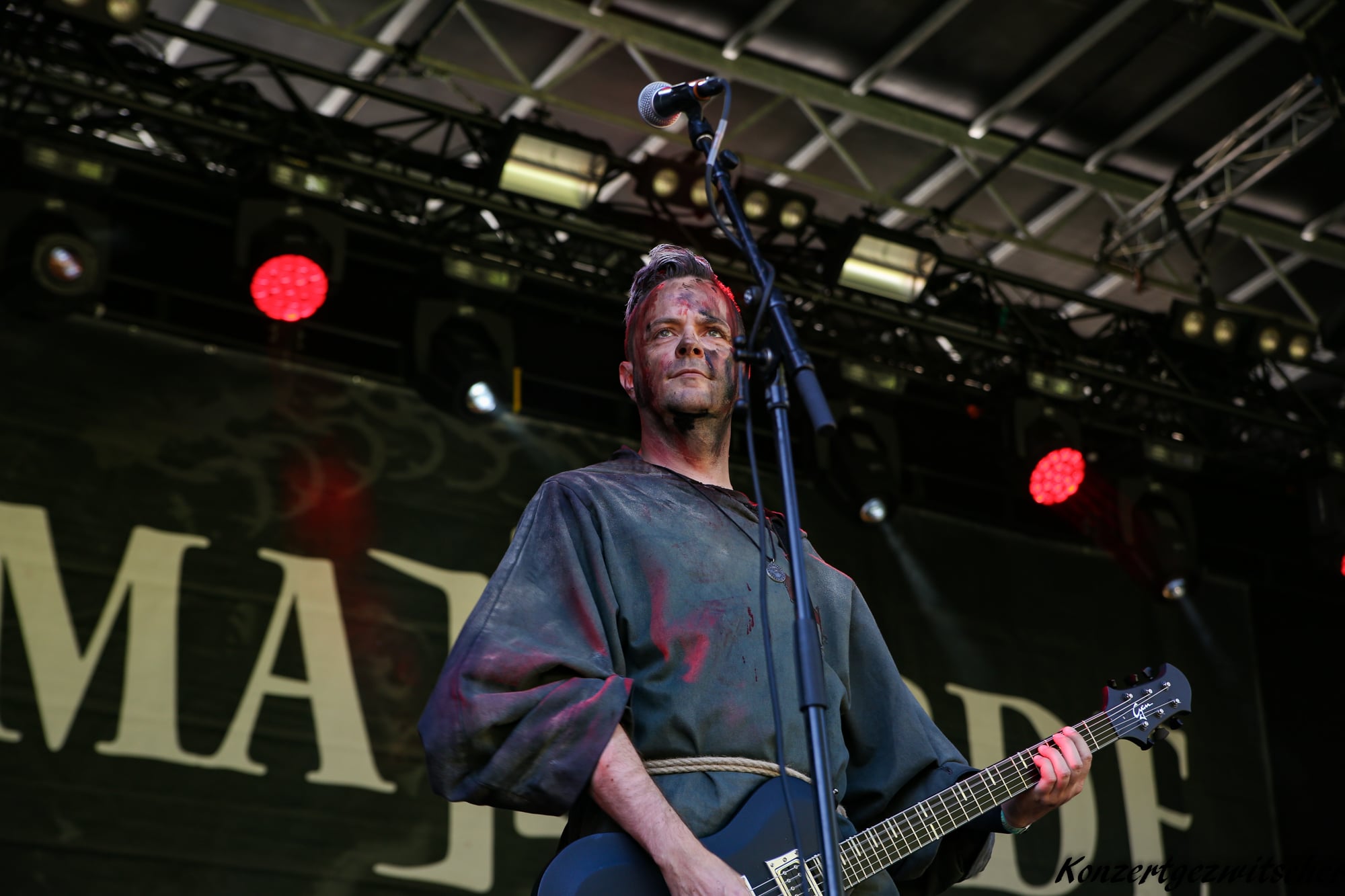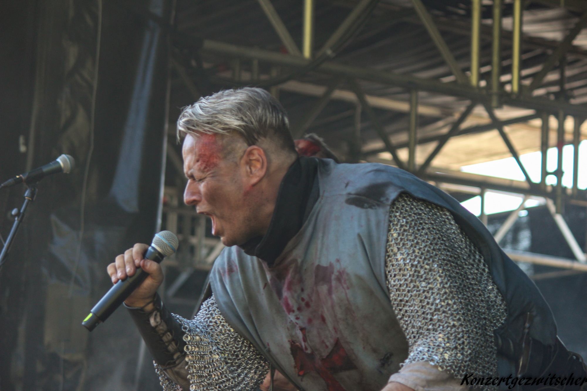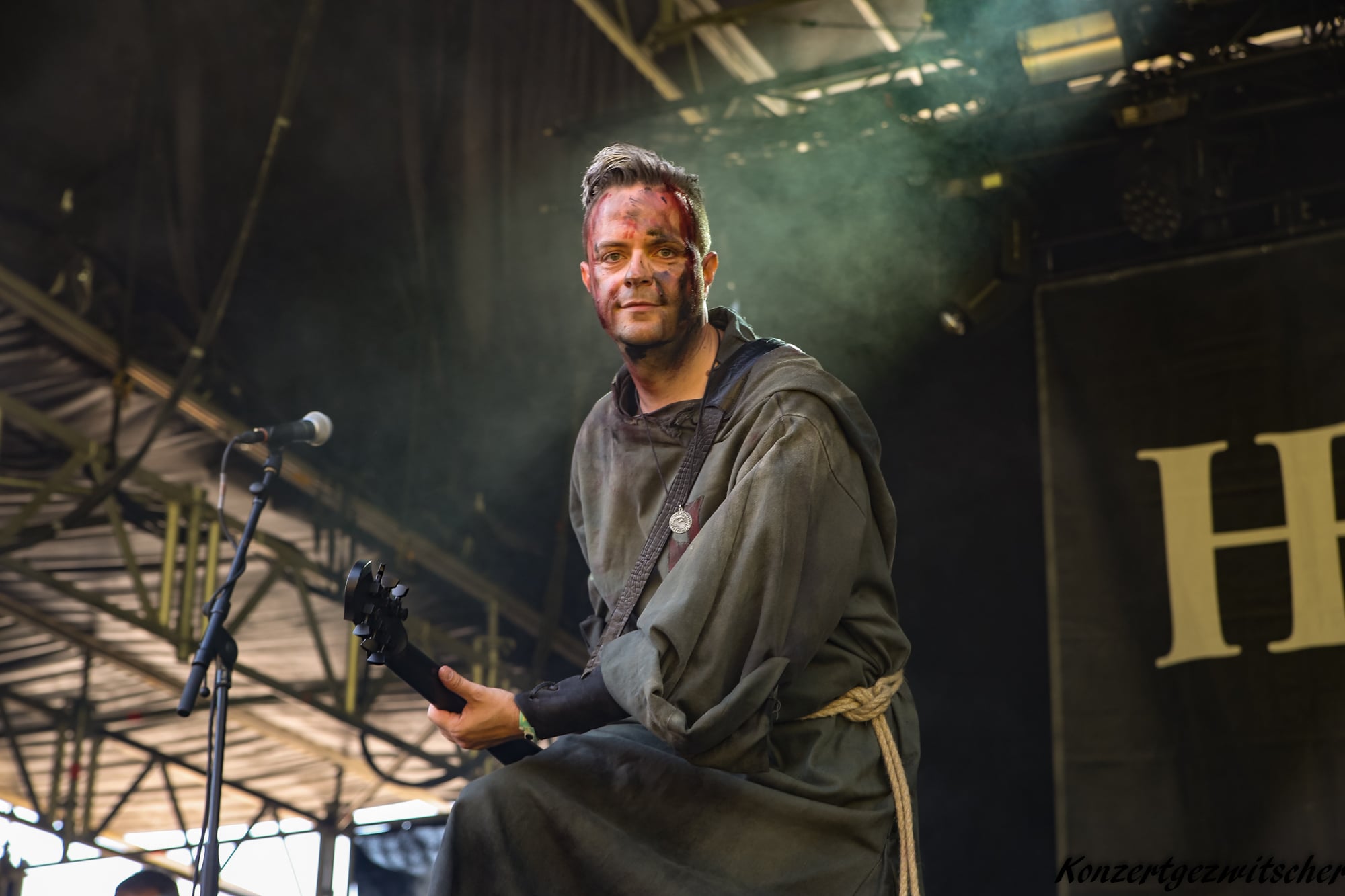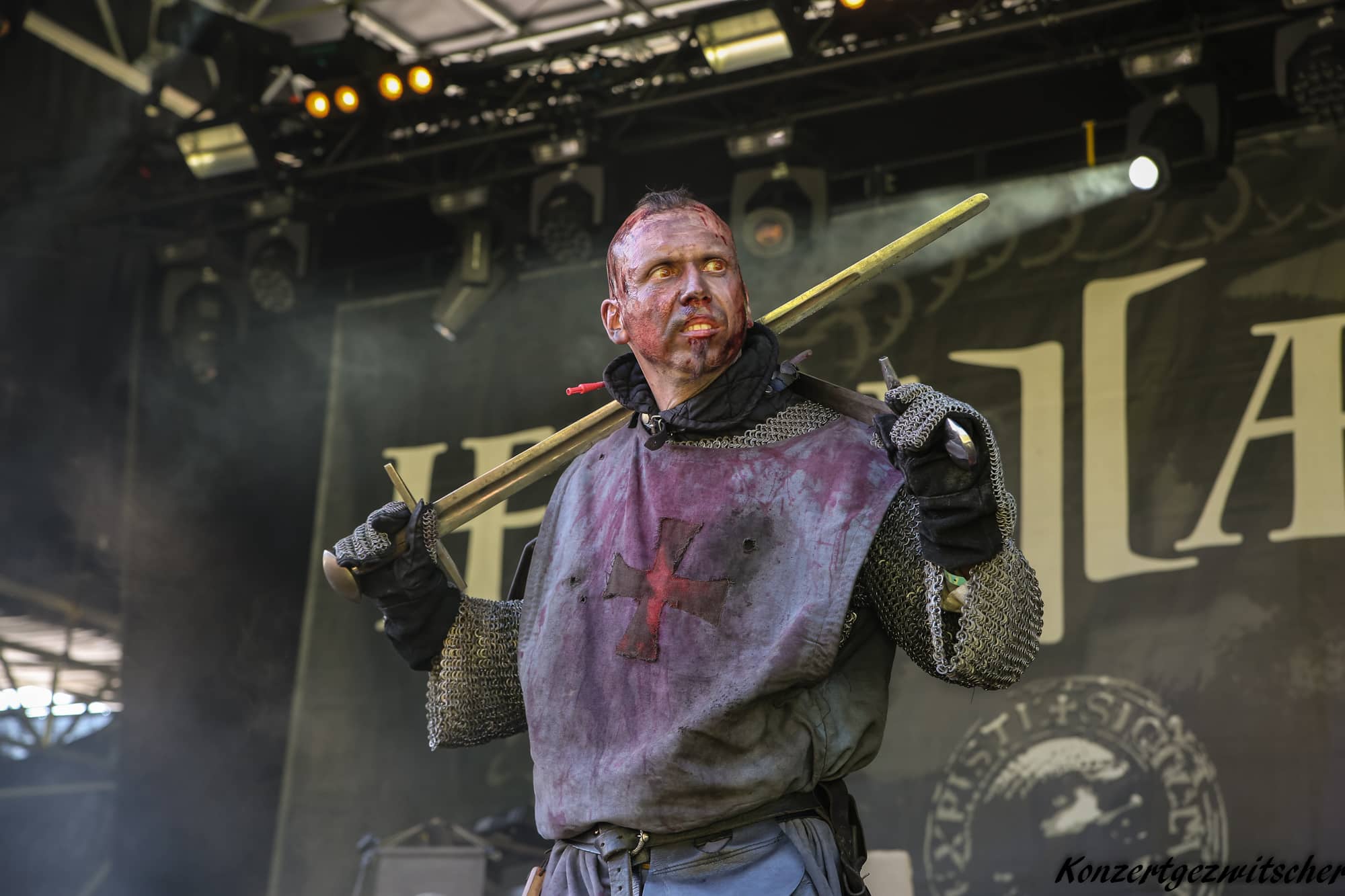 Mit der HEIMATAERDE halten am Freitag bereits die Templer Einzug in der Schweiz: Zum feierlichen Intro des aktuellen Album „Aerdenbrand“, dessen titelgebenden Song die untoten Tempelritter um Ashlar von Megalon bereits als erste Nummer spielen, zieht die illustre Ordensgemeinschaft Einzug auf der (wie passend) Mönch Stage Einzug. Es folgt eine optisch wie musikalisch aufwendige Show, die der kurzen Spielzeit von HEIMATAERDE fast schon unangemessen ist – gerne hätte man den Templern länger gelauscht und zugesehen. Denn in der Hand hat das heilige Quintett die Schweizer schon nach wenigen Songs: Egal ob bei Liedern dem düsteren ‚Folge Mir‘ wie der Bandhymne ‚Heimataerde‘, die das Publikum bald schon begeistert mitsingt – HEIMATAERDE beweist, dass man auch bei schwüler Sommerhitze in Gewandung, blutverschmiert und in schweren Kettenhemden eine energiegeladene und fast schon ausgelassene Party (so besinnt man sich auf der Bühne bisweilen dem Ruf „als Scooter der Schwarzen Szene“ zu gelten) zu feiern. Apropos mitsingt: Mein „Was geht denn hier ab?“-Moment des GREENFIELD Festivals geht bereits am ersten Tag an HEIMATAERDE. So sind die Zuhörer vor der Bühne beim Refrain von ‚Hick Hack Hackebeil‘ („Hick Hack, Hick Hack, Hackebeil – du wirst vor Gott stehen / Hick Hack, Hick Hack, Hackebeil – ich will dich tot sehen“) beinahe erschreckend textsicher…