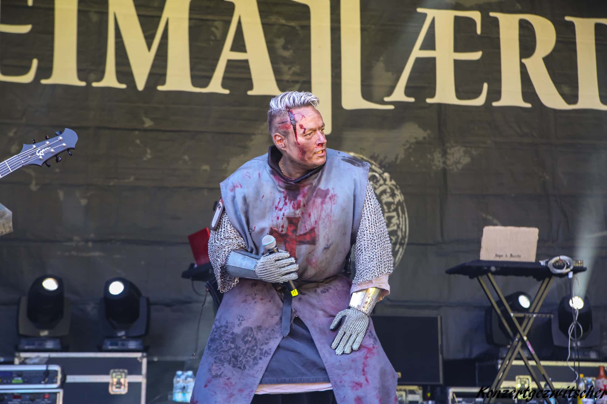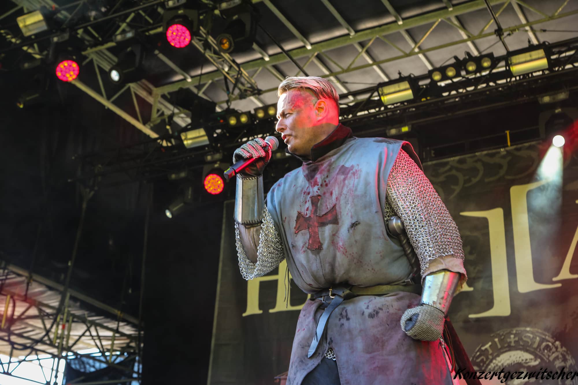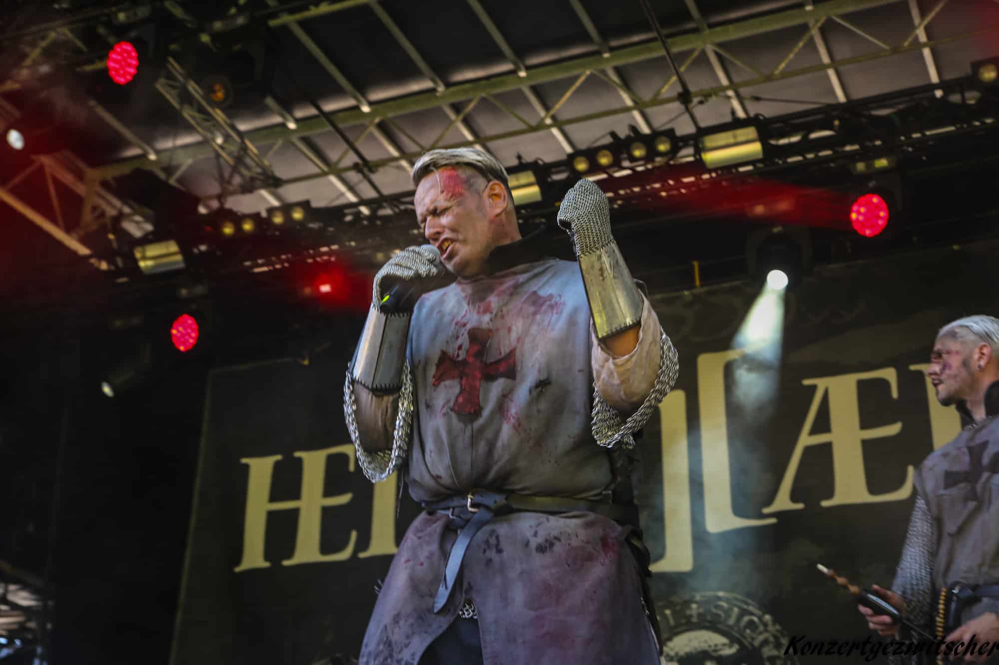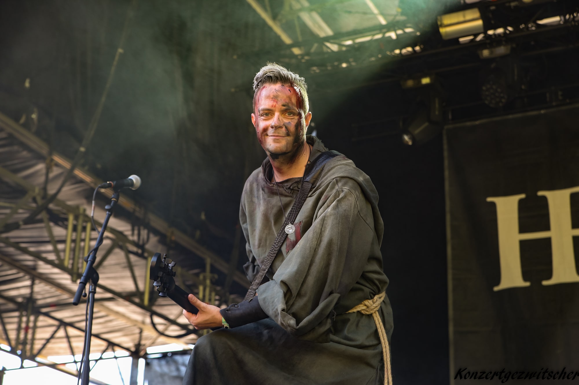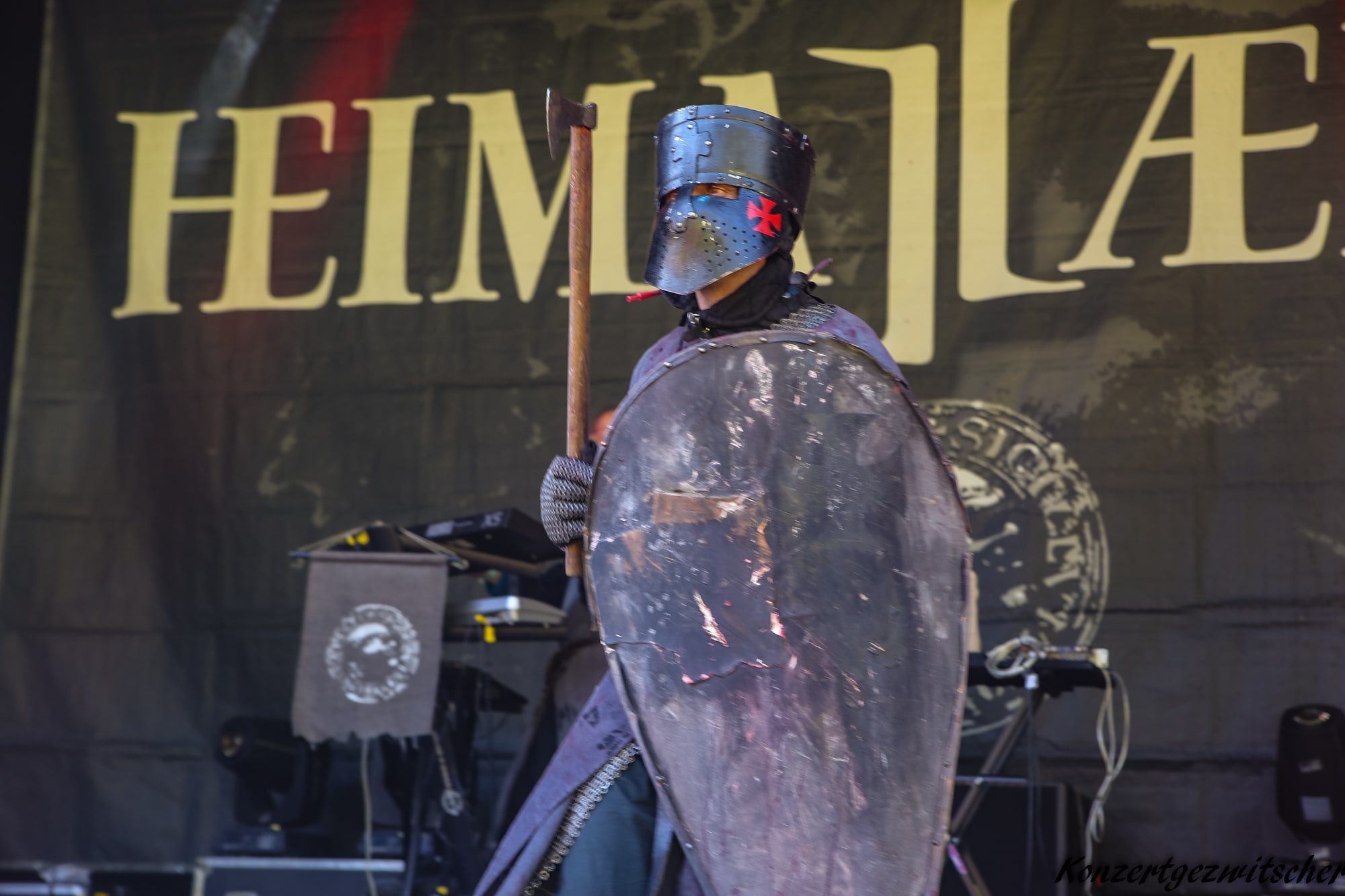 Mit der HEIMATAERDE halten am Freitag bereits die Templer Einzug in der Schweiz: Zum feierlichen Intro des aktuellen Album „Aerdenbrand“, dessen titelgebenden Song die untoten Tempelritter um Ashlar von Megalon bereits als erste Nummer spielen, zieht die illustre Ordensgemeinschaft Einzug auf der (wie passend) Mönch Stage Einzug. Es folgt eine optisch wie musikalisch aufwendige Show, die der kurzen Spielzeit von HEIMATAERDE fast schon unangemessen ist – gerne hätte man den Templern länger gelauscht und zugesehen. Denn in der Hand hat das heilige Quintett die Schweizer schon nach wenigen Songs: Egal ob bei Liedern dem düsteren ‚Folge Mir‘ wie der Bandhymne ‚Heimataerde‘, die das Publikum bald schon begeistert mitsingt – HEIMATAERDE beweist, dass man auch bei schwüler Sommerhitze in Gewandung, blutverschmiert und in schweren Kettenhemden eine energiegeladene und fast schon ausgelassene Party (so besinnt man sich auf der Bühne bisweilen dem Ruf „als Scooter der Schwarzen Szene“ zu gelten) zu feiern. Apropos mitsingt: Mein „Was geht denn hier ab?“-Moment des GREENFIELD Festivals geht bereits am ersten Tag an HEIMATAERDE. So sind die Zuhörer vor der Bühne beim Refrain von ‚Hick Hack Hackebeil‘ („Hick Hack, Hick Hack, Hackebeil – du wirst vor Gott stehen / Hick Hack, Hick Hack, Hackebeil – ich will dich tot sehen“) beinahe erschreckend textsicher…