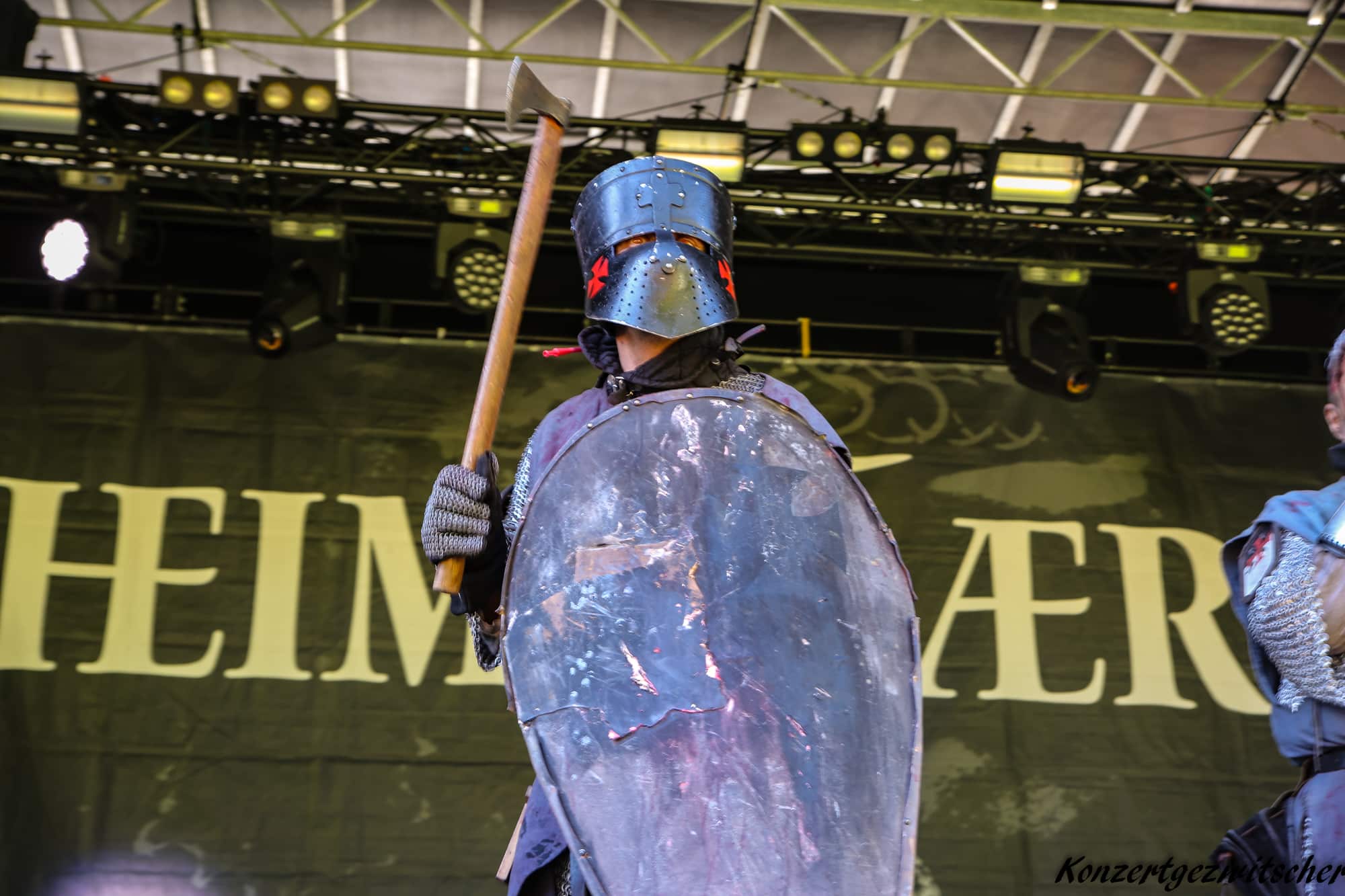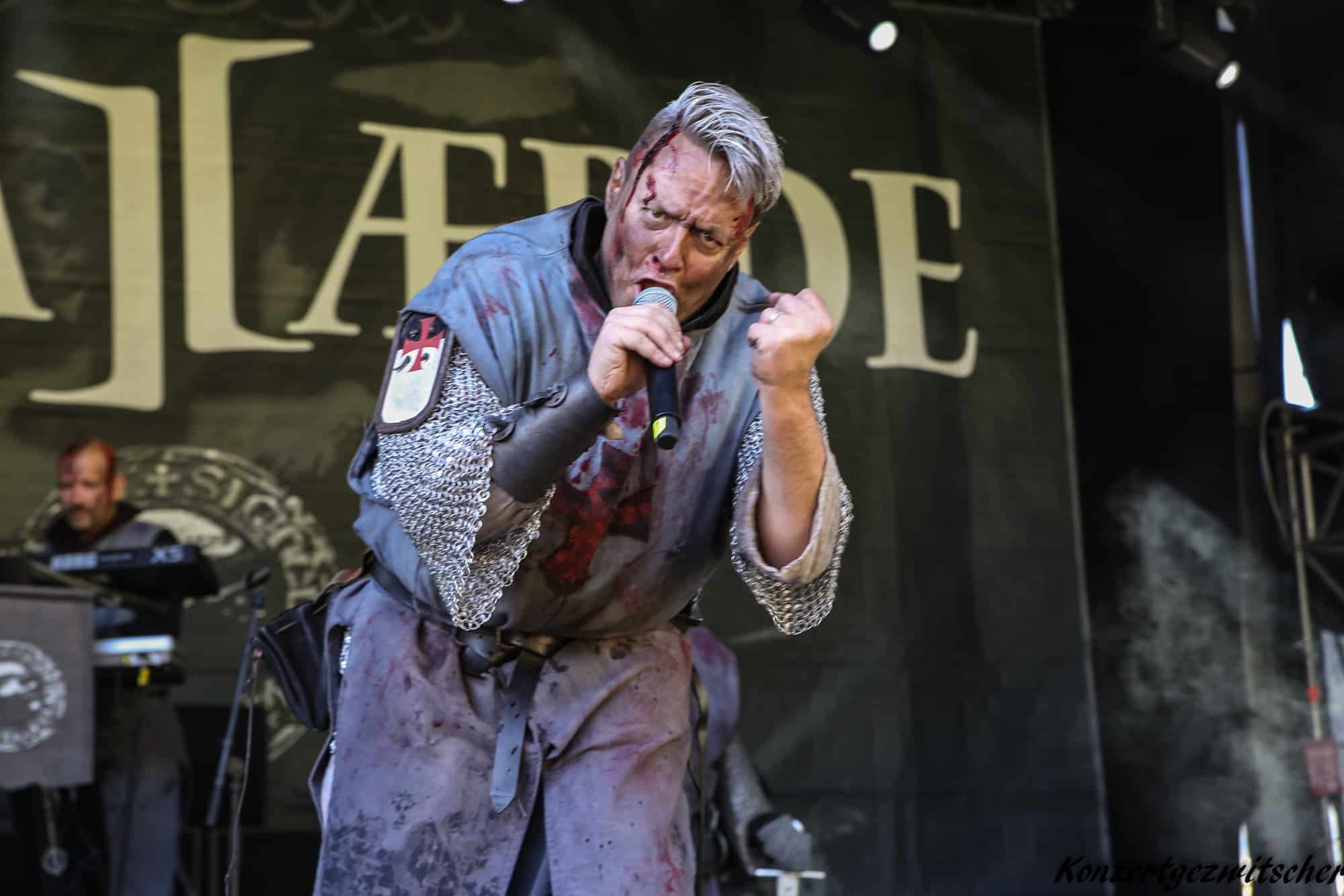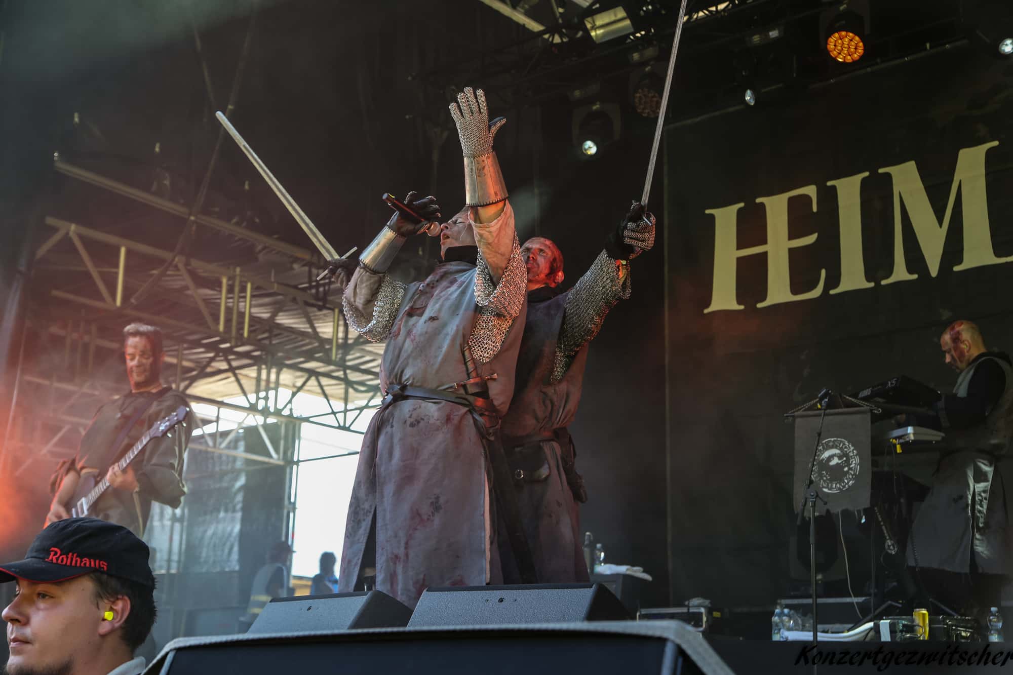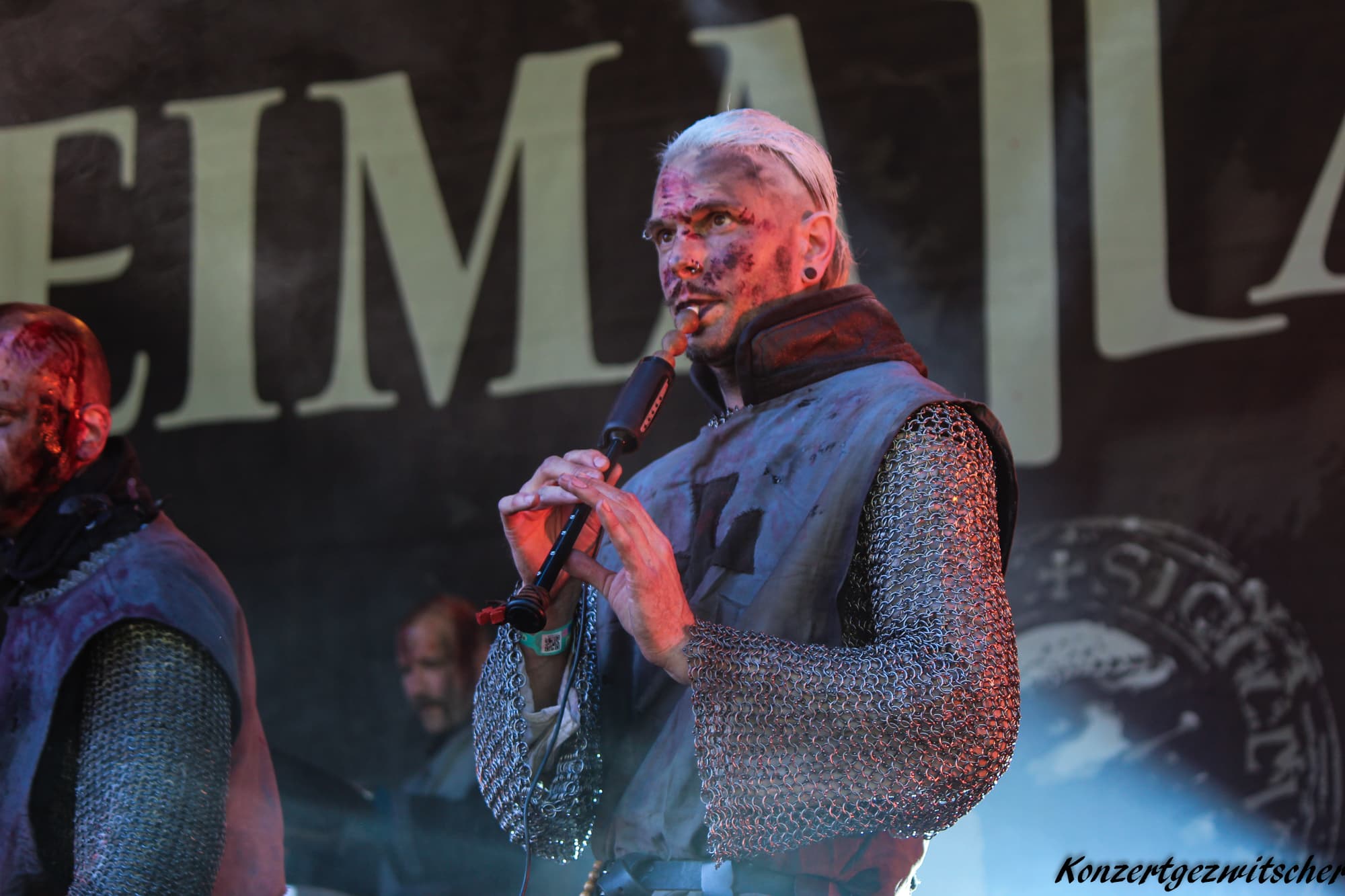 Mit der HEIMATAERDE halten am Freitag bereits die Templer Einzug in der Schweiz: Zum feierlichen Intro des aktuellen Album „Aerdenbrand“, dessen titelgebenden Song die untoten Tempelritter um Ashlar von Megalon bereits als erste Nummer spielen, zieht die illustre Ordensgemeinschaft Einzug auf der (wie passend) Mönch Stage Einzug. Es folgt eine optisch wie musikalisch aufwendige Show, die der kurzen Spielzeit von HEIMATAERDE fast schon unangemessen ist – gerne hätte man den Templern länger gelauscht und zugesehen. Denn in der Hand hat das heilige Quintett die Schweizer schon nach wenigen Songs: Egal ob bei Liedern dem düsteren ‚Folge Mir‘ wie der Bandhymne ‚Heimataerde‘, die das Publikum bald schon begeistert mitsingt – HEIMATAERDE beweist, dass man auch bei schwüler Sommerhitze in Gewandung, blutverschmiert und in schweren Kettenhemden eine energiegeladene und fast schon ausgelassene Party (so besinnt man sich auf der Bühne bisweilen dem Ruf „als Scooter der Schwarzen Szene“ zu gelten) zu feiern. Apropos mitsingt: Mein „Was geht denn hier ab?“-Moment des GREENFIELD Festivals geht bereits am ersten Tag an HEIMATAERDE. So sind die Zuhörer vor der Bühne beim Refrain von ‚Hick Hack Hackebeil‘ („Hick Hack, Hick Hack, Hackebeil – du wirst vor Gott stehen / Hick Hack, Hick Hack, Hackebeil – ich will dich tot sehen“) beinahe erschreckend textsicher…