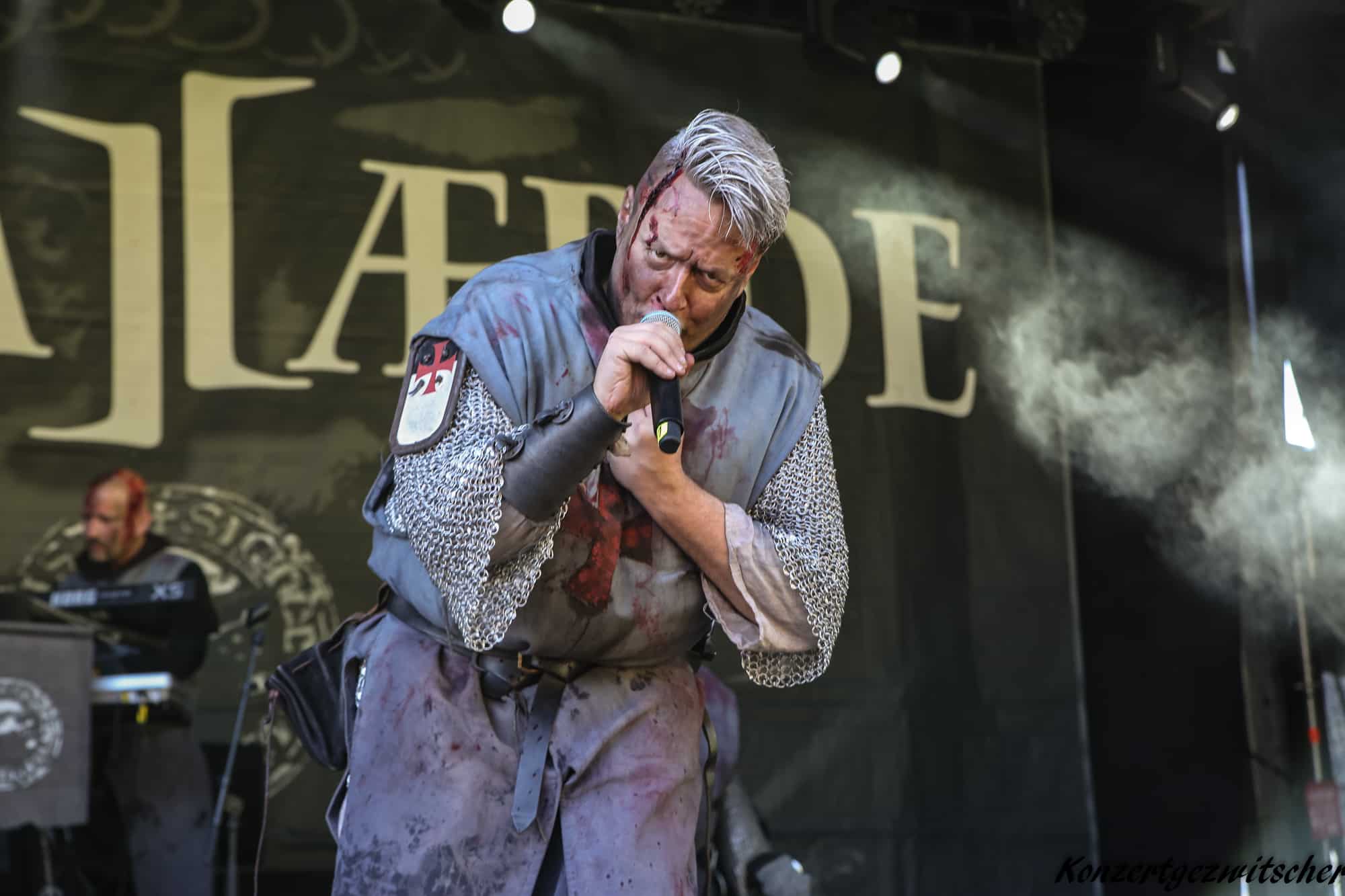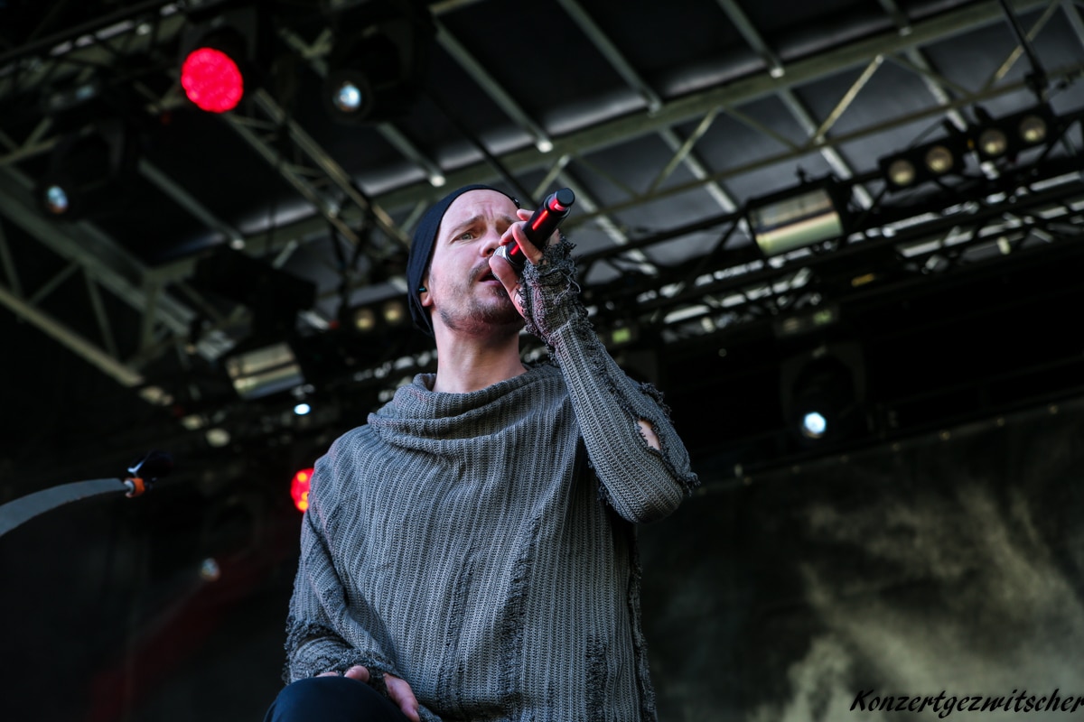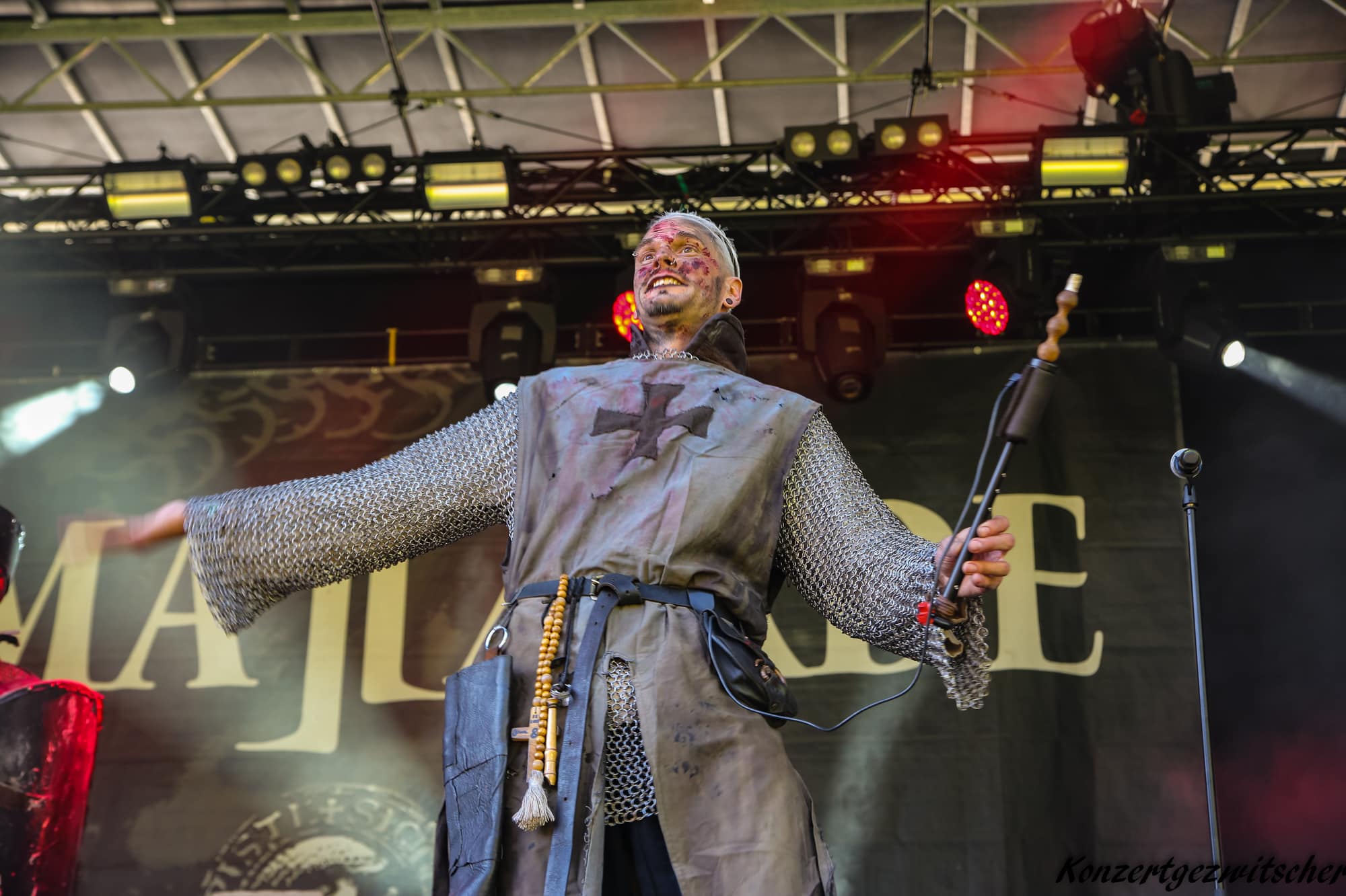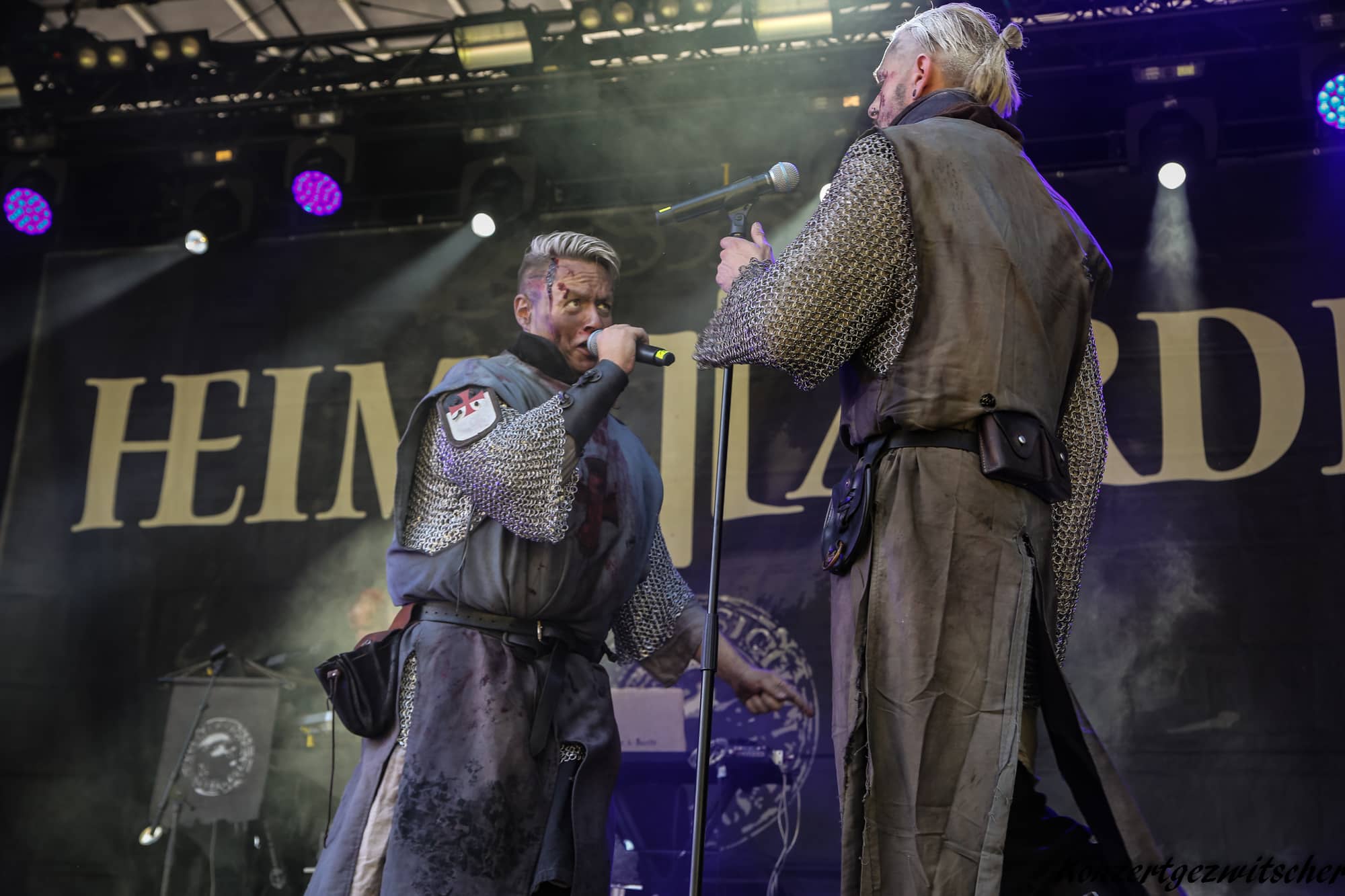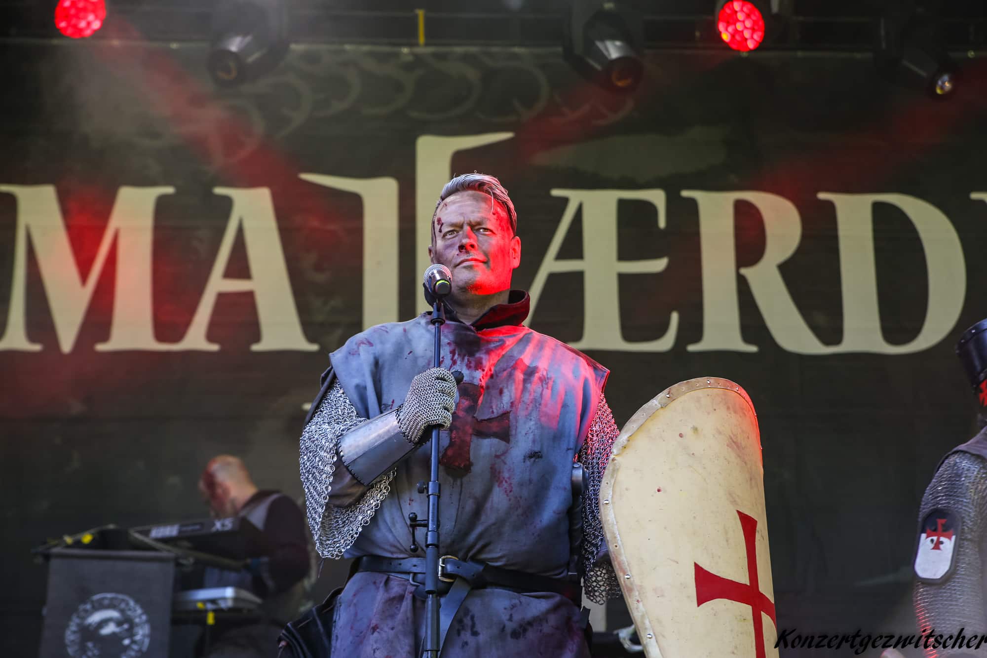 Mit der HEIMATAERDE halten am Freitag bereits die Templer Einzug in der Schweiz: Zum feierlichen Intro des aktuellen Album „Aerdenbrand“, dessen titelgebenden Song die untoten Tempelritter um Ashlar von Megalon bereits als erste Nummer spielen, zieht die illustre Ordensgemeinschaft Einzug auf der (wie passend) Mönch Stage Einzug. Es folgt eine optisch wie musikalisch aufwendige Show, die der kurzen Spielzeit von HEIMATAERDE fast schon unangemessen ist – gerne hätte man den Templern länger gelauscht und zugesehen. Denn in der Hand hat das heilige Quintett die Schweizer schon nach wenigen Songs: Egal ob bei Liedern dem düsteren ‚Folge Mir‘ wie der Bandhymne ‚Heimataerde‘, die das Publikum bald schon begeistert mitsingt – HEIMATAERDE beweist, dass man auch bei schwüler Sommerhitze in Gewandung, blutverschmiert und in schweren Kettenhemden eine energiegeladene und fast schon ausgelassene Party (so besinnt man sich auf der Bühne bisweilen dem Ruf „als Scooter der Schwarzen Szene“ zu gelten) zu feiern. Apropos mitsingt: Mein „Was geht denn hier ab?“-Moment des GREENFIELD Festivals geht bereits am ersten Tag an HEIMATAERDE. So sind die Zuhörer vor der Bühne beim Refrain von ‚Hick Hack Hackebeil‘ („Hick Hack, Hick Hack, Hackebeil – du wirst vor Gott stehen / Hick Hack, Hick Hack, Hackebeil – ich will dich tot sehen“) beinahe erschreckend textsicher…