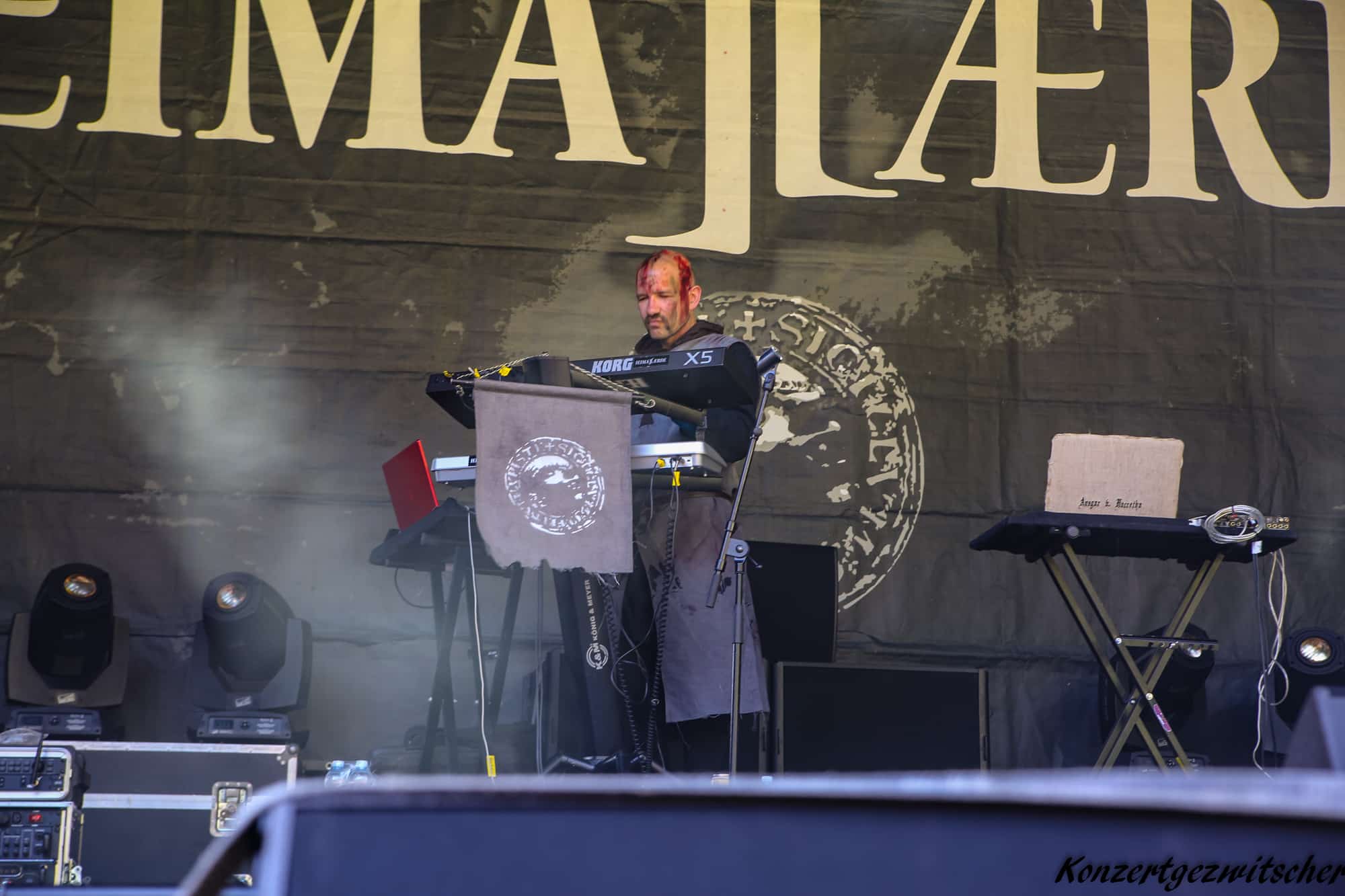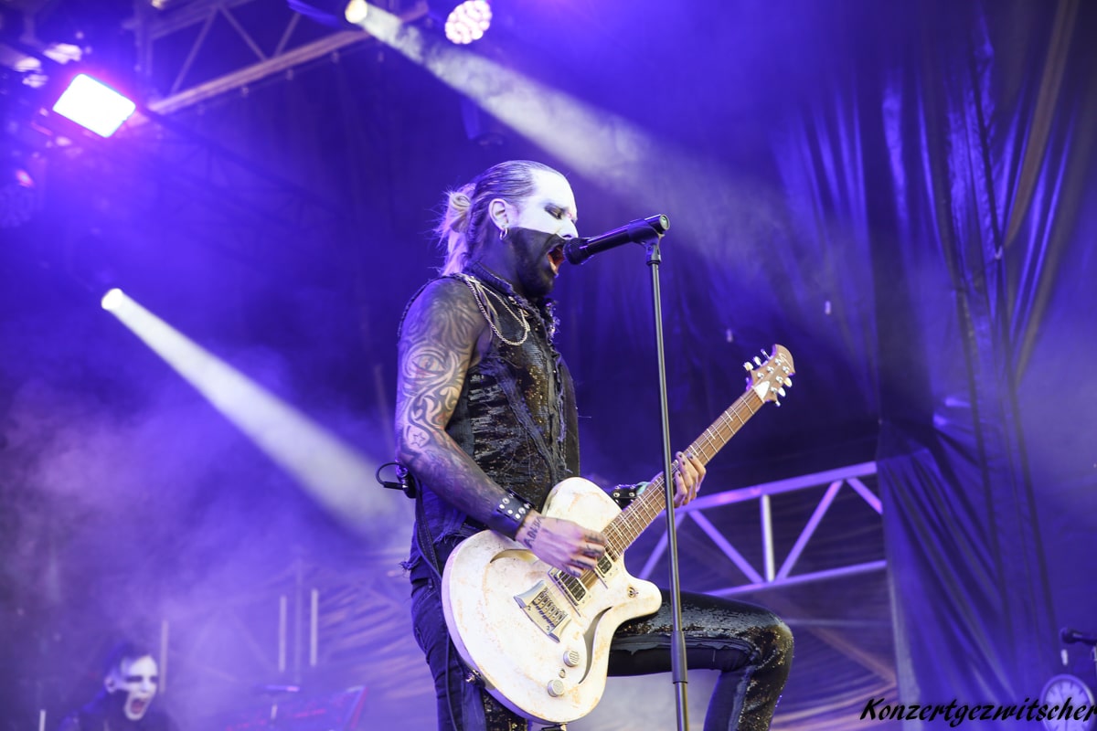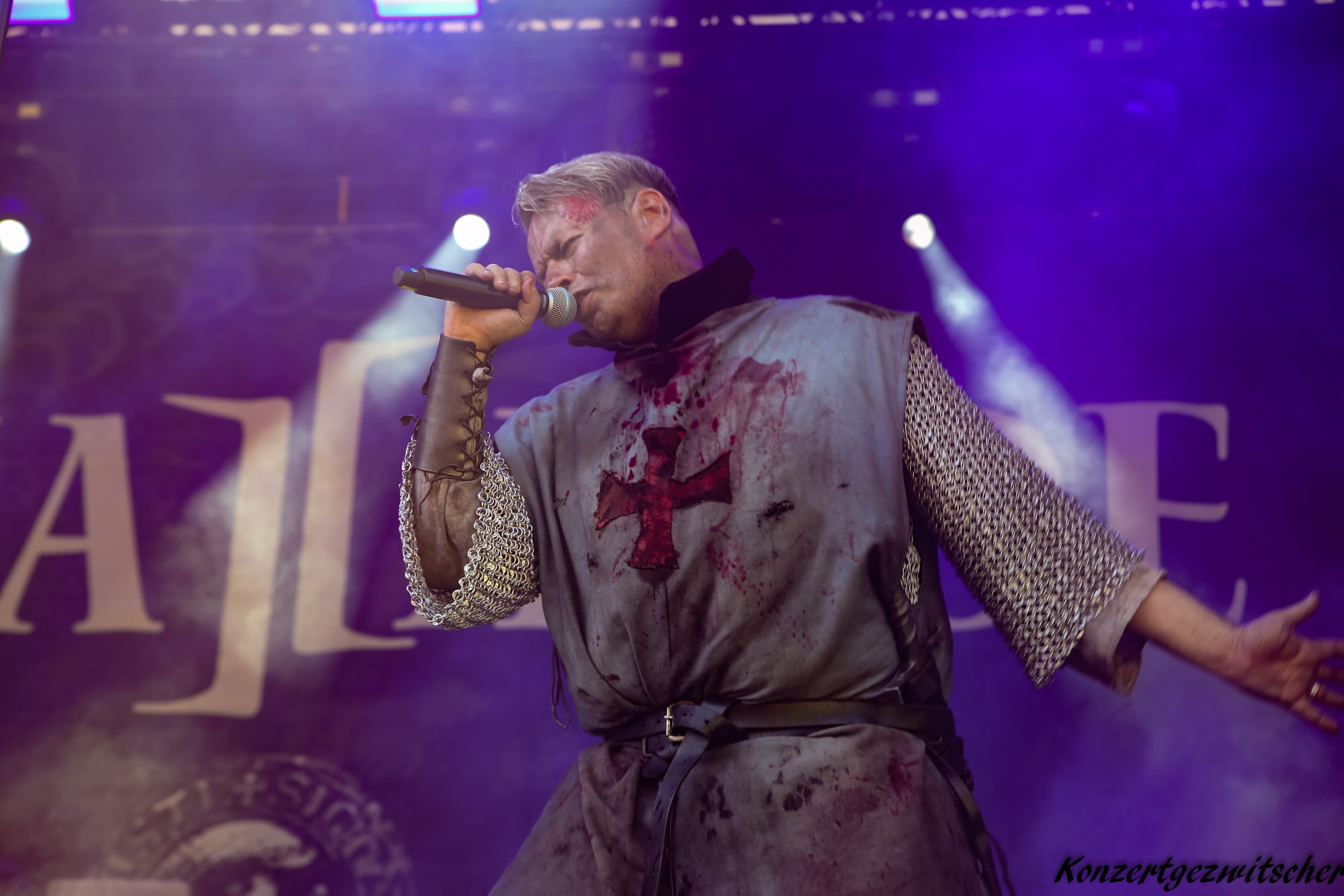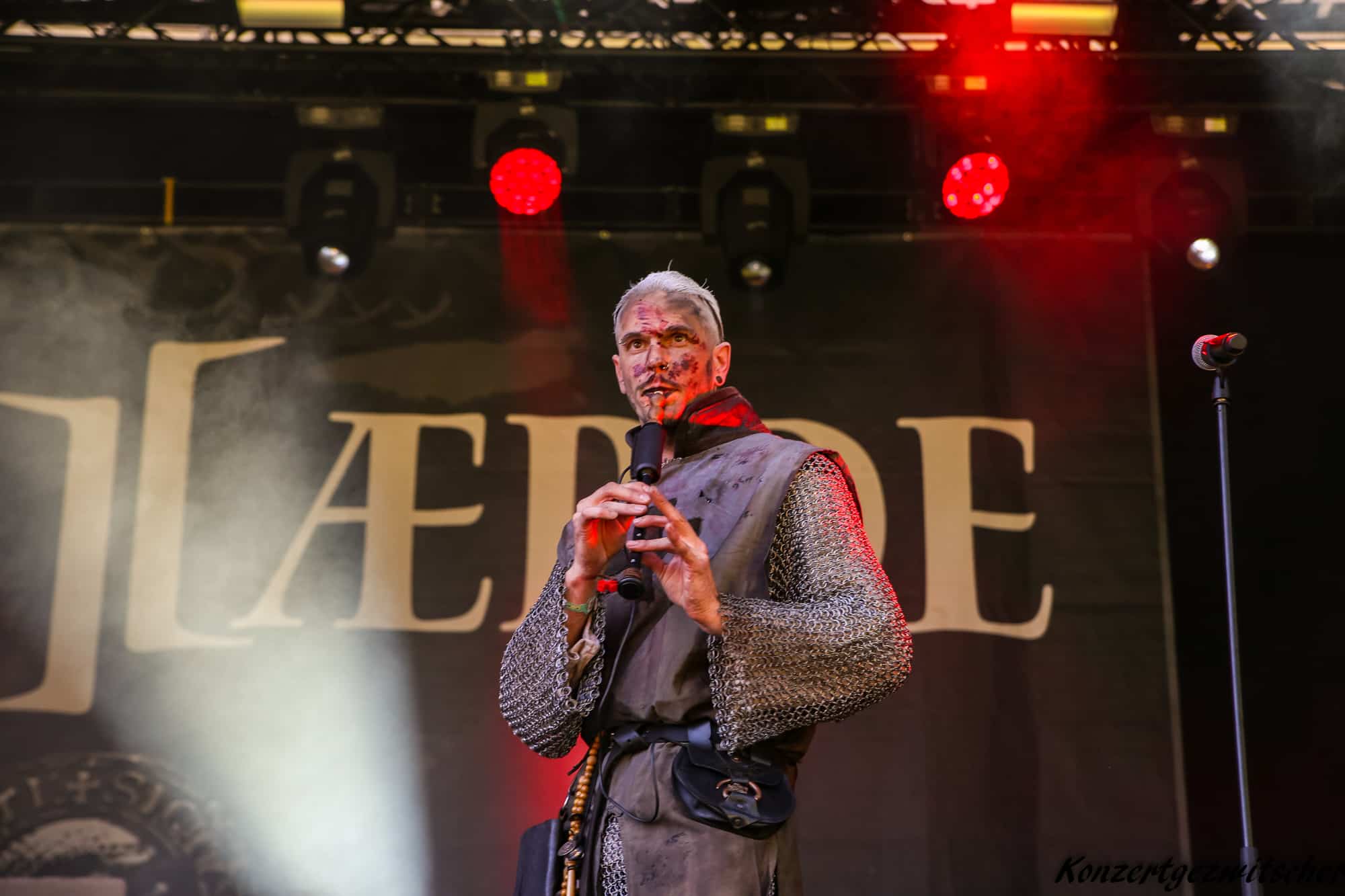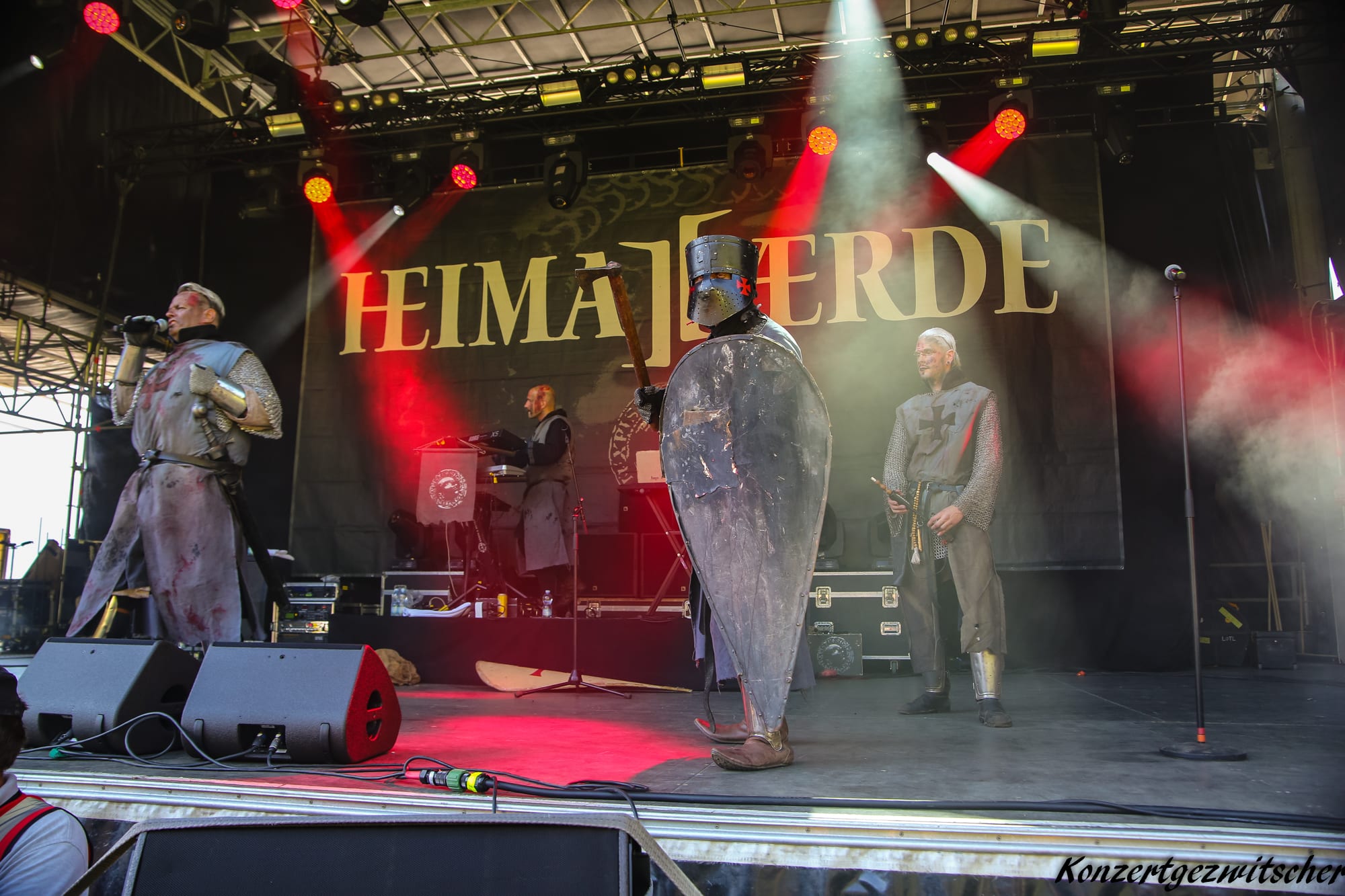 Mit der HEIMATAERDE halten am Freitag bereits die Templer Einzug in der Schweiz: Zum feierlichen Intro des aktuellen Album „Aerdenbrand“, dessen titelgebenden Song die untoten Tempelritter um Ashlar von Megalon bereits als erste Nummer spielen, zieht die illustre Ordensgemeinschaft Einzug auf der (wie passend) Mönch Stage Einzug. Es folgt eine optisch wie musikalisch aufwendige Show, die der kurzen Spielzeit von HEIMATAERDE fast schon unangemessen ist – gerne hätte man den Templern länger gelauscht und zugesehen. Denn in der Hand hat das heilige Quintett die Schweizer schon nach wenigen Songs: Egal ob bei Liedern dem düsteren ‚Folge Mir‘ wie der Bandhymne ‚Heimataerde‘, die das Publikum bald schon begeistert mitsingt – HEIMATAERDE beweist, dass man auch bei schwüler Sommerhitze in Gewandung, blutverschmiert und in schweren Kettenhemden eine energiegeladene und fast schon ausgelassene Party (so besinnt man sich auf der Bühne bisweilen dem Ruf „als Scooter der Schwarzen Szene“ zu gelten) zu feiern. Apropos mitsingt: Mein „Was geht denn hier ab?“-Moment des GREENFIELD Festivals geht bereits am ersten Tag an HEIMATAERDE. So sind die Zuhörer vor der Bühne beim Refrain von ‚Hick Hack Hackebeil‘ („Hick Hack, Hick Hack, Hackebeil – du wirst vor Gott stehen / Hick Hack, Hick Hack, Hackebeil – ich will dich tot sehen“) beinahe erschreckend textsicher…