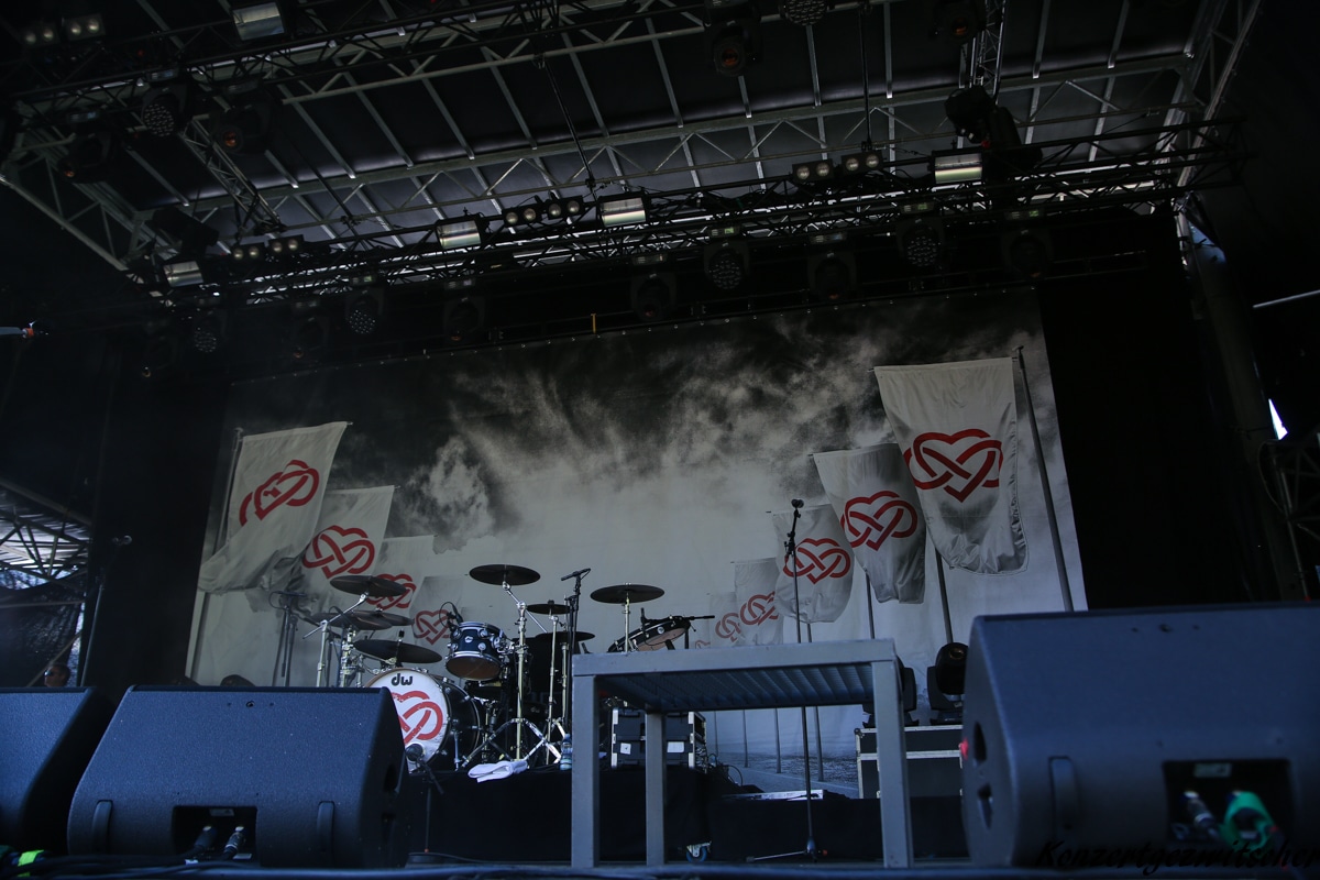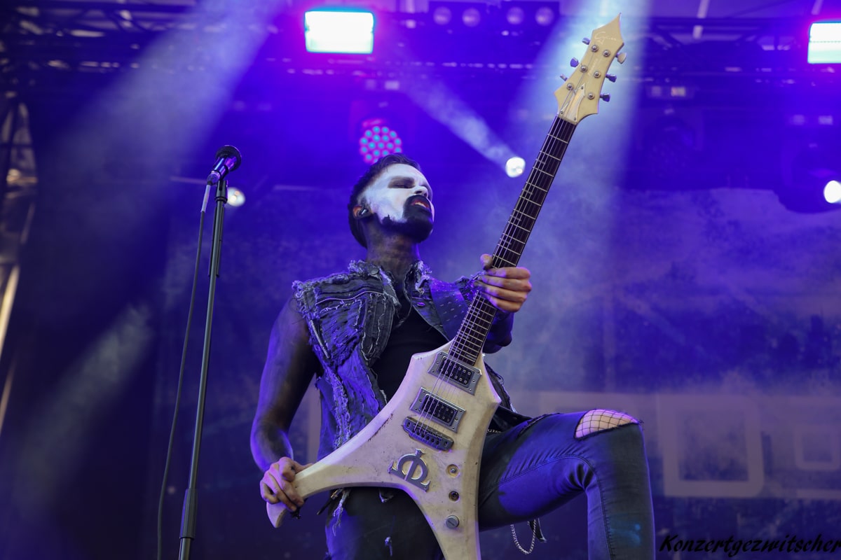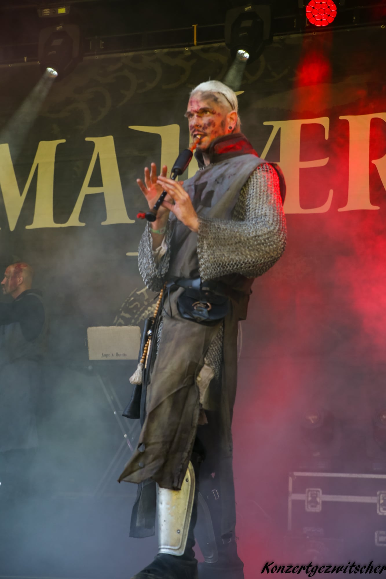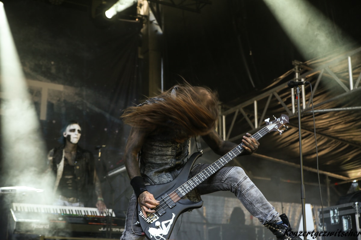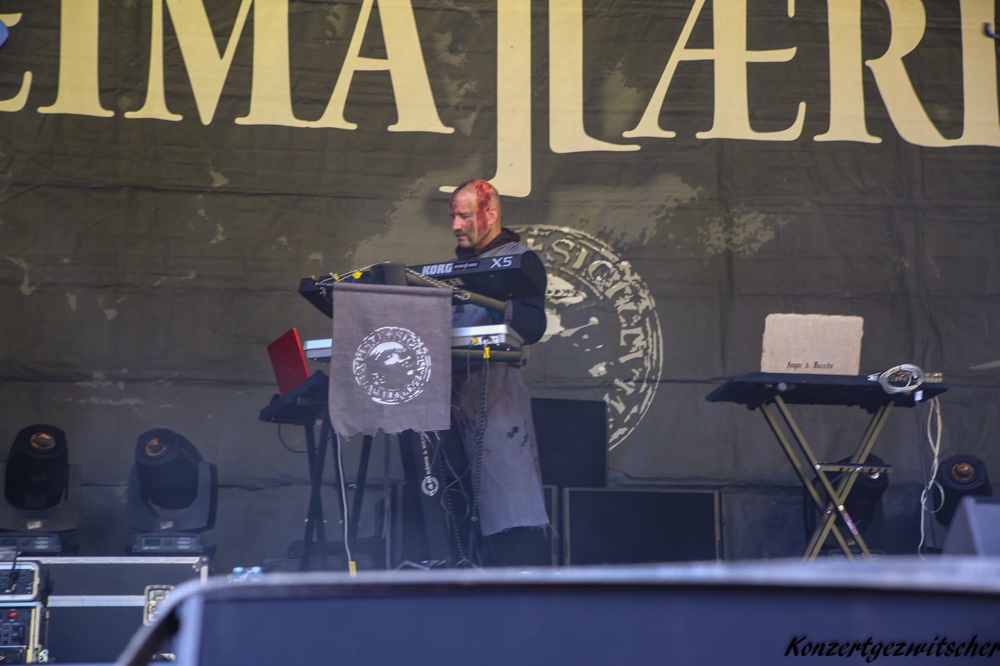 Mit der HEIMATAERDE halten am Freitag bereits die Templer Einzug in der Schweiz: Zum feierlichen Intro des aktuellen Album „Aerdenbrand“, dessen titelgebenden Song die untoten Tempelritter um Ashlar von Megalon bereits als erste Nummer spielen, zieht die illustre Ordensgemeinschaft Einzug auf der (wie passend) Mönch Stage Einzug. Es folgt eine optisch wie musikalisch aufwendige Show, die der kurzen Spielzeit von HEIMATAERDE fast schon unangemessen ist – gerne hätte man den Templern länger gelauscht und zugesehen. Denn in der Hand hat das heilige Quintett die Schweizer schon nach wenigen Songs: Egal ob bei Liedern dem düsteren ‚Folge Mir‘ wie der Bandhymne ‚Heimataerde‘, die das Publikum bald schon begeistert mitsingt – HEIMATAERDE beweist, dass man auch bei schwüler Sommerhitze in Gewandung, blutverschmiert und in schweren Kettenhemden eine energiegeladene und fast schon ausgelassene Party (so besinnt man sich auf der Bühne bisweilen dem Ruf „als Scooter der Schwarzen Szene“ zu gelten) zu feiern. Apropos mitsingt: Mein „Was geht denn hier ab?“-Moment des GREENFIELD Festivals geht bereits am ersten Tag an HEIMATAERDE. So sind die Zuhörer vor der Bühne beim Refrain von ‚Hick Hack Hackebeil‘ („Hick Hack, Hick Hack, Hackebeil – du wirst vor Gott stehen / Hick Hack, Hick Hack, Hackebeil – ich will dich tot sehen“) beinahe erschreckend textsicher…