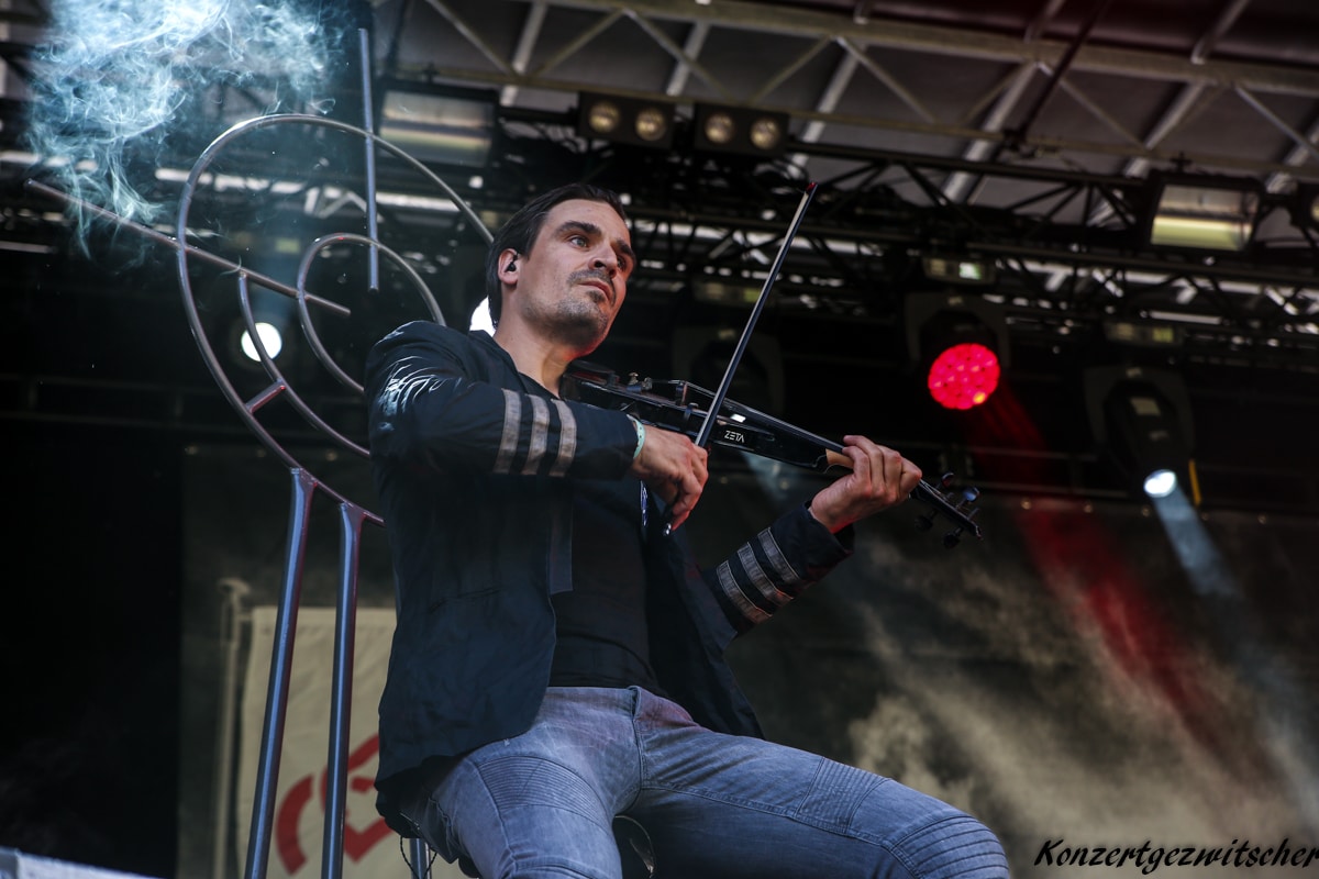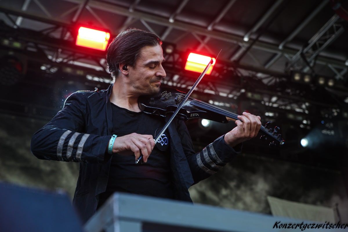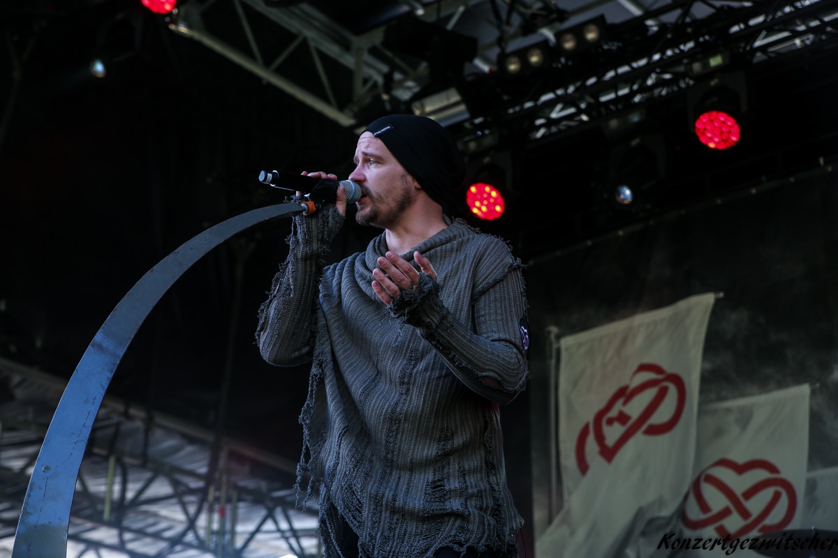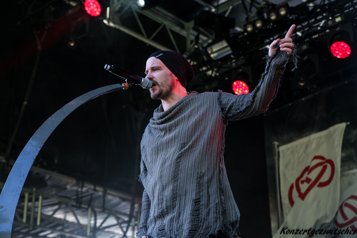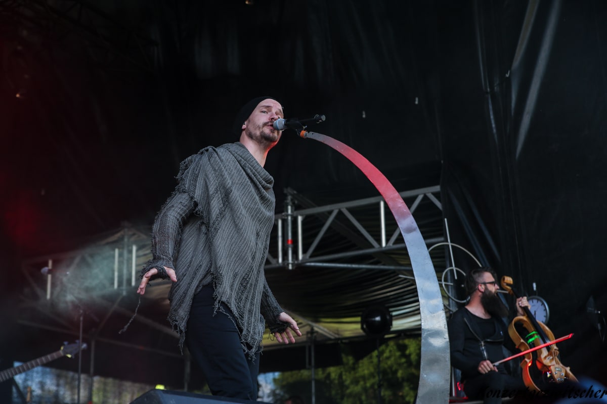 leo@metalnews (Bilder und Text) | Das aktuelle Album aus dem Presswerk der LETZTEN INSTANZ besitzt an diesem Festival-Nachmittag so viel Zündstoff wie nie: Mit “Liebe im Krieg” im Gepäck ziehen die Brachialromantiker um Frontmann Holly Loose am Festivalsamstag los, um mit dem Publikum einfach mal Spaß zu haben und für einen Moment die aktuellen Geschehnisse zu vergessen. So jedenfalls der Bühnenappell Hollys, der es sich dennoch nicht nehmen lässt zwischen Songs wie ‚Wir Sind Eins‘ oder eben dem titelgebenden ‚Liebe im Krieg‘ die Zuhörer auf ein harmonisches Miteinander einzuschwören. Eingerahmt von den beiden Virtuos-Künstlern M Stolz an der Geige und Benni Cellini am Cello geben sich die Dresdener auf der Mönch Stage die komplette Spielzeit hinweg familiär und publikumsnah. Dazu trägt neben der charismatischen Art Hollys auch die Bühnenpräsenz der bereits erwähnten Streicher sein. Mit Headbanging oder einem kurzen Sprung auf die Podeste blasen diese dem Klischee introvertierter Klassikinstrumentalisten auf dem GREENFIELD gehörig den Marsch. Kleine Scherze mit den Festivalbesuchern, ein buntes Programm aus altgedienten Livehits und Momenten zum Nachdenken, die LETZTE INSTANZ erreicht ihr Ziel an diesem Nachmittag schon nach wenigen Minuten: Sämtliche schlechte Nachrichten sind für einen Moment vergessen.