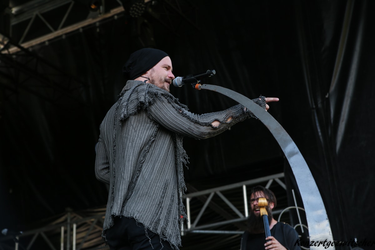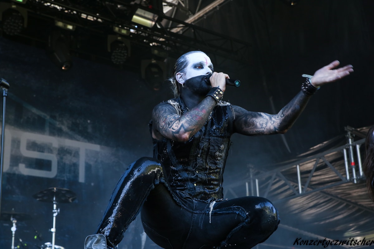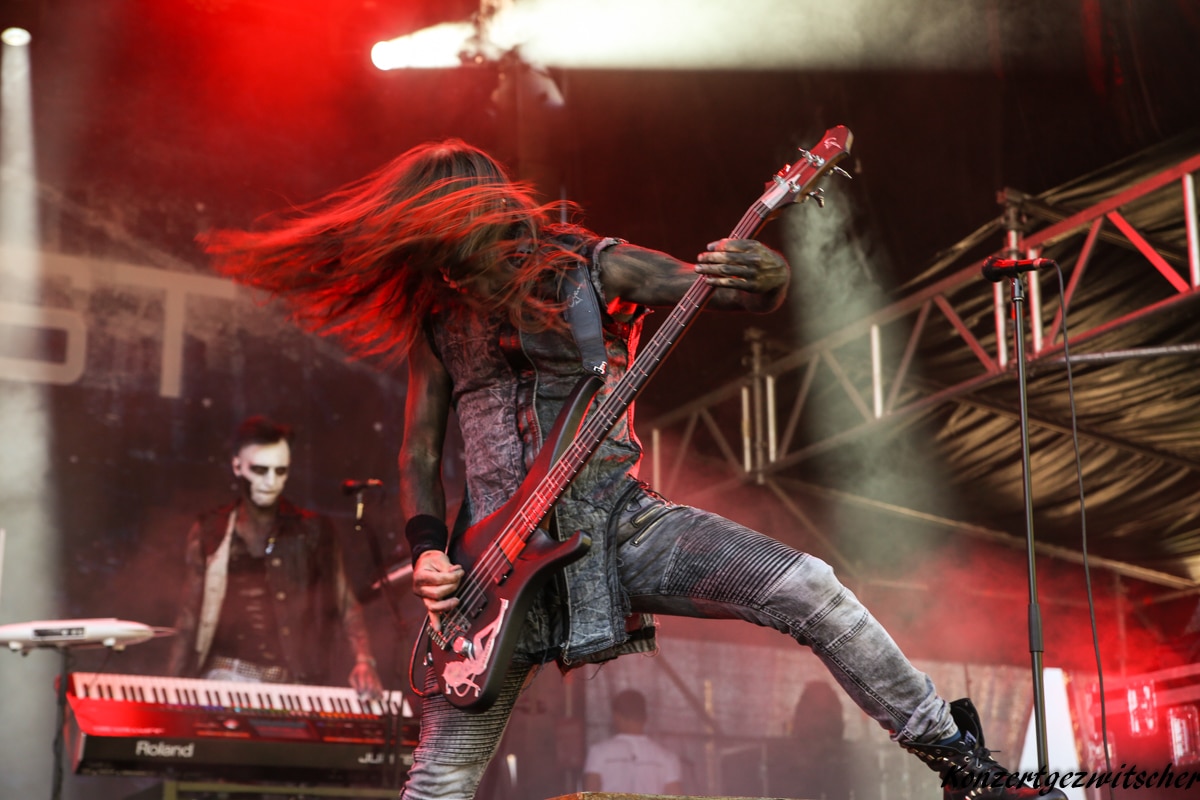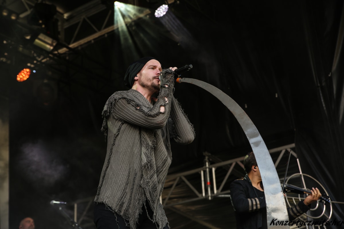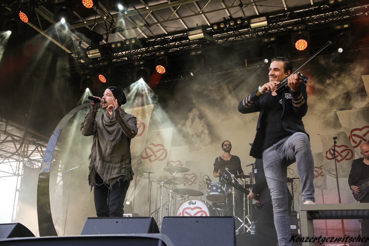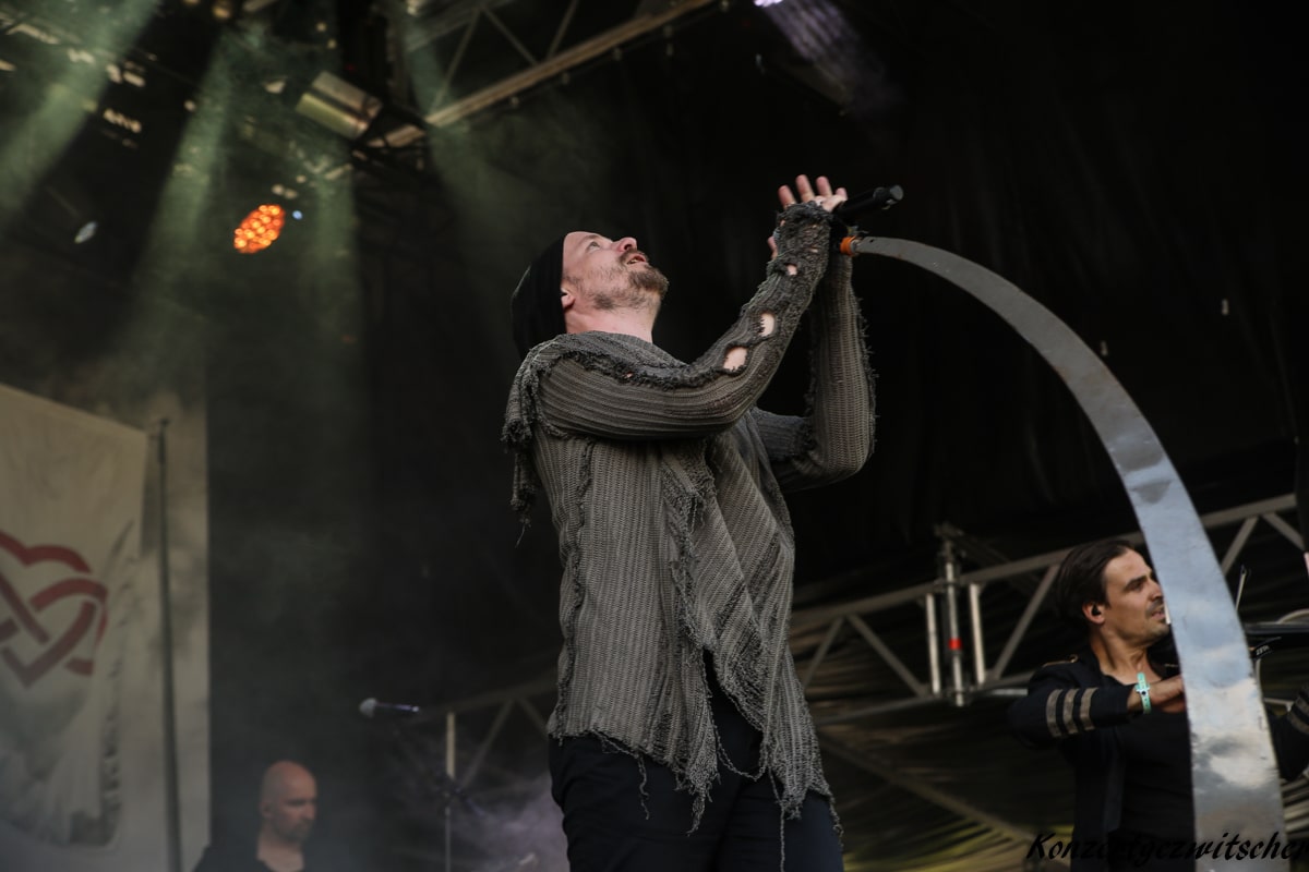 leo@metalnews (Bilder und Text) | Das aktuelle Album aus dem Presswerk der LETZTEN INSTANZ besitzt an diesem Festival-Nachmittag so viel Zündstoff wie nie: Mit “Liebe im Krieg” im Gepäck ziehen die Brachialromantiker um Frontmann Holly Loose am Festivalsamstag los, um mit dem Publikum einfach mal Spaß zu haben und für einen Moment die aktuellen Geschehnisse zu vergessen. So jedenfalls der Bühnenappell Hollys, der es sich dennoch nicht nehmen lässt zwischen Songs wie ‚Wir Sind Eins‘ oder eben dem titelgebenden ‚Liebe im Krieg‘ die Zuhörer auf ein harmonisches Miteinander einzuschwören. Eingerahmt von den beiden Virtuos-Künstlern M Stolz an der Geige und Benni Cellini am Cello geben sich die Dresdener auf der Mönch Stage die komplette Spielzeit hinweg familiär und publikumsnah. Dazu trägt neben der charismatischen Art Hollys auch die Bühnenpräsenz der bereits erwähnten Streicher sein. Mit Headbanging oder einem kurzen Sprung auf die Podeste blasen diese dem Klischee introvertierter Klassikinstrumentalisten auf dem GREENFIELD gehörig den Marsch. Kleine Scherze mit den Festivalbesuchern, ein buntes Programm aus altgedienten Livehits und Momenten zum Nachdenken, die LETZTE INSTANZ erreicht ihr Ziel an diesem Nachmittag schon nach wenigen Minuten: Sämtliche schlechte Nachrichten sind für einen Moment vergessen.