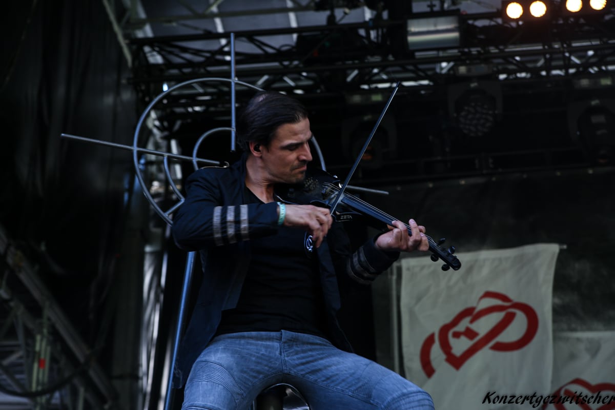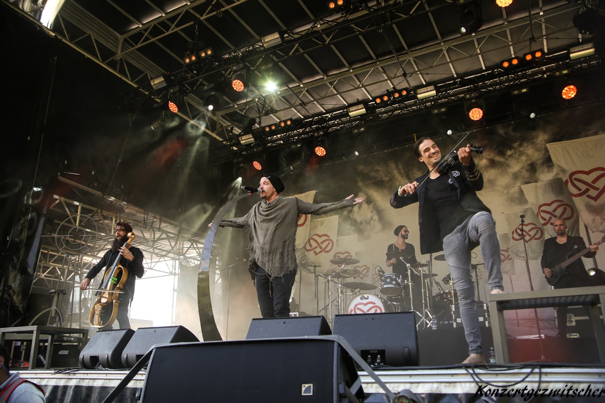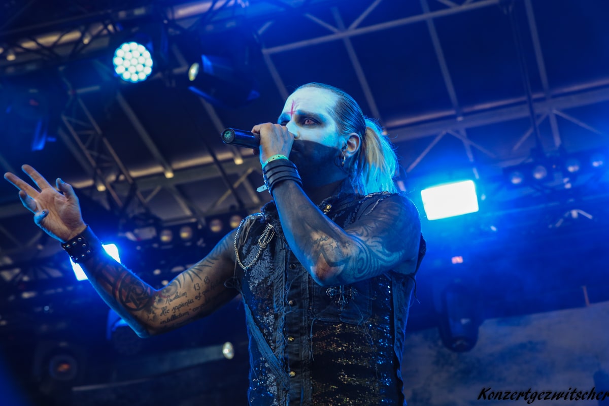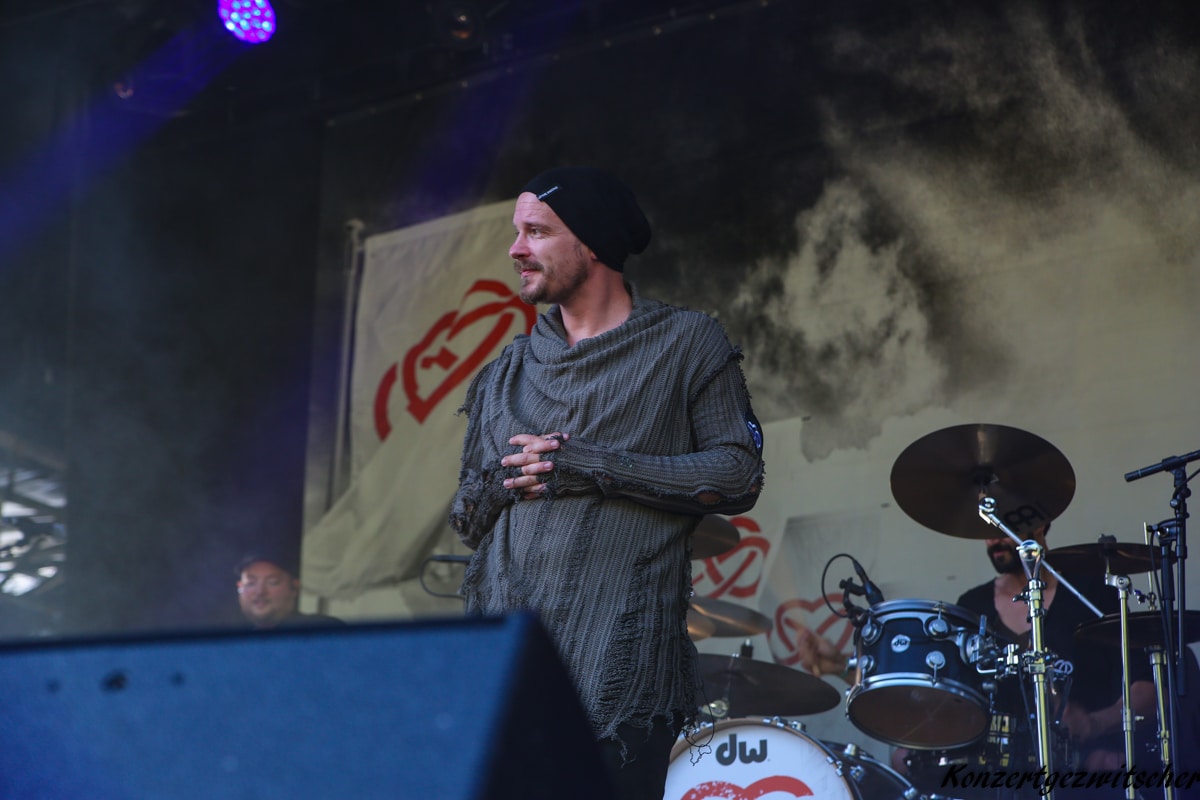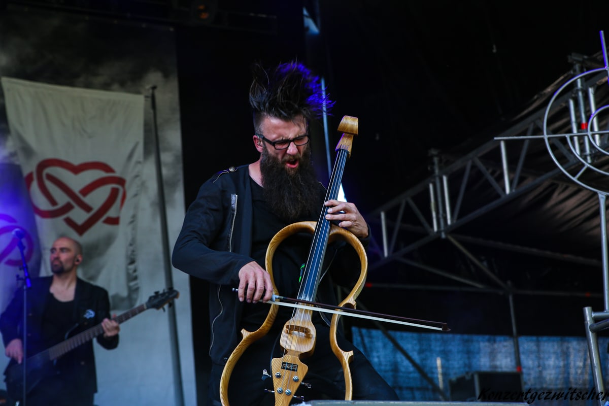 leo@metalnews (Bilder und Text) | Das aktuelle Album aus dem Presswerk der LETZTEN INSTANZ besitzt an diesem Festival-Nachmittag so viel Zündstoff wie nie: Mit “Liebe im Krieg” im Gepäck ziehen die Brachialromantiker um Frontmann Holly Loose am Festivalsamstag los, um mit dem Publikum einfach mal Spaß zu haben und für einen Moment die aktuellen Geschehnisse zu vergessen. So jedenfalls der Bühnenappell Hollys, der es sich dennoch nicht nehmen lässt zwischen Songs wie ‚Wir Sind Eins‘ oder eben dem titelgebenden ‚Liebe im Krieg‘ die Zuhörer auf ein harmonisches Miteinander einzuschwören. Eingerahmt von den beiden Virtuos-Künstlern M Stolz an der Geige und Benni Cellini am Cello geben sich die Dresdener auf der Mönch Stage die komplette Spielzeit hinweg familiär und publikumsnah. Dazu trägt neben der charismatischen Art Hollys auch die Bühnenpräsenz der bereits erwähnten Streicher sein. Mit Headbanging oder einem kurzen Sprung auf die Podeste blasen diese dem Klischee introvertierter Klassikinstrumentalisten auf dem GREENFIELD gehörig den Marsch. Kleine Scherze mit den Festivalbesuchern, ein buntes Programm aus altgedienten Livehits und Momenten zum Nachdenken, die LETZTE INSTANZ erreicht ihr Ziel an diesem Nachmittag schon nach wenigen Minuten: Sämtliche schlechte Nachrichten sind für einen Moment vergessen.