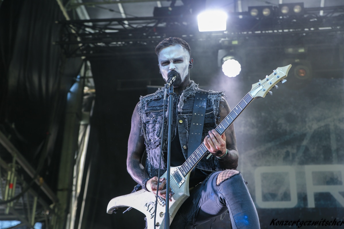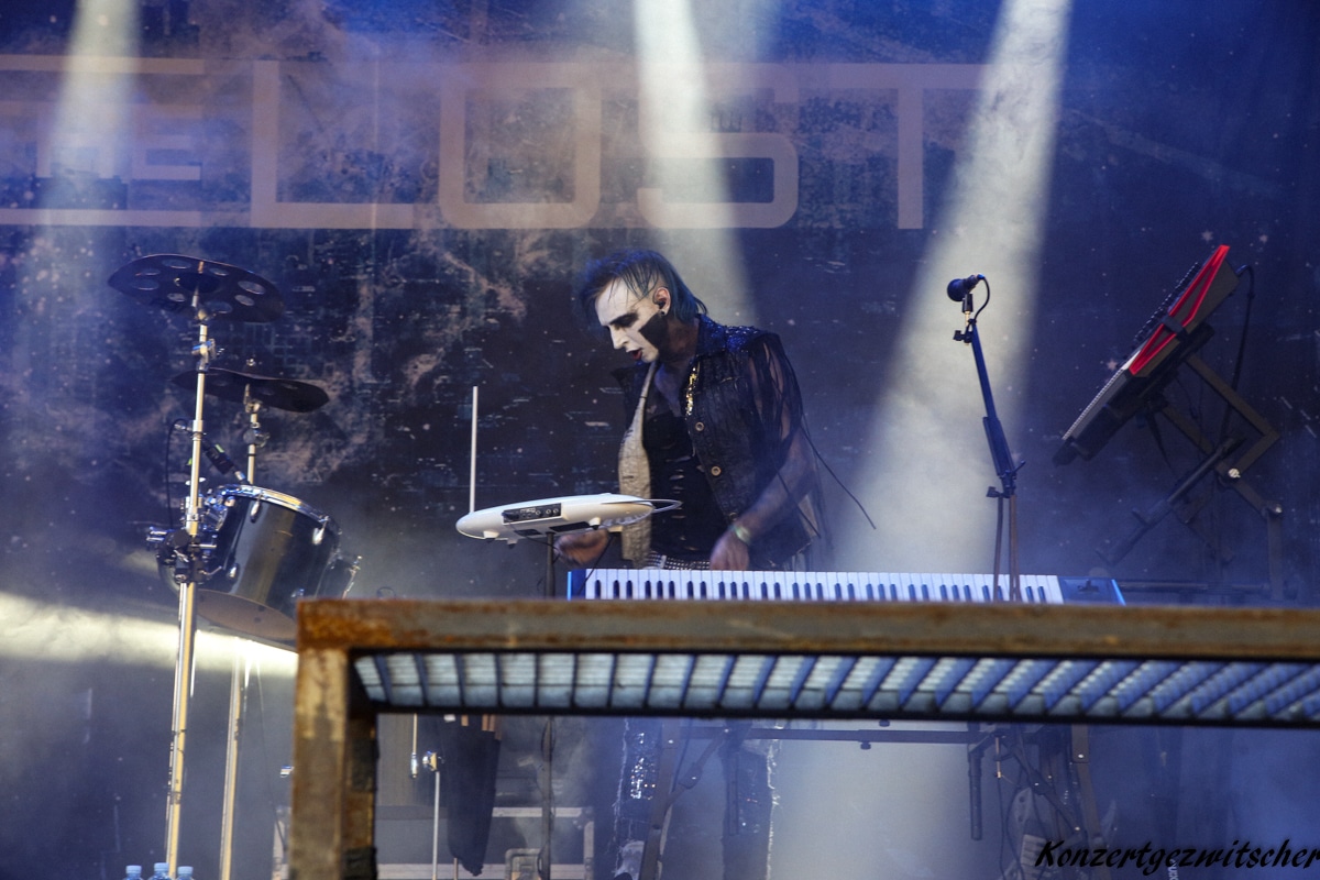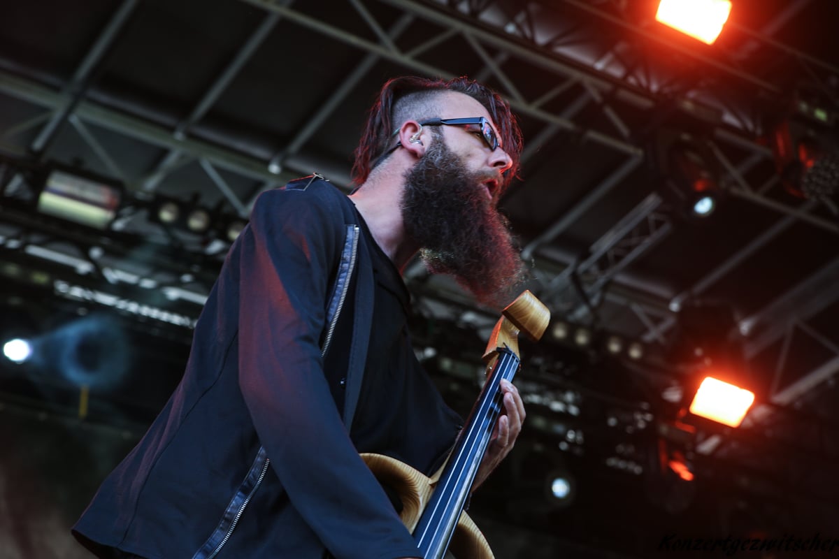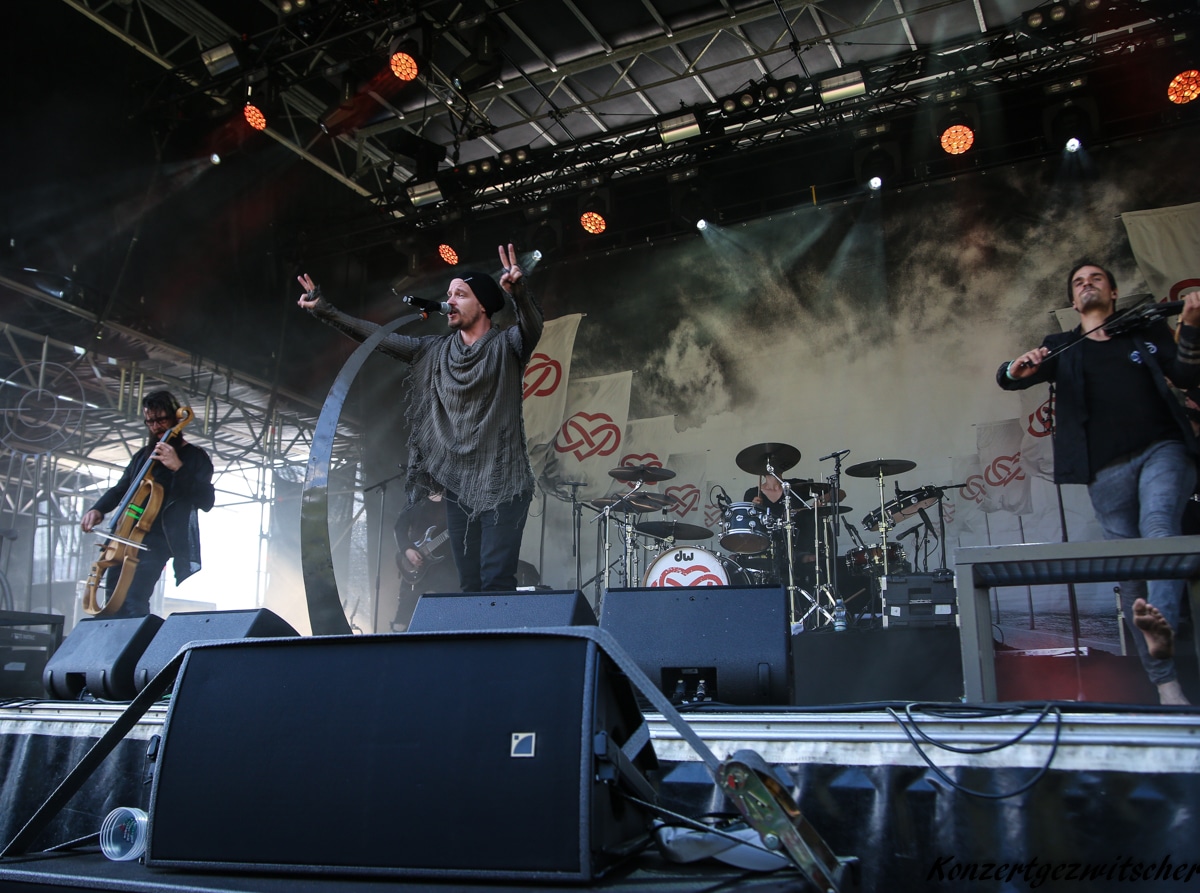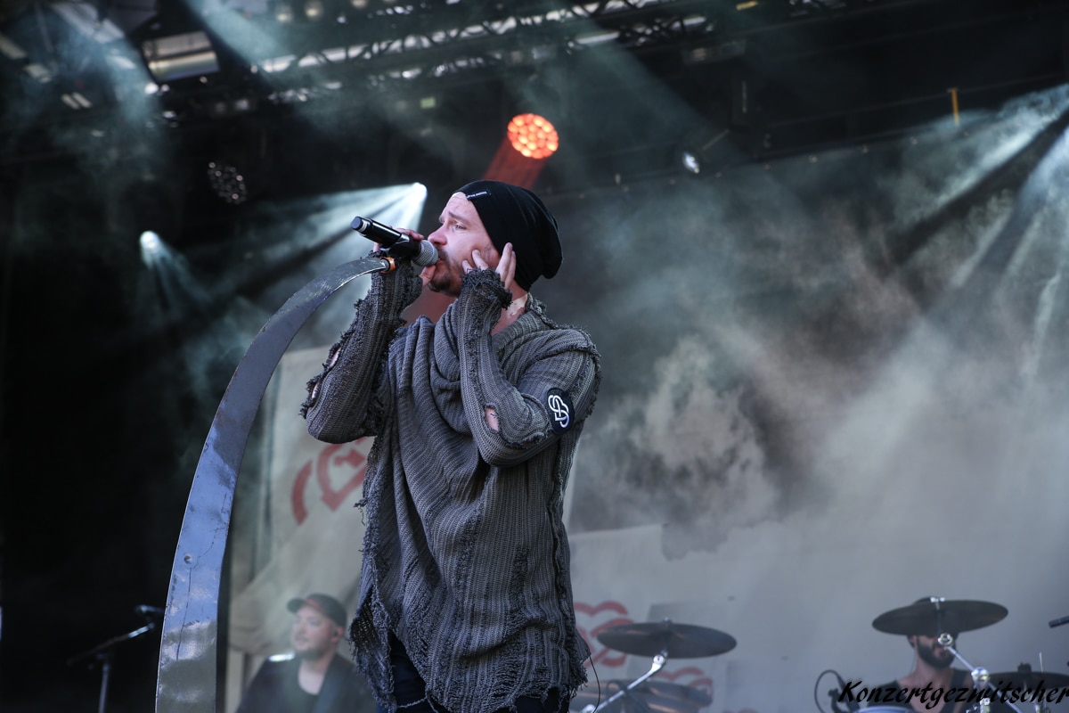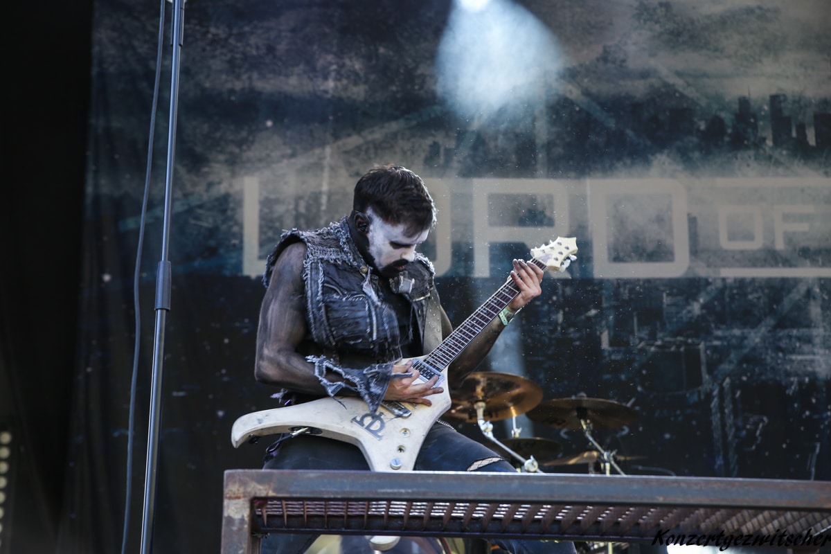leo@metalnews (Bilder und Text) | Das aktuelle Album aus dem Presswerk der LETZTEN INSTANZ besitzt an diesem Festival-Nachmittag so viel Zündstoff wie nie: Mit “Liebe im Krieg” im Gepäck ziehen die Brachialromantiker um Frontmann Holly Loose am Festivalsamstag los, um mit dem Publikum einfach mal Spaß zu haben und für einen Moment die aktuellen Geschehnisse zu vergessen. So jedenfalls der Bühnenappell Hollys, der es sich dennoch nicht nehmen lässt zwischen Songs wie ‚Wir Sind Eins‘ oder eben dem titelgebenden ‚Liebe im Krieg‘ die Zuhörer auf ein harmonisches Miteinander einzuschwören. Eingerahmt von den beiden Virtuos-Künstlern M Stolz an der Geige und Benni Cellini am Cello geben sich die Dresdener auf der Mönch Stage die komplette Spielzeit hinweg familiär und publikumsnah. Dazu trägt neben der charismatischen Art Hollys auch die Bühnenpräsenz der bereits erwähnten Streicher sein. Mit Headbanging oder einem kurzen Sprung auf die Podeste blasen diese dem Klischee introvertierter Klassikinstrumentalisten auf dem GREENFIELD gehörig den Marsch. Kleine Scherze mit den Festivalbesuchern, ein buntes Programm aus altgedienten Livehits und Momenten zum Nachdenken, die LETZTE INSTANZ erreicht ihr Ziel an diesem Nachmittag schon nach wenigen Minuten: Sämtliche schlechte Nachrichten sind für einen Moment vergessen.