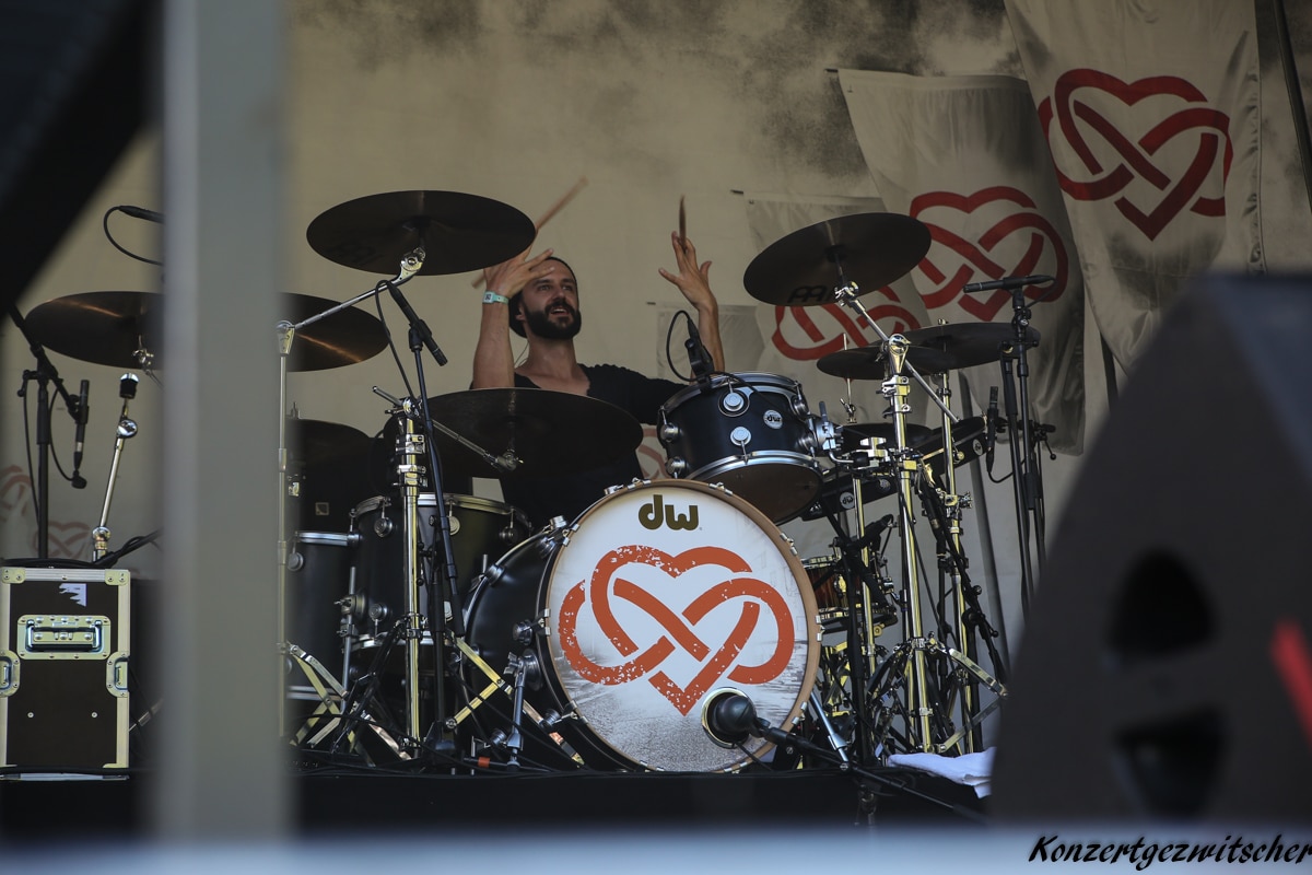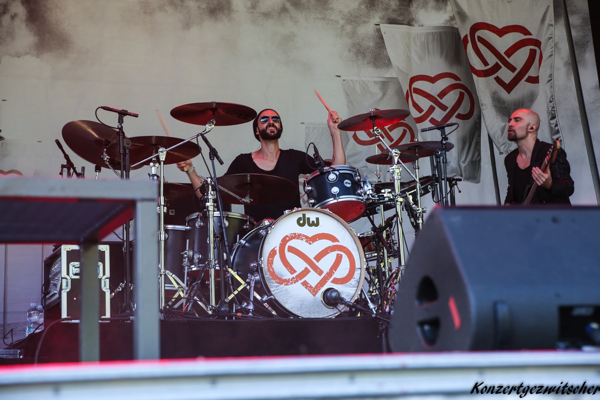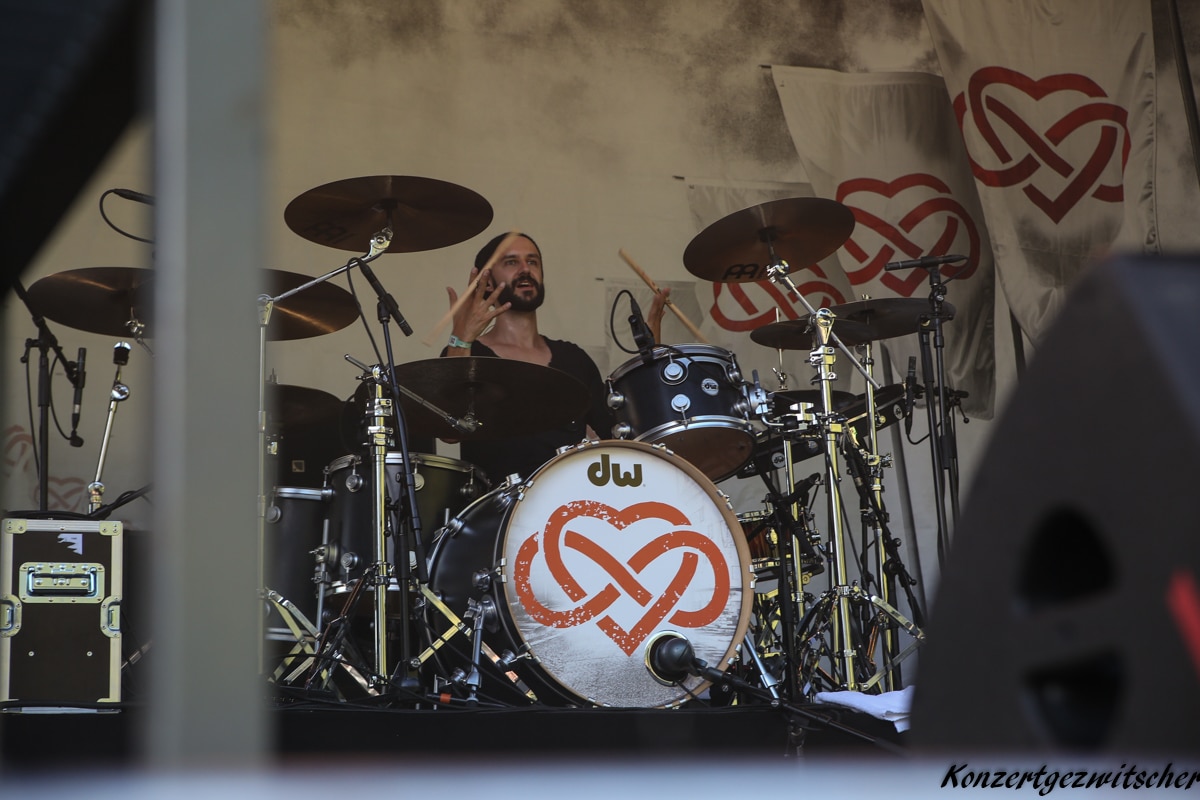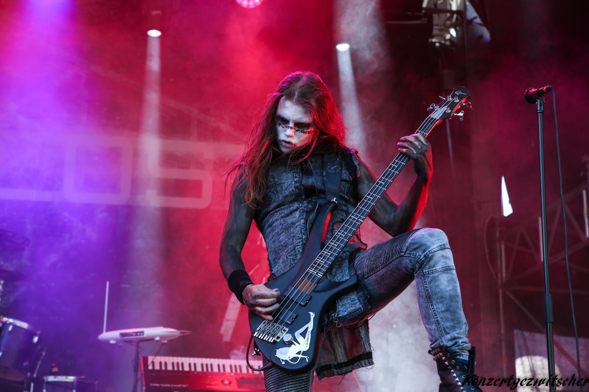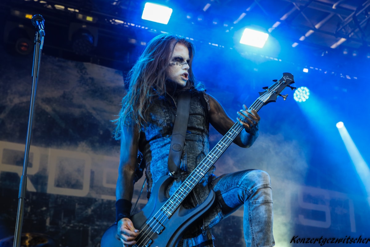 leo@metalnews (Bilder und Text) | Das aktuelle Album aus dem Presswerk der LETZTEN INSTANZ besitzt an diesem Festival-Nachmittag so viel Zündstoff wie nie: Mit “Liebe im Krieg” im Gepäck ziehen die Brachialromantiker um Frontmann Holly Loose am Festivalsamstag los, um mit dem Publikum einfach mal Spaß zu haben und für einen Moment die aktuellen Geschehnisse zu vergessen. So jedenfalls der Bühnenappell Hollys, der es sich dennoch nicht nehmen lässt zwischen Songs wie ‚Wir Sind Eins‘ oder eben dem titelgebenden ‚Liebe im Krieg‘ die Zuhörer auf ein harmonisches Miteinander einzuschwören. Eingerahmt von den beiden Virtuos-Künstlern M Stolz an der Geige und Benni Cellini am Cello geben sich die Dresdener auf der Mönch Stage die komplette Spielzeit hinweg familiär und publikumsnah. Dazu trägt neben der charismatischen Art Hollys auch die Bühnenpräsenz der bereits erwähnten Streicher sein. Mit Headbanging oder einem kurzen Sprung auf die Podeste blasen diese dem Klischee introvertierter Klassikinstrumentalisten auf dem GREENFIELD gehörig den Marsch. Kleine Scherze mit den Festivalbesuchern, ein buntes Programm aus altgedienten Livehits und Momenten zum Nachdenken, die LETZTE INSTANZ erreicht ihr Ziel an diesem Nachmittag schon nach wenigen Minuten: Sämtliche schlechte Nachrichten sind für einen Moment vergessen.