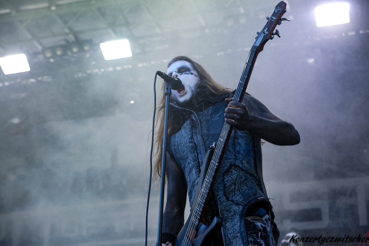 Entweder liebt man sie oder ist von dem plakativen Auftritt schockiert, den die OST+FRONT am letzten Tag des GREENFIELD auf die Bühne bringt: Zur Hymne der ehemaligen Deutschen Demokratischen Republik einziehend, ruft das zombiehafte Aussehen der Neuen-Deutschen-Härte-Band aus Berlin mit Maulkorb und Co bei Nicht-Kennern eine Mischung aus Erstaunen und Irritation hervor. Letzteres steigt sogar im Publikum, als die Herren schließlich stilecht mit Sombrero den neusten Song von OST+FRONT anstimmen – das spanischsprachige und schwergängige ‚Fiesta Del Sexo‘. Danach in die deutsche Sprache wechselnd, vertieft OST+FRONT sich mit Liedern wie ‚Freundschaft‘ in einen Auftritt, den man mit spitzer Zunge als einfache Version von RAMMSTEIN bezeichnen könnte. Wirklich überzeugen kann die OST+FRONT die Schweizer damit nicht. Stimmung kommt eigentlich erst auf, als die Musiker einen riesigen roten Gummiball ins Publikum werfen, der ab da ping-pong-mäßig zwischen Bühne und Zuschauern hin- und hergeworfen wird. Nicht die beste Idee: So erschwert die Kugel nicht nur den Instrumentalisten ihren Job, auch die Security und die Fotografen im Graben reagieren sichtlich genervt auf das unbekannte Flugobjekt.