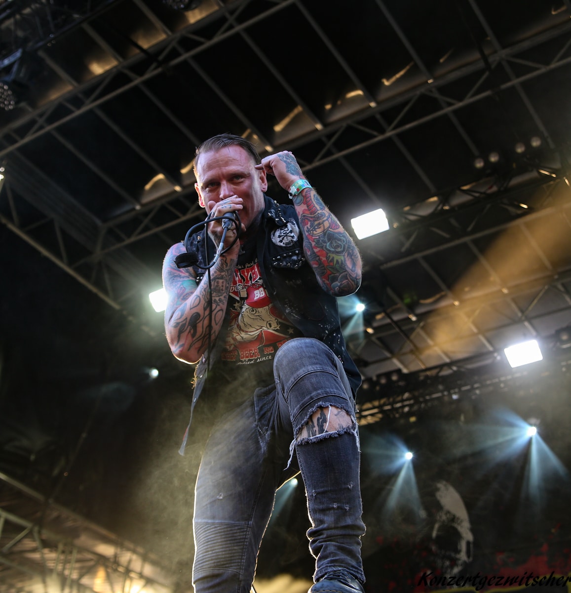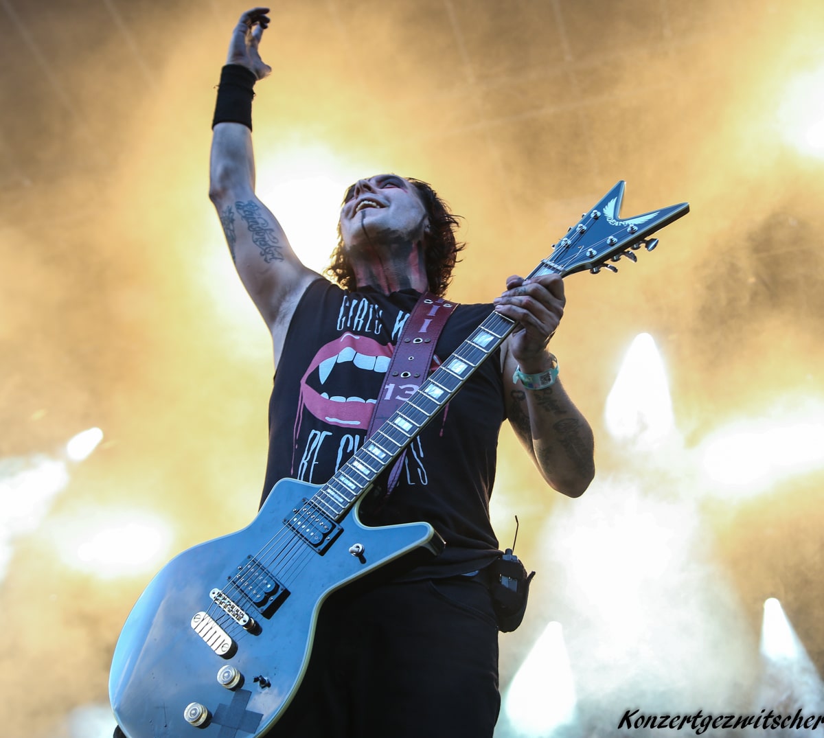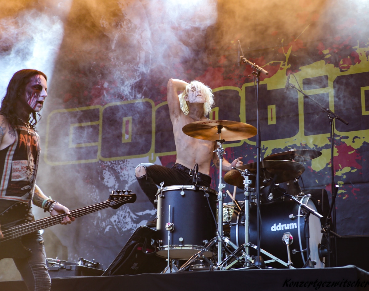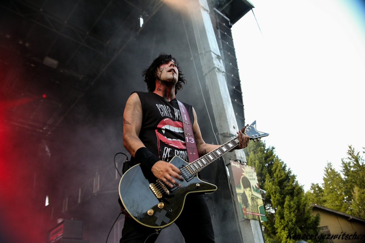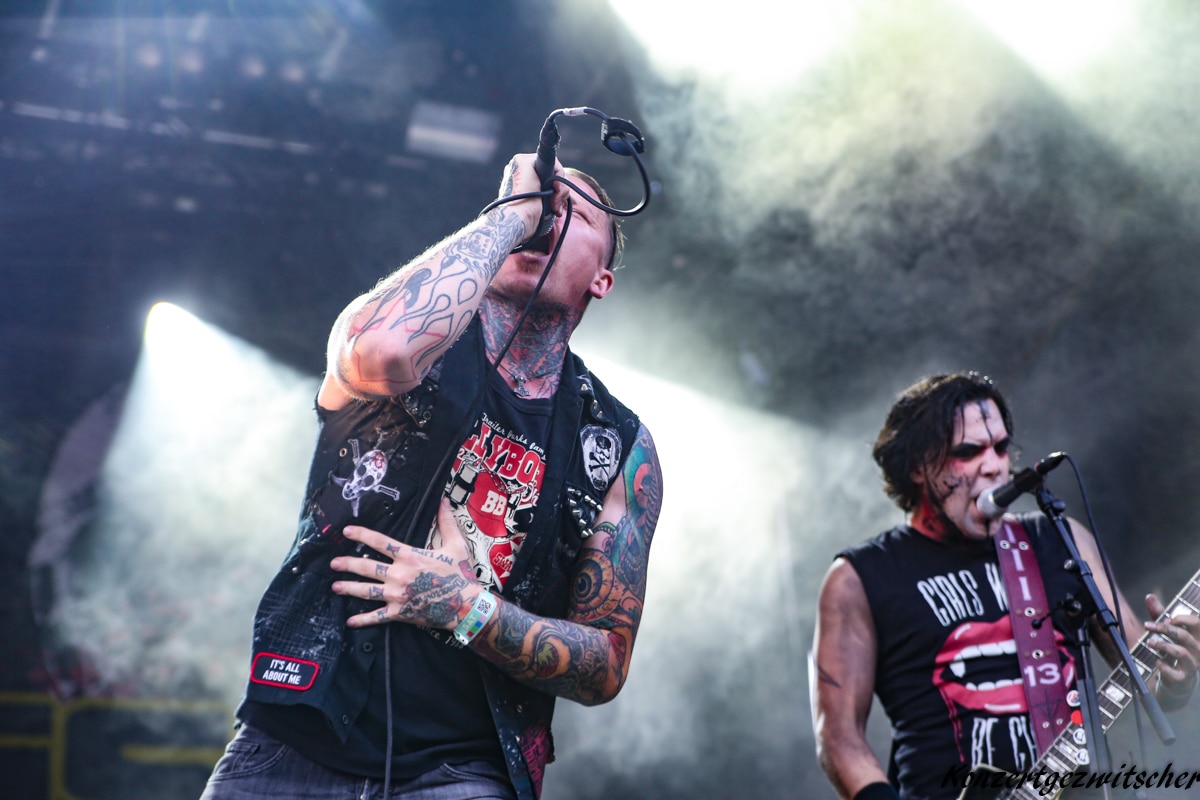 LORD OF THE LOST präsentiert sich auf der Mönch Stage als ein wahres Feuerwerk: Es knallt, es zündet, es hat einen Wahnsinns-Wow-Effekt… Doch nach wenigen Minuten ist der Rauch verzogen und was bleibt, ist nüchterne Realität: Der müssen sich auch Chris Harms und seine Jungs stellen, denn sonderlich viel bleibt nicht von der energiegeladenen Festival-Show mit der die Hanseaten mich vor Kurzen noch vom Hocker gehauen haben. Dabei geht es mit Tracks wie ‚The Love Of God‘, der Single-Auskopplung des Industrial-angehauchten „Empyrean“-Album, genauso gut los wie mit dem Livebrecher (man nenne es fast schon Klassiker) ‚Die Tomorrow‘, der auch auf dem GREENFIELD Festival augenblicklich zündet. Es ist jedoch mehr ein Schwelbrand, der die Erwartungen angesichts der gewohnten Bühnenpräsenz von LORD OF THE LOST immer weiter nährt. Doch auf den explosiven Höhepunkt und den zu erwartenden Abriss der sonst so dynamischen Jungs aus dem Norden Deutschlands warte ich bis zum Schluss umsonst. Ob da jemand träge geworden ist? Es bleibt zu hoffen, dass dies einfach ein falscher Eindruck war, haben sich die Gothic Rocker doch mit dem Wechsel in die Reihen von NAPALM RECORDS aus Österreich gerade erst selbst in eine ganz andere Liga geadelt. COMBICHRIST schafft am letzten Tag das schier Unmögliche: Trotz dreitägiger Strapazen hat Andy LaPlegua das Publikum derart fest im Griff, dass Müdigkeit und Erschöpfung für den Gig der Norweger vollkommen vergessen scheinen. Die Aggrotech-Beats der Jungs gehen direkt in die Beine und das nicht nur im Publikum: Man weiß gar nicht, wo man als Zuschauer hinsehen soll – von Sänger Andy bis hin zum Schlagzeuger Joe Letz stehen hier mit der ganzen Band Profis auf der Bühne, die eine solch beeindruckende Live-Performance hinlegen, dass die kollektive Eskalation vorprogrammiert ist. Mit ihrer direkten und offensiven Art knallen sie einen Song nach dem anderen auf der Bühne hin, ohne aufdringlich oder aggressiv zu wirken, bewahrt COMBICHRIST sich eine Coolness, die nur wenige Bands an diesem Wochenende zeigen. Mit eher lässigen Nummern wie ‚Throat Full Of Glass‘ geben Andy und Co den GREENFIELD Besuchern zwischendurch zwar kurz Zeit, um Luft zu holen – nur um kurz darauf mit dem ‚Skull Crusher‘ den Schweizern den Rest zu geben. Game Over, Baby! Ich ziehe meinen Hut vor COMBICHRIST, so zerlegt man die Mönch Stage schon am Nachmittag par excellence. Wenn ich so darüber nachdenke: Eigentlich schreit das für den nächsten Besuch des Musikprojekts nach einer größeren Bühne…