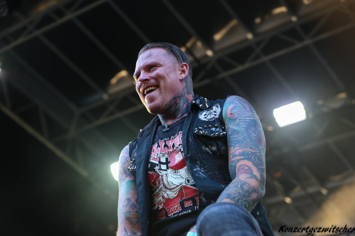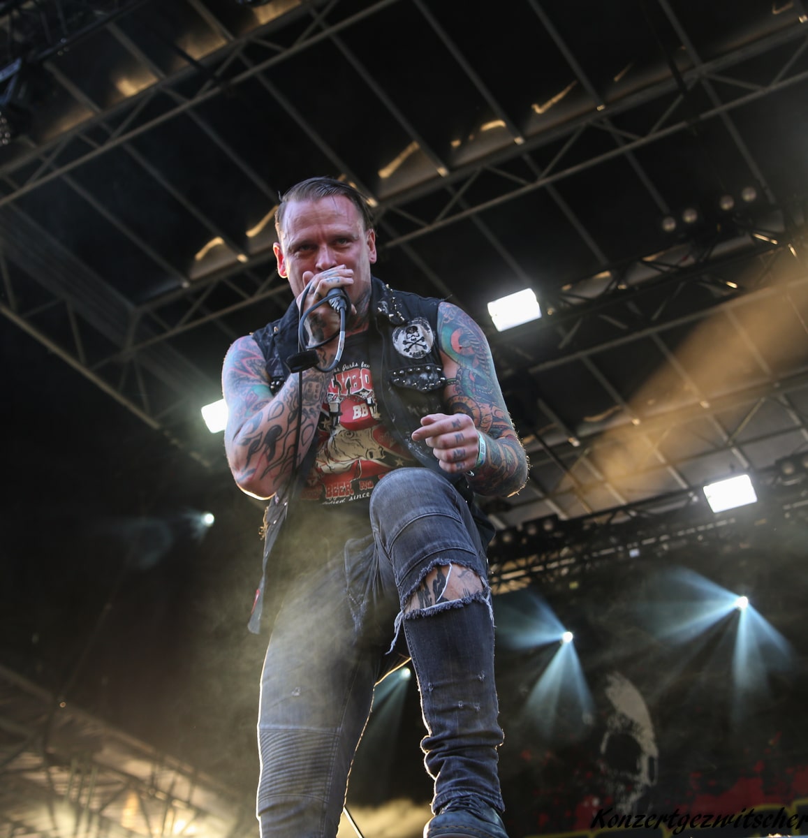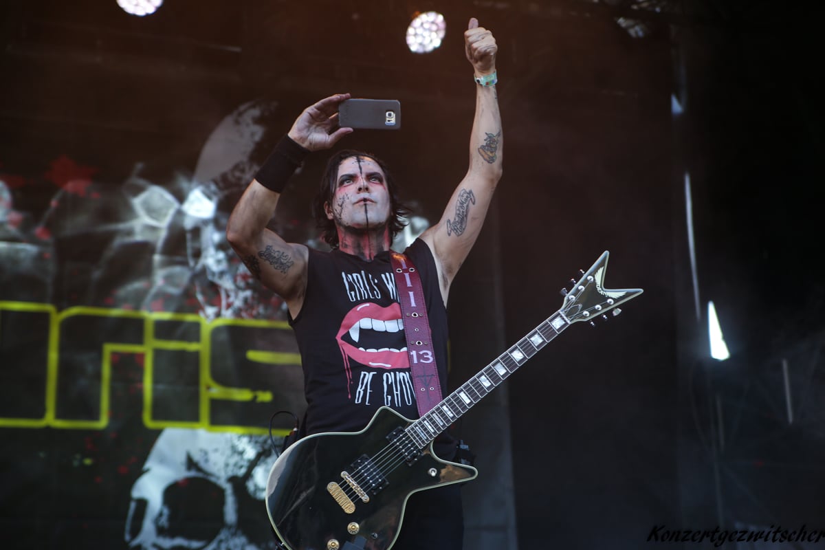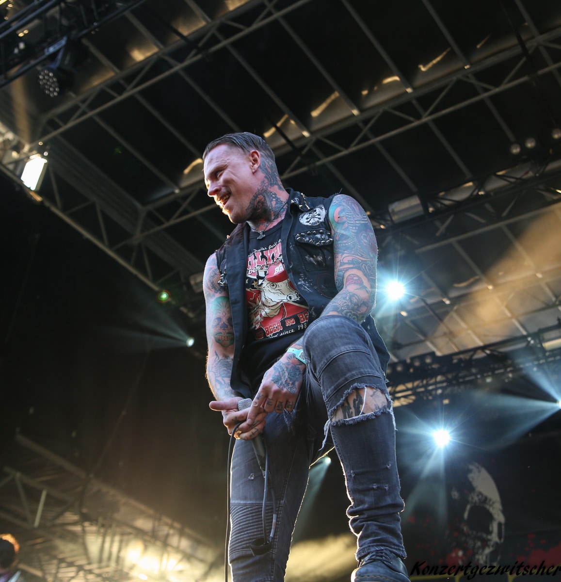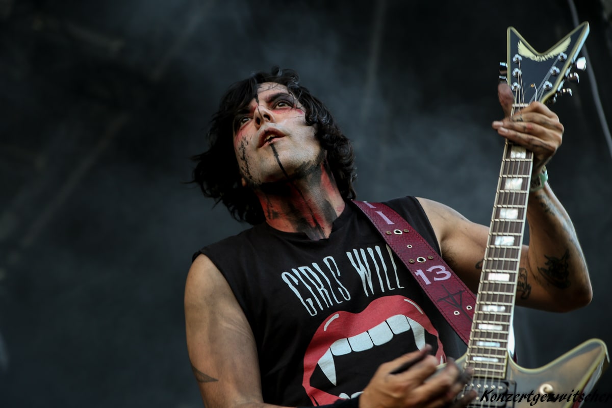 LORD OF THE LOST präsentiert sich auf der Mönch Stage als ein wahres Feuerwerk: Es knallt, es zündet, es hat einen Wahnsinns-Wow-Effekt… Doch nach wenigen Minuten ist der Rauch verzogen und was bleibt, ist nüchterne Realität: Der müssen sich auch Chris Harms und seine Jungs stellen, denn sonderlich viel bleibt nicht von der energiegeladenen Festival-Show mit der die Hanseaten mich vor Kurzen noch vom Hocker gehauen haben. Dabei geht es mit Tracks wie ‚The Love Of God‘, der Single-Auskopplung des Industrial-angehauchten „Empyrean“-Album, genauso gut los wie mit dem Livebrecher (man nenne es fast schon Klassiker) ‚Die Tomorrow‘, der auch auf dem GREENFIELD Festival augenblicklich zündet. Es ist jedoch mehr ein Schwelbrand, der die Erwartungen angesichts der gewohnten Bühnenpräsenz von LORD OF THE LOST immer weiter nährt. Doch auf den explosiven Höhepunkt und den zu erwartenden Abriss der sonst so dynamischen Jungs aus dem Norden Deutschlands warte ich bis zum Schluss umsonst. Ob da jemand träge geworden ist? Es bleibt zu hoffen, dass dies einfach ein falscher Eindruck war, haben sich die Gothic Rocker doch mit dem Wechsel in die Reihen von NAPALM RECORDS aus Österreich gerade erst selbst in eine ganz andere Liga geadelt. COMBICHRIST schafft am letzten Tag das schier Unmögliche: Trotz dreitägiger Strapazen hat Andy LaPlegua das Publikum derart fest im Griff, dass Müdigkeit und Erschöpfung für den Gig der Norweger vollkommen vergessen scheinen. Die Aggrotech-Beats der Jungs gehen direkt in die Beine und das nicht nur im Publikum: Man weiß gar nicht, wo man als Zuschauer hinsehen soll – von Sänger Andy bis hin zum Schlagzeuger Joe Letz stehen hier mit der ganzen Band Profis auf der Bühne, die eine solch beeindruckende Live-Performance hinlegen, dass die kollektive Eskalation vorprogrammiert ist. Mit ihrer direkten und offensiven Art knallen sie einen Song nach dem anderen auf der Bühne hin, ohne aufdringlich oder aggressiv zu wirken, bewahrt COMBICHRIST sich eine Coolness, die nur wenige Bands an diesem Wochenende zeigen. Mit eher lässigen Nummern wie ‚Throat Full Of Glass‘ geben Andy und Co den GREENFIELD Besuchern zwischendurch zwar kurz Zeit, um Luft zu holen – nur um kurz darauf mit dem ‚Skull Crusher‘ den Schweizern den Rest zu geben. Game Over, Baby! Ich ziehe meinen Hut vor COMBICHRIST, so zerlegt man die Mönch Stage schon am Nachmittag par excellence. Wenn ich so darüber nachdenke: Eigentlich schreit das für den nächsten Besuch des Musikprojekts nach einer größeren Bühne…