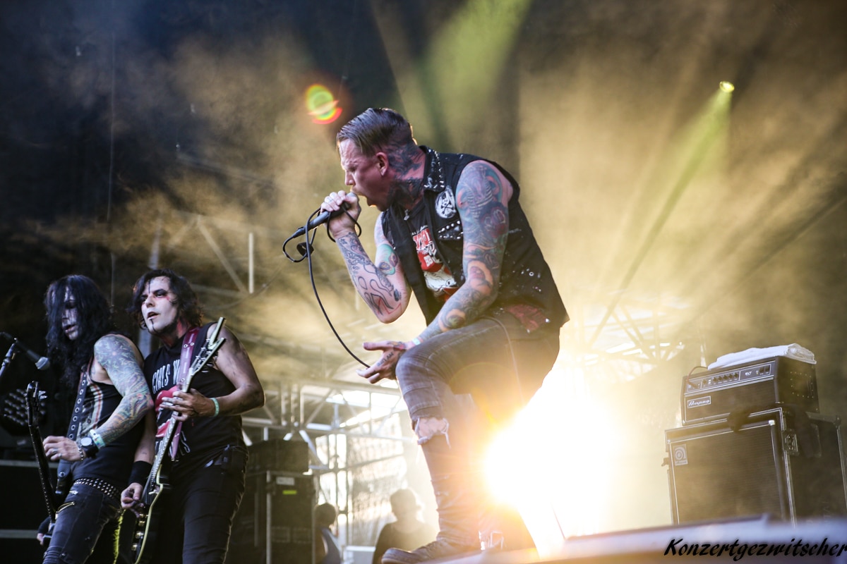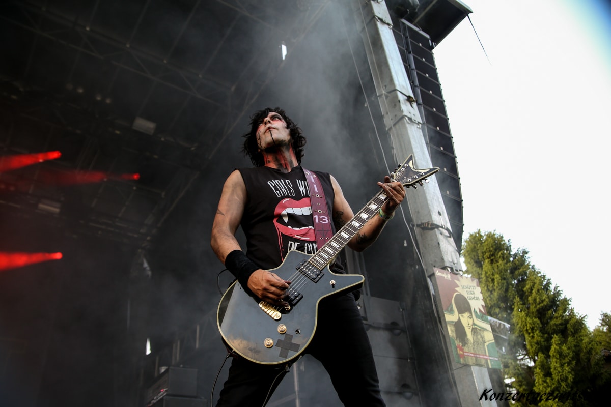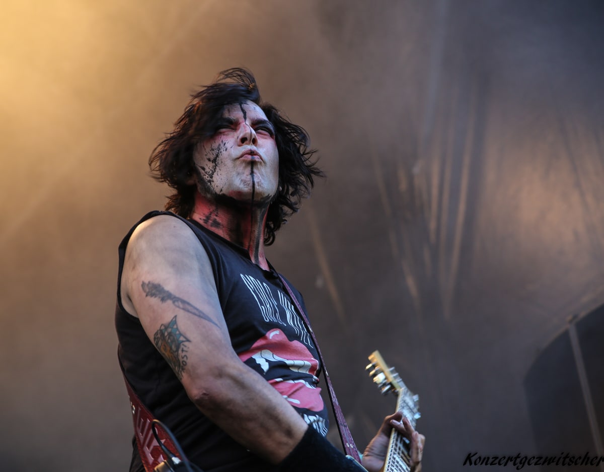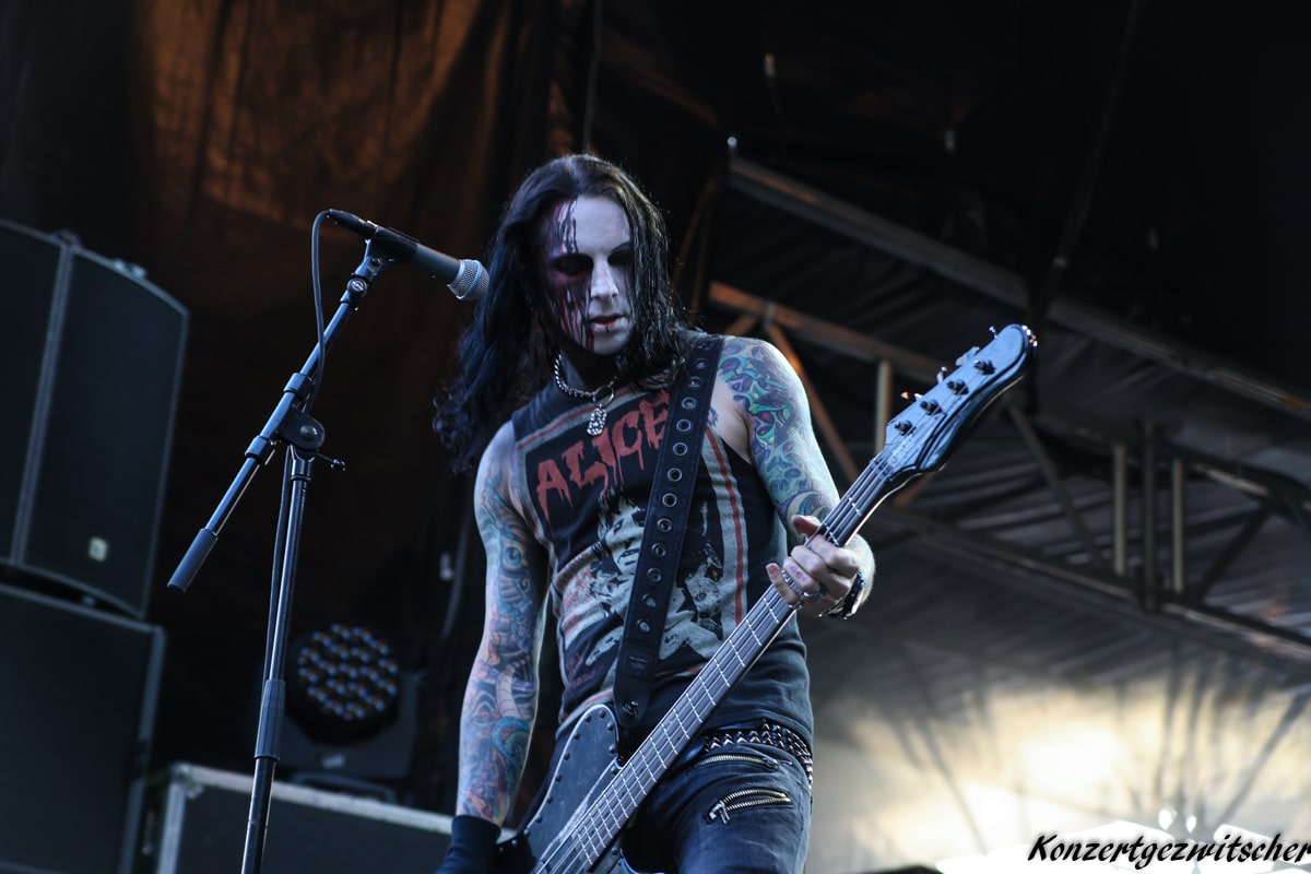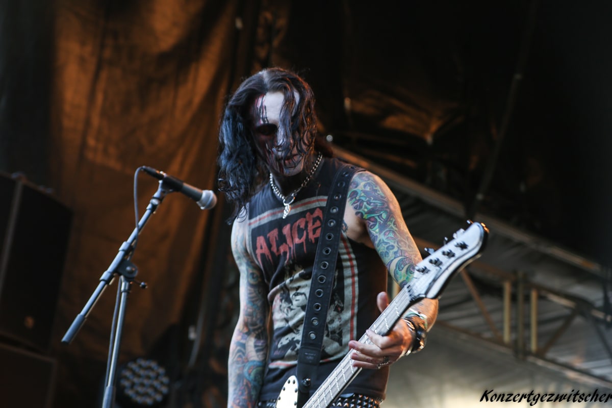 LORD OF THE LOST präsentiert sich auf der Mönch Stage als ein wahres Feuerwerk: Es knallt, es zündet, es hat einen Wahnsinns-Wow-Effekt… Doch nach wenigen Minuten ist der Rauch verzogen und was bleibt, ist nüchterne Realität: Der müssen sich auch Chris Harms und seine Jungs stellen, denn sonderlich viel bleibt nicht von der energiegeladenen Festival-Show mit der die Hanseaten mich vor Kurzen noch vom Hocker gehauen haben. Dabei geht es mit Tracks wie ‚The Love Of God‘, der Single-Auskopplung des Industrial-angehauchten „Empyrean“-Album, genauso gut los wie mit dem Livebrecher (man nenne es fast schon Klassiker) ‚Die Tomorrow‘, der auch auf dem GREENFIELD Festival augenblicklich zündet. Es ist jedoch mehr ein Schwelbrand, der die Erwartungen angesichts der gewohnten Bühnenpräsenz von LORD OF THE LOST immer weiter nährt. Doch auf den explosiven Höhepunkt und den zu erwartenden Abriss der sonst so dynamischen Jungs aus dem Norden Deutschlands warte ich bis zum Schluss umsonst. Ob da jemand träge geworden ist? Es bleibt zu hoffen, dass dies einfach ein falscher Eindruck war, haben sich die Gothic Rocker doch mit dem Wechsel in die Reihen von NAPALM RECORDS aus Österreich gerade erst selbst in eine ganz andere Liga geadelt. COMBICHRIST schafft am letzten Tag das schier Unmögliche: Trotz dreitägiger Strapazen hat Andy LaPlegua das Publikum derart fest im Griff, dass Müdigkeit und Erschöpfung für den Gig der Norweger vollkommen vergessen scheinen. Die Aggrotech-Beats der Jungs gehen direkt in die Beine und das nicht nur im Publikum: Man weiß gar nicht, wo man als Zuschauer hinsehen soll – von Sänger Andy bis hin zum Schlagzeuger Joe Letz stehen hier mit der ganzen Band Profis auf der Bühne, die eine solch beeindruckende Live-Performance hinlegen, dass die kollektive Eskalation vorprogrammiert ist. Mit ihrer direkten und offensiven Art knallen sie einen Song nach dem anderen auf der Bühne hin, ohne aufdringlich oder aggressiv zu wirken, bewahrt COMBICHRIST sich eine Coolness, die nur wenige Bands an diesem Wochenende zeigen. Mit eher lässigen Nummern wie ‚Throat Full Of Glass‘ geben Andy und Co den GREENFIELD Besuchern zwischendurch zwar kurz Zeit, um Luft zu holen – nur um kurz darauf mit dem ‚Skull Crusher‘ den Schweizern den Rest zu geben. Game Over, Baby! Ich ziehe meinen Hut vor COMBICHRIST, so zerlegt man die Mönch Stage schon am Nachmittag par excellence. Wenn ich so darüber nachdenke: Eigentlich schreit das für den nächsten Besuch des Musikprojekts nach einer größeren Bühne…