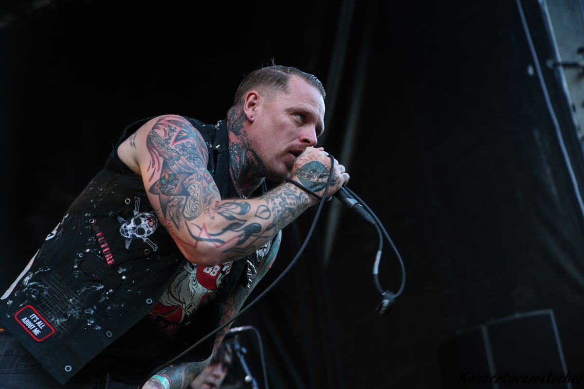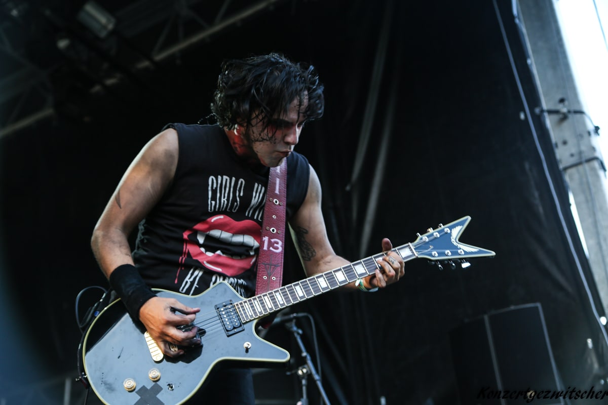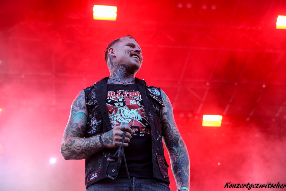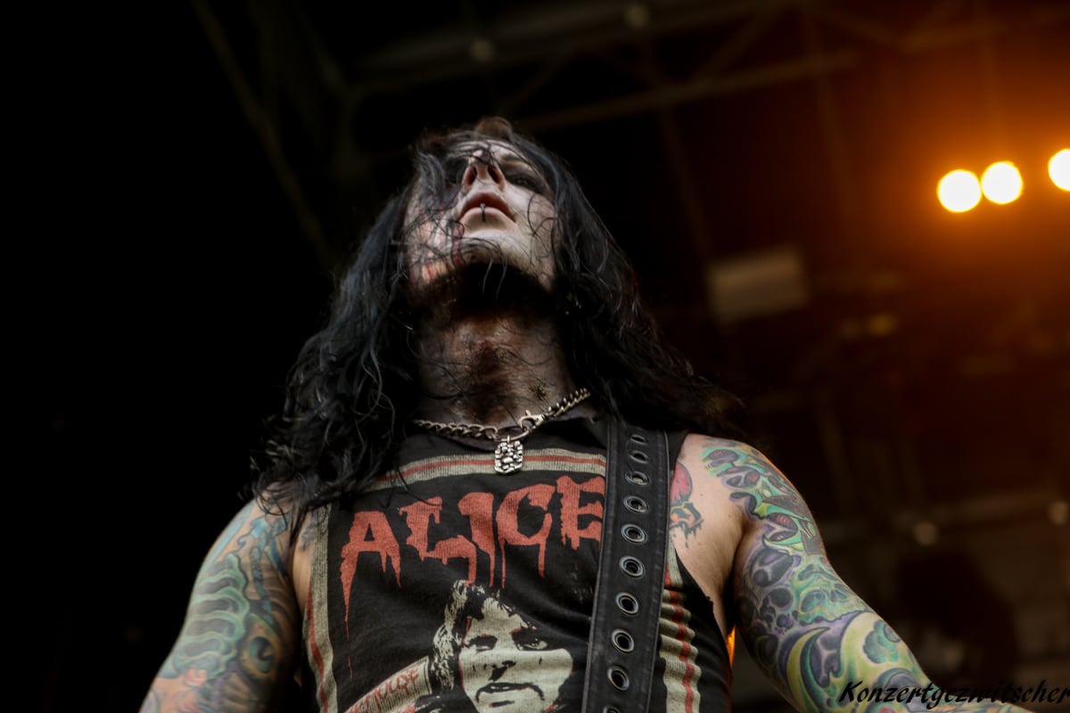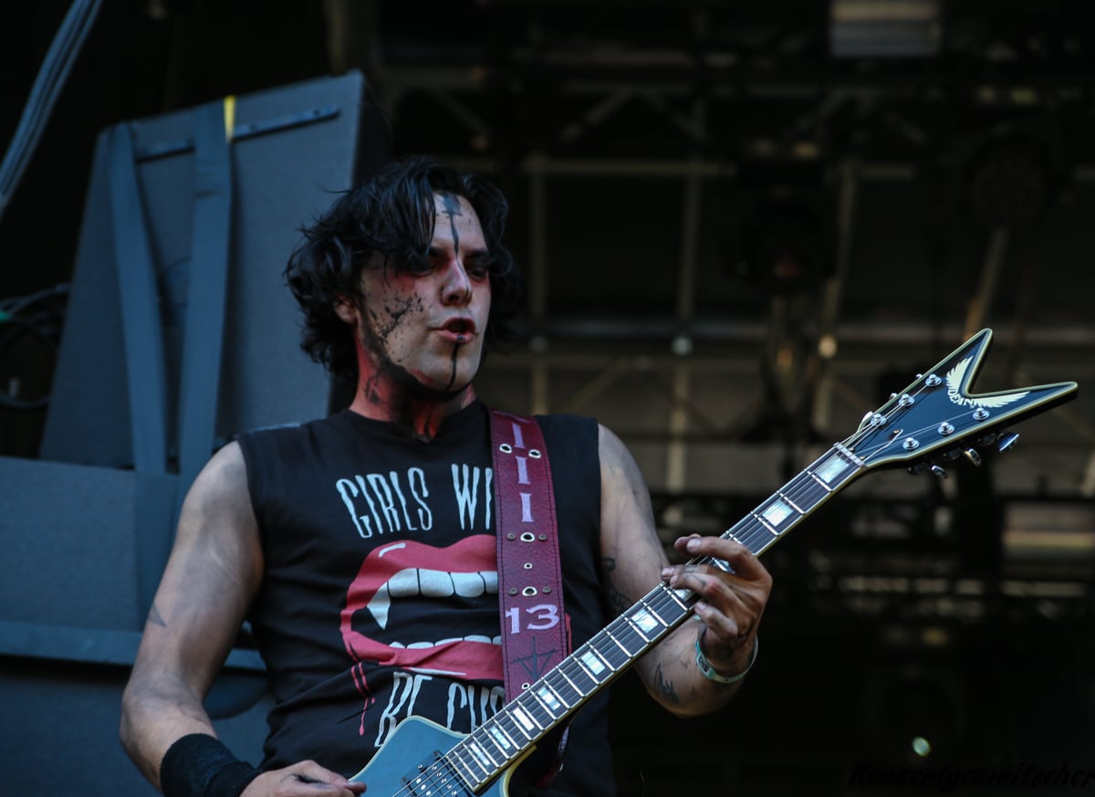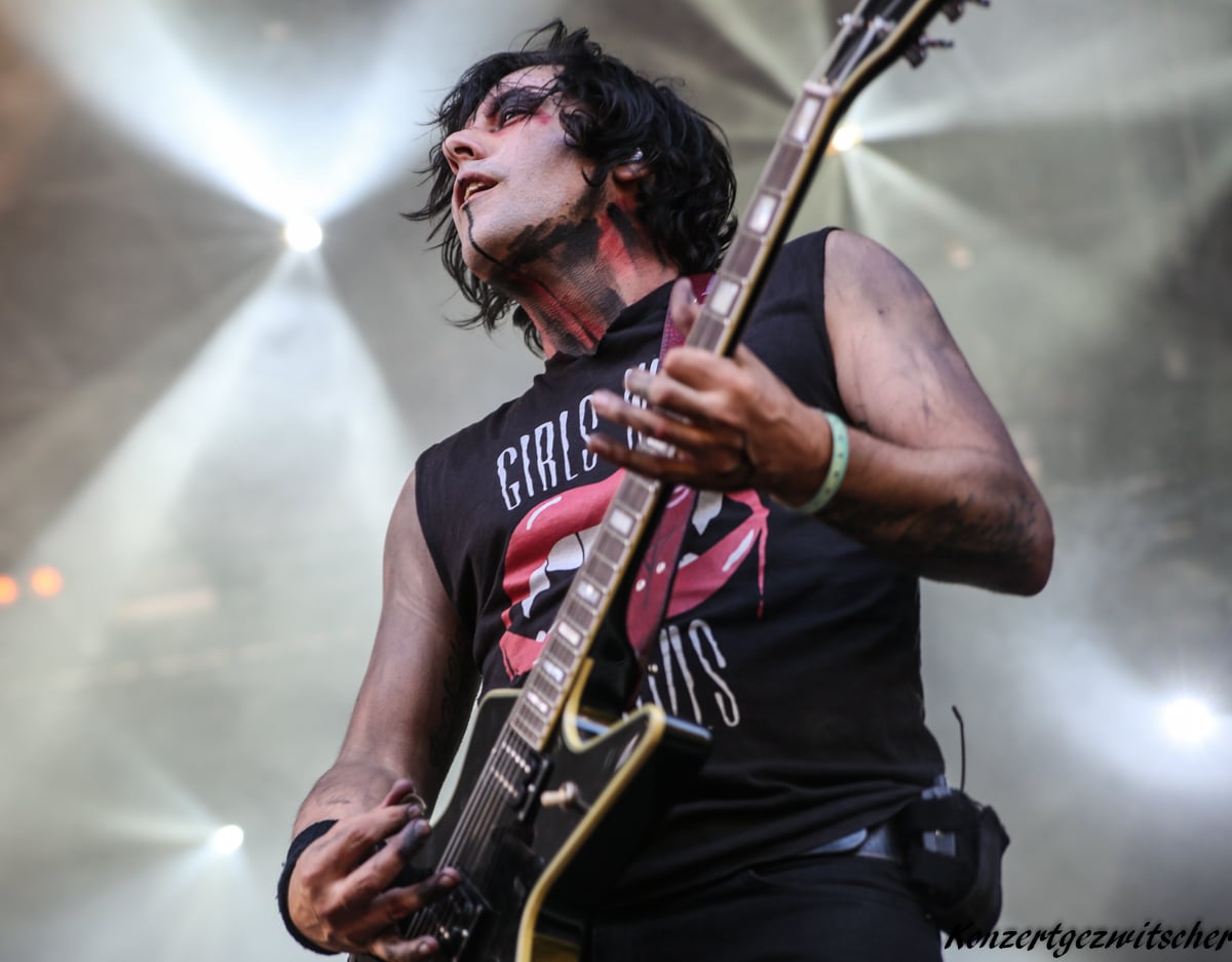 LORD OF THE LOST präsentiert sich auf der Mönch Stage als ein wahres Feuerwerk: Es knallt, es zündet, es hat einen Wahnsinns-Wow-Effekt… Doch nach wenigen Minuten ist der Rauch verzogen und was bleibt, ist nüchterne Realität: Der müssen sich auch Chris Harms und seine Jungs stellen, denn sonderlich viel bleibt nicht von der energiegeladenen Festival-Show mit der die Hanseaten mich vor Kurzen noch vom Hocker gehauen haben. Dabei geht es mit Tracks wie ‚The Love Of God‘, der Single-Auskopplung des Industrial-angehauchten „Empyrean“-Album, genauso gut los wie mit dem Livebrecher (man nenne es fast schon Klassiker) ‚Die Tomorrow‘, der auch auf dem GREENFIELD Festival augenblicklich zündet. Es ist jedoch mehr ein Schwelbrand, der die Erwartungen angesichts der gewohnten Bühnenpräsenz von LORD OF THE LOST immer weiter nährt. Doch auf den explosiven Höhepunkt und den zu erwartenden Abriss der sonst so dynamischen Jungs aus dem Norden Deutschlands warte ich bis zum Schluss umsonst. Ob da jemand träge geworden ist? Es bleibt zu hoffen, dass dies einfach ein falscher Eindruck war, haben sich die Gothic Rocker doch mit dem Wechsel in die Reihen von NAPALM RECORDS aus Österreich gerade erst selbst in eine ganz andere Liga geadelt. COMBICHRIST schafft am letzten Tag das schier Unmögliche: Trotz dreitägiger Strapazen hat Andy LaPlegua das Publikum derart fest im Griff, dass Müdigkeit und Erschöpfung für den Gig der Norweger vollkommen vergessen scheinen. Die Aggrotech-Beats der Jungs gehen direkt in die Beine und das nicht nur im Publikum: Man weiß gar nicht, wo man als Zuschauer hinsehen soll – von Sänger Andy bis hin zum Schlagzeuger Joe Letz stehen hier mit der ganzen Band Profis auf der Bühne, die eine solch beeindruckende Live-Performance hinlegen, dass die kollektive Eskalation vorprogrammiert ist. Mit ihrer direkten und offensiven Art knallen sie einen Song nach dem anderen auf der Bühne hin, ohne aufdringlich oder aggressiv zu wirken, bewahrt COMBICHRIST sich eine Coolness, die nur wenige Bands an diesem Wochenende zeigen. Mit eher lässigen Nummern wie ‚Throat Full Of Glass‘ geben Andy und Co den GREENFIELD Besuchern zwischendurch zwar kurz Zeit, um Luft zu holen – nur um kurz darauf mit dem ‚Skull Crusher‘ den Schweizern den Rest zu geben. Game Over, Baby! Ich ziehe meinen Hut vor COMBICHRIST, so zerlegt man die Mönch Stage schon am Nachmittag par excellence. Wenn ich so darüber nachdenke: Eigentlich schreit das für den nächsten Besuch des Musikprojekts nach einer größeren Bühne…
