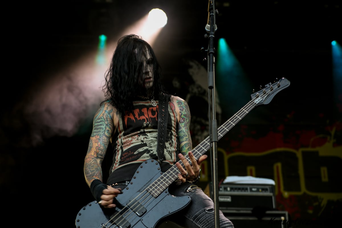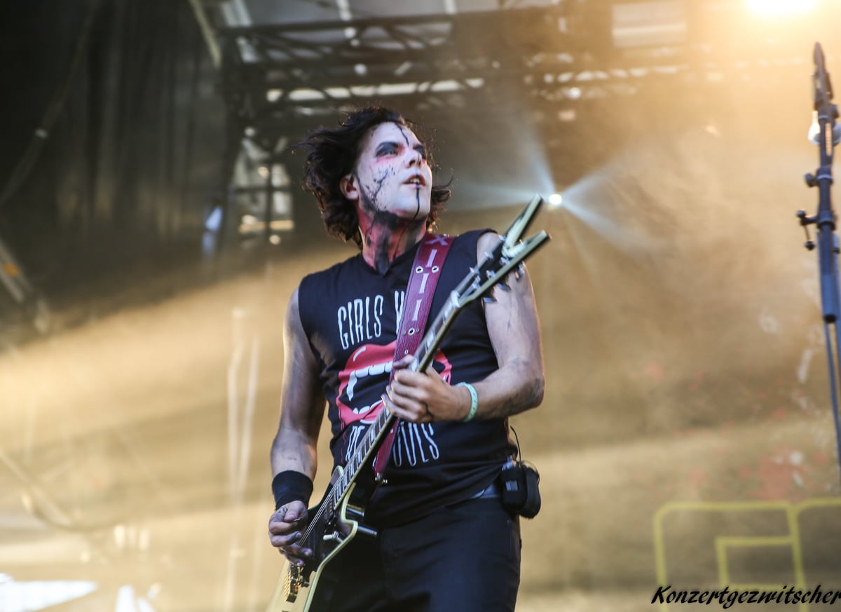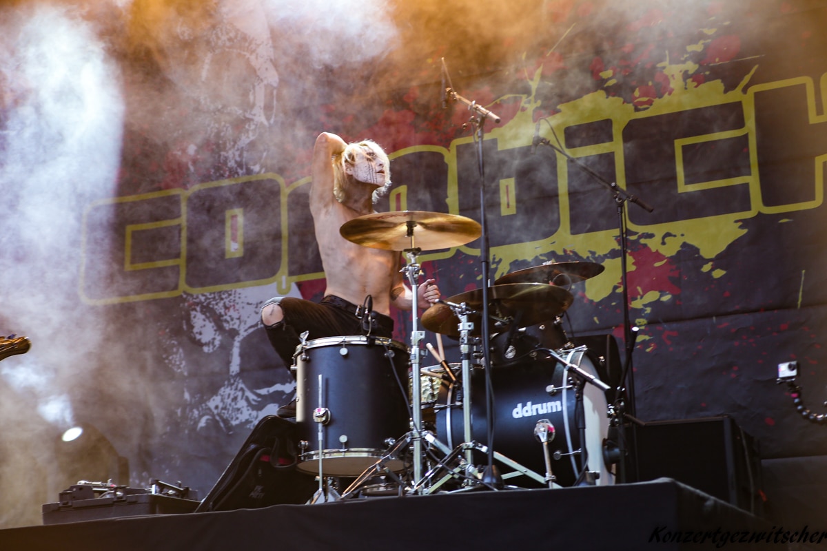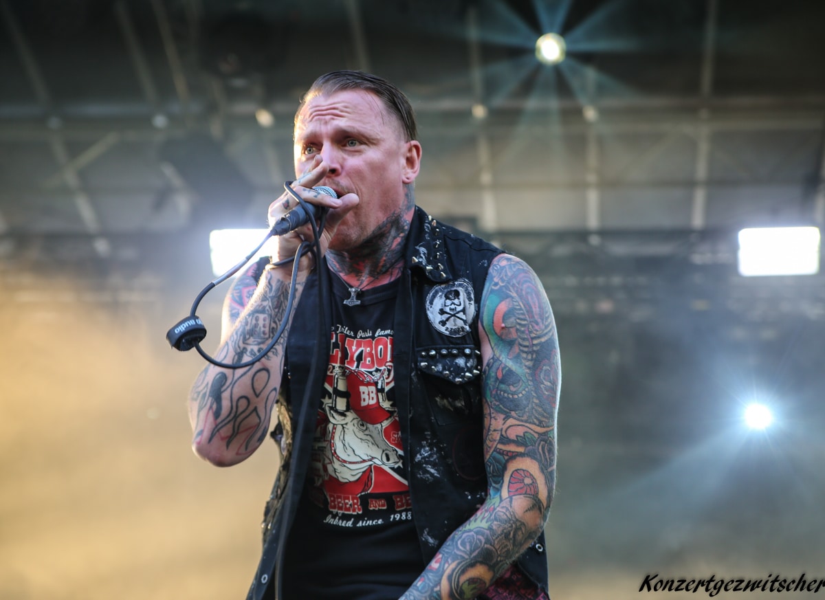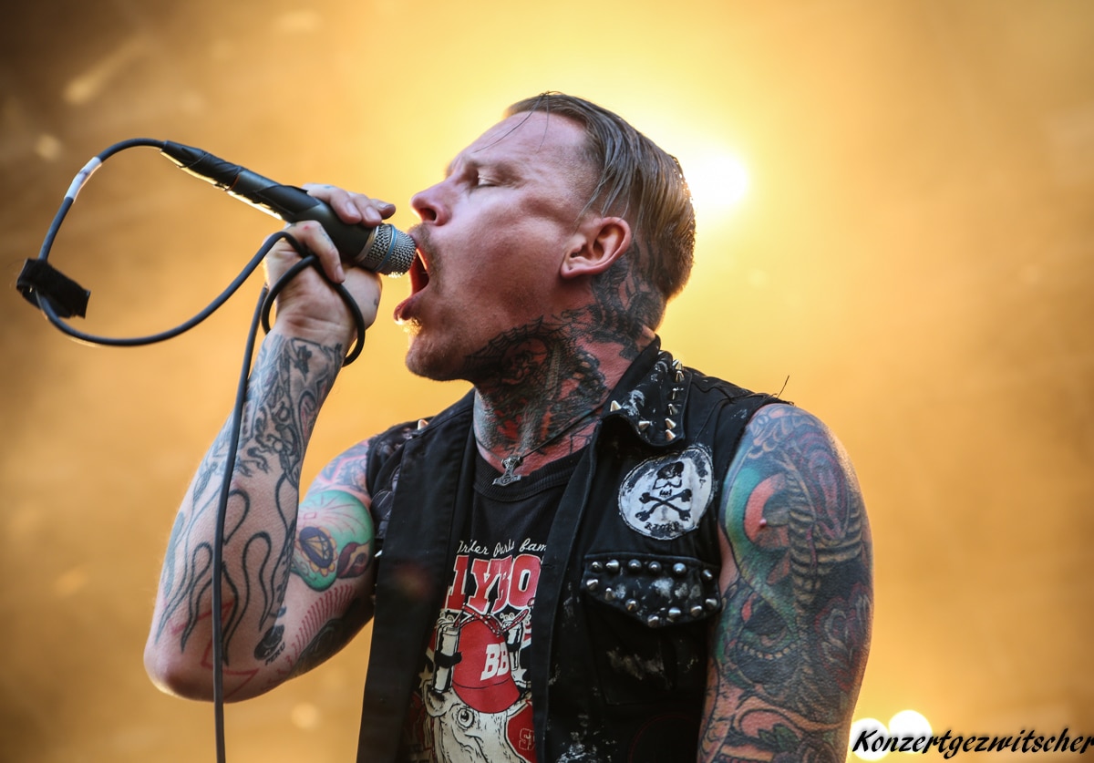 LORD OF THE LOST präsentiert sich auf der Mönch Stage als ein wahres Feuerwerk: Es knallt, es zündet, es hat einen Wahnsinns-Wow-Effekt… Doch nach wenigen Minuten ist der Rauch verzogen und was bleibt, ist nüchterne Realität: Der müssen sich auch Chris Harms und seine Jungs stellen, denn sonderlich viel bleibt nicht von der energiegeladenen Festival-Show mit der die Hanseaten mich vor Kurzen noch vom Hocker gehauen haben. Dabei geht es mit Tracks wie ‚The Love Of God‘, der Single-Auskopplung des Industrial-angehauchten „Empyrean“-Album, genauso gut los wie mit dem Livebrecher (man nenne es fast schon Klassiker) ‚Die Tomorrow‘, der auch auf dem GREENFIELD Festival augenblicklich zündet. Es ist jedoch mehr ein Schwelbrand, der die Erwartungen angesichts der gewohnten Bühnenpräsenz von LORD OF THE LOST immer weiter nährt. Doch auf den explosiven Höhepunkt und den zu erwartenden Abriss der sonst so dynamischen Jungs aus dem Norden Deutschlands warte ich bis zum Schluss umsonst. Ob da jemand träge geworden ist? Es bleibt zu hoffen, dass dies einfach ein falscher Eindruck war, haben sich die Gothic Rocker doch mit dem Wechsel in die Reihen von NAPALM RECORDS aus Österreich gerade erst selbst in eine ganz andere Liga geadelt. COMBICHRIST schafft am letzten Tag das schier Unmögliche: Trotz dreitägiger Strapazen hat Andy LaPlegua das Publikum derart fest im Griff, dass Müdigkeit und Erschöpfung für den Gig der Norweger vollkommen vergessen scheinen. Die Aggrotech-Beats der Jungs gehen direkt in die Beine und das nicht nur im Publikum: Man weiß gar nicht, wo man als Zuschauer hinsehen soll – von Sänger Andy bis hin zum Schlagzeuger Joe Letz stehen hier mit der ganzen Band Profis auf der Bühne, die eine solch beeindruckende Live-Performance hinlegen, dass die kollektive Eskalation vorprogrammiert ist. Mit ihrer direkten und offensiven Art knallen sie einen Song nach dem anderen auf der Bühne hin, ohne aufdringlich oder aggressiv zu wirken, bewahrt COMBICHRIST sich eine Coolness, die nur wenige Bands an diesem Wochenende zeigen. Mit eher lässigen Nummern wie ‚Throat Full Of Glass‘ geben Andy und Co den GREENFIELD Besuchern zwischendurch zwar kurz Zeit, um Luft zu holen – nur um kurz darauf mit dem ‚Skull Crusher‘ den Schweizern den Rest zu geben. Game Over, Baby! Ich ziehe meinen Hut vor COMBICHRIST, so zerlegt man die Mönch Stage schon am Nachmittag par excellence. Wenn ich so darüber nachdenke: Eigentlich schreit das für den nächsten Besuch des Musikprojekts nach einer größeren Bühne…