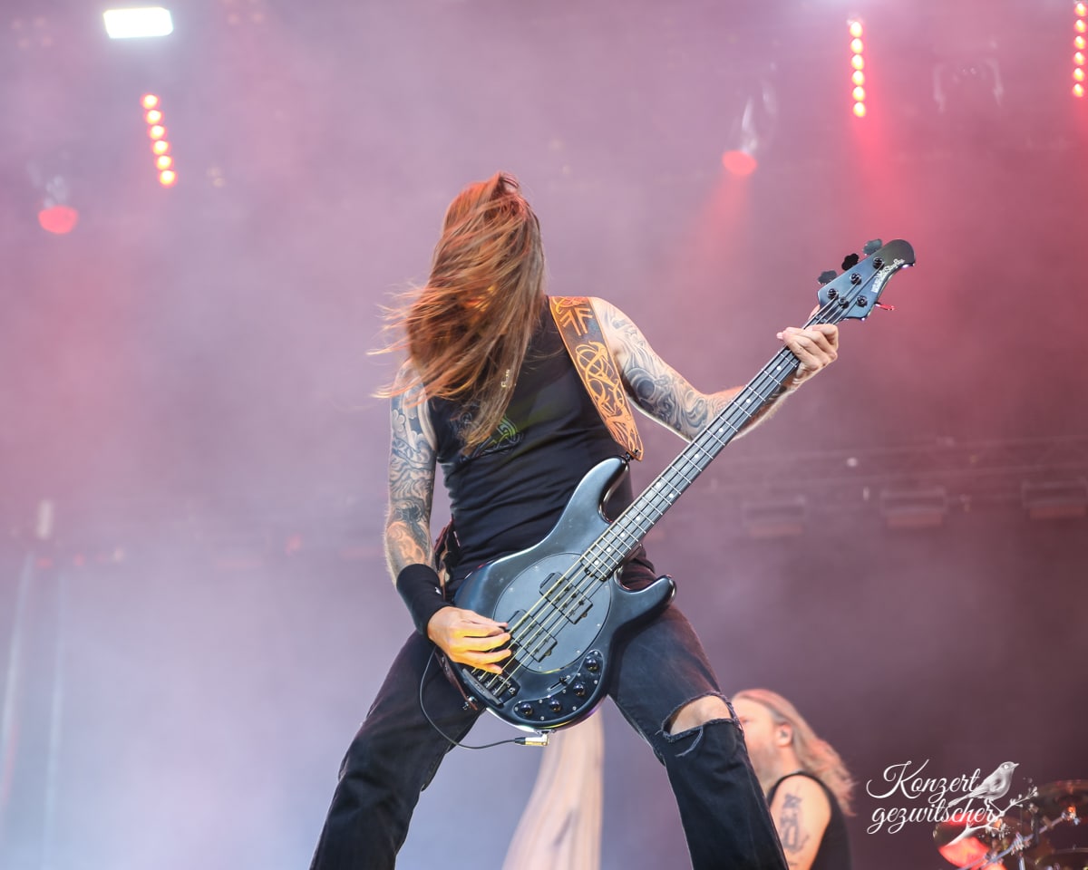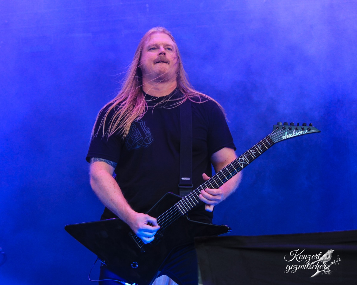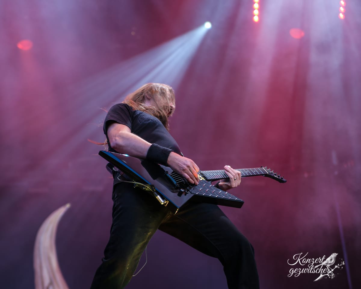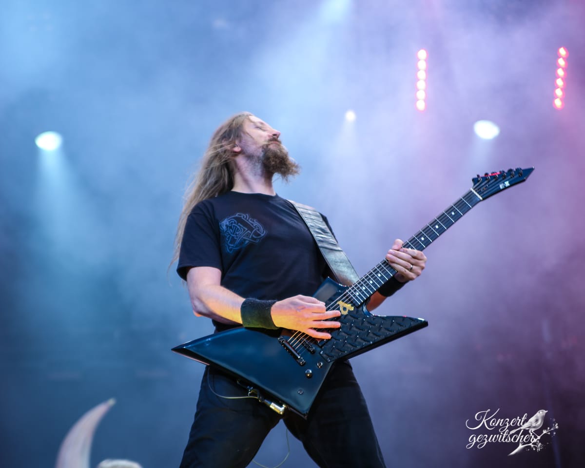 Raise Your Horns, WACKEN! Was für eine Bühnenpräsenz! Die Wikinger erobern den hohen Norden und haben das Festival ruckzuck fest in der Hand. Es genügt eine kurze Handbewegung von Sänger Johan Hegg und tausende folgen seinem Ruf. Ein unglaubliches Schauspiel vor dem stilisierten Wikingerhelm, der das Bühnenbild der Schweden darstellt. Es entwickelt sich eine Eigendynamik, von der AMON AMARTH selbst überwältigt zu sein scheint, dem seligen Lächeln und Strahlen der Musiker nach. Doch diese Begeisterung haben sich die Herren auch verdient: Authentisch und mit einer wilden, brachialen Attitude, AMON AMARTH zeigen sich auf dem WACKEN OPEN AIR als echte Publikumslieblinge, denen man jedes einzelne Wort, das sie auf der Bühne singen, bedingungslos glaubt. Dazu noch der gutturale Gesang von Johan Hegg – einer der wenigen Männer, die mich anschreien dürfen und ich erwische mich selbst dabei, wie ich vor lauter Begeisterung vergesse, zu fotografieren. Sie faszinieren eben auch heute noch, die stolzen Helden und heroischen Krieger der Wikinger.