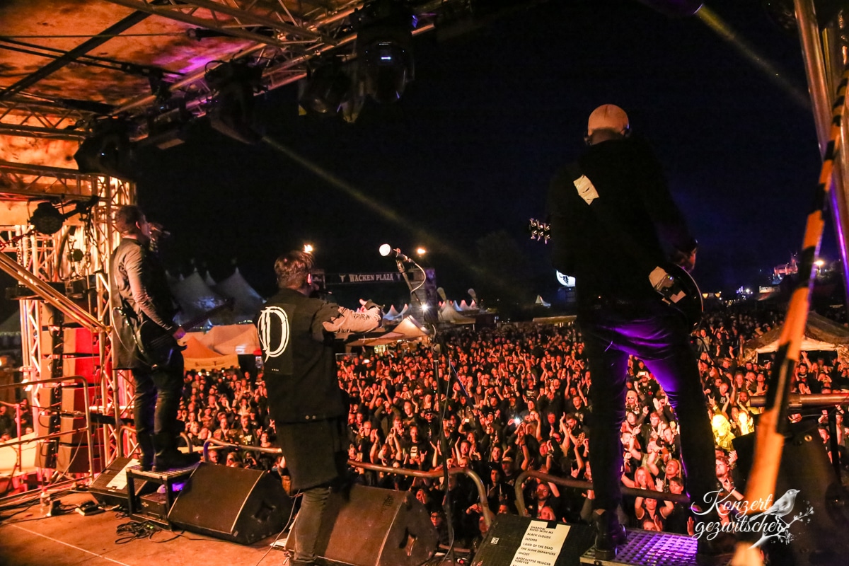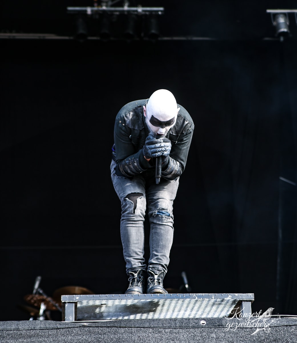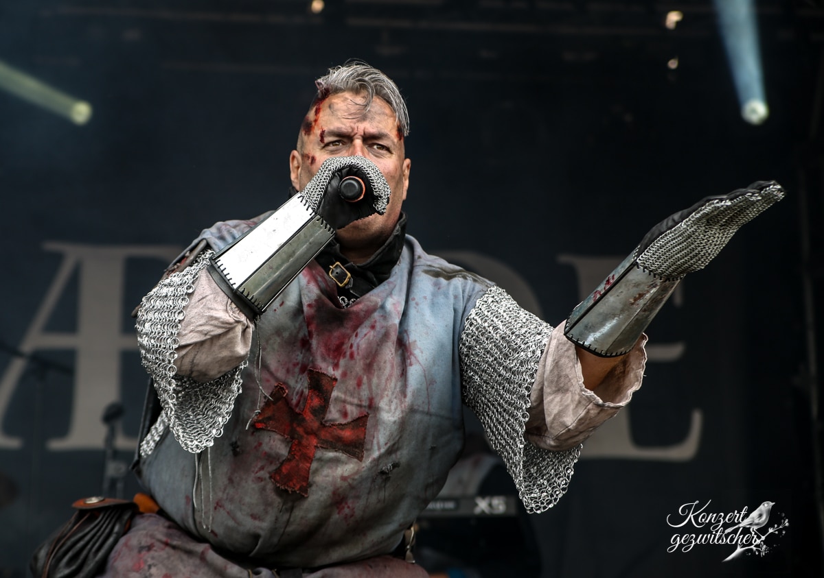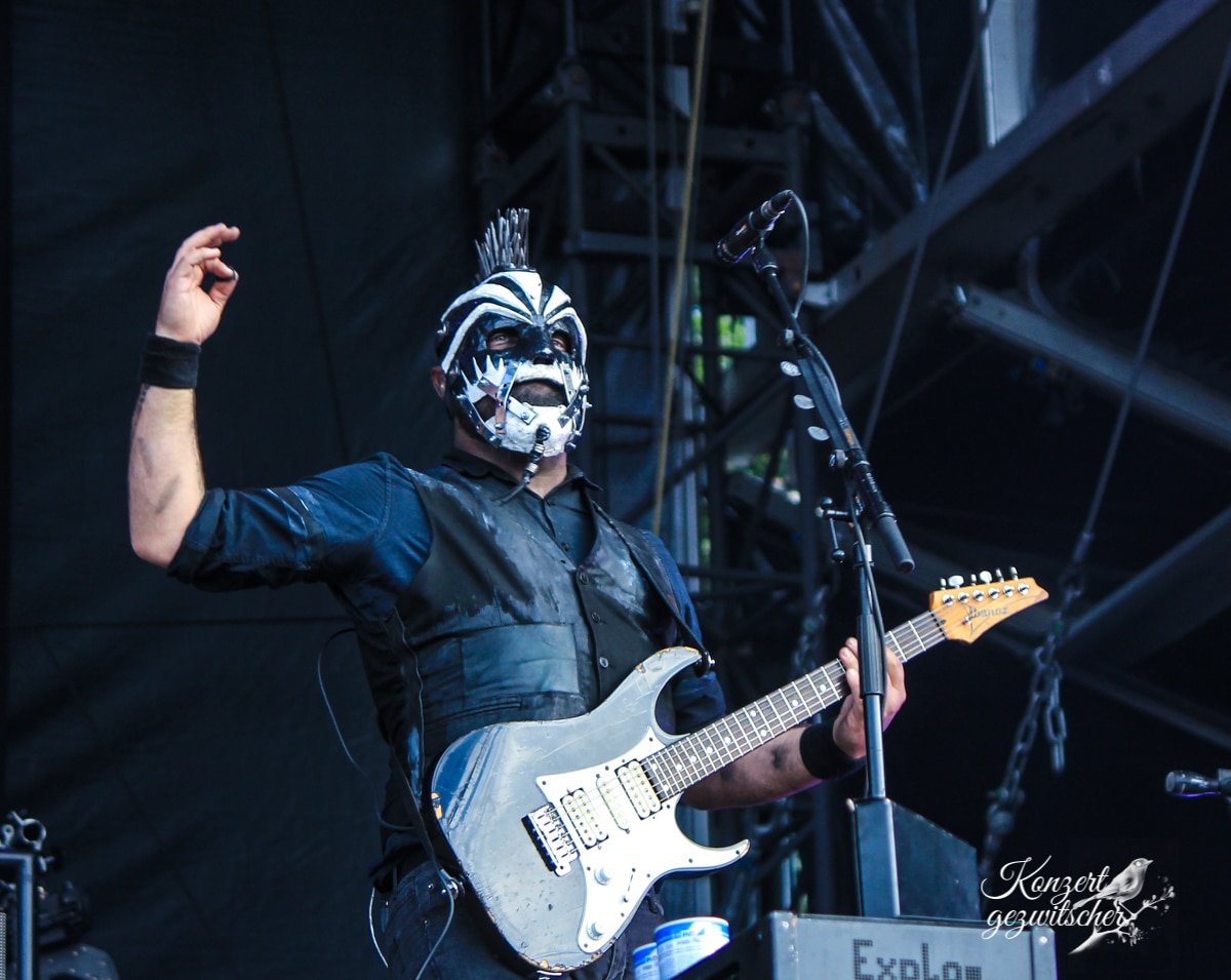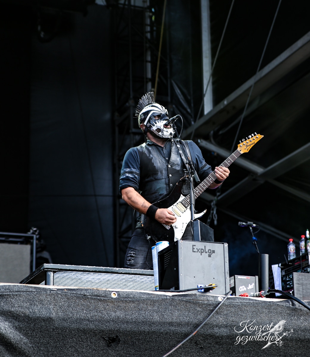 Ist das Kunst oder kann das weg? Die Frage, die HÄMATOM sich auf der aktuellen Platte der Band („Wir sind Gott“) stellt, beantworten Nord, Süd, Ost und West sich auf der Louder Stage selbst. Ohne Möglichkeit zum Widerstand fegen die Herrschaften jegliche Einsprüche mit ihrem brachial-aggressiven, bärbeißigen Sound hinweg – es wummern die Bässe, es knallt, zischt und angesichts des frenetischen Jubels, noch bevor die Musik einsetzt, ist schnell klar: Es kommt was Großes auf uns zu. Mit dem epischen ‚Wir sind Gott‘ präsentiert sich HÄMATOM von der ersten Sekunde als souverän, gewohnt rotzfrech und musikalisch auf einer nahezu olympischen Stufe. Rauchsäulen, die Pyro an Wests Maske oder ein Funkenregen zur letzten Zeile von ‚All You Need Is Love‘ („…und ein bisschen Sprengstoff“): Die NDH-Band zieht alle Register um nach dem Auftritt im vergangenen Jahr ihr Denkmal auf dem WACKEN OPEN AIR endgültig zu zementieren. Dabei greift bei dem Auftritt von HÄMATOM echt ein Zahnrad ins andere: Eine wahnsinnig präsente Band, Nord als Sänger in Höchstform und dazu eine überwältigende Live-Show – raus kommt eine Walze, die das Publikum schier überrollt und sämtlichen anderen Bands, die parallel spielen, das Bestehen ganz schön schwer macht.