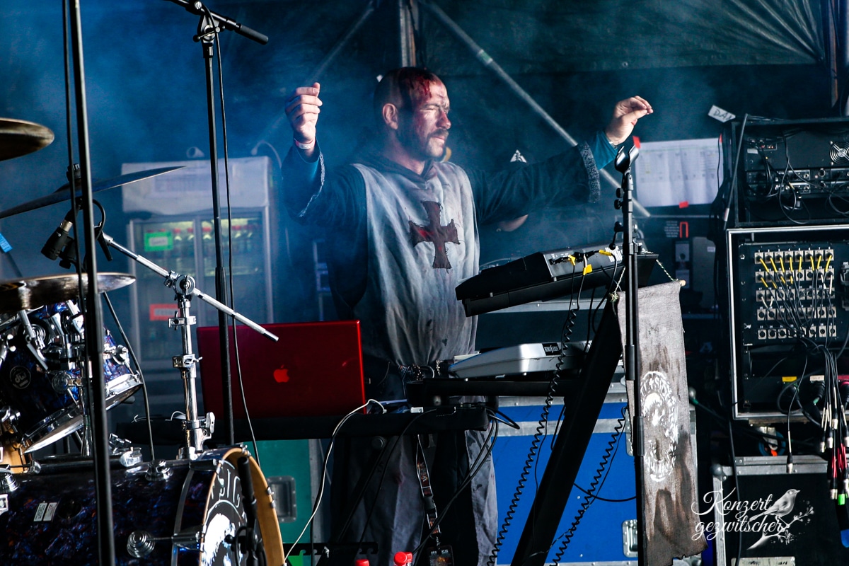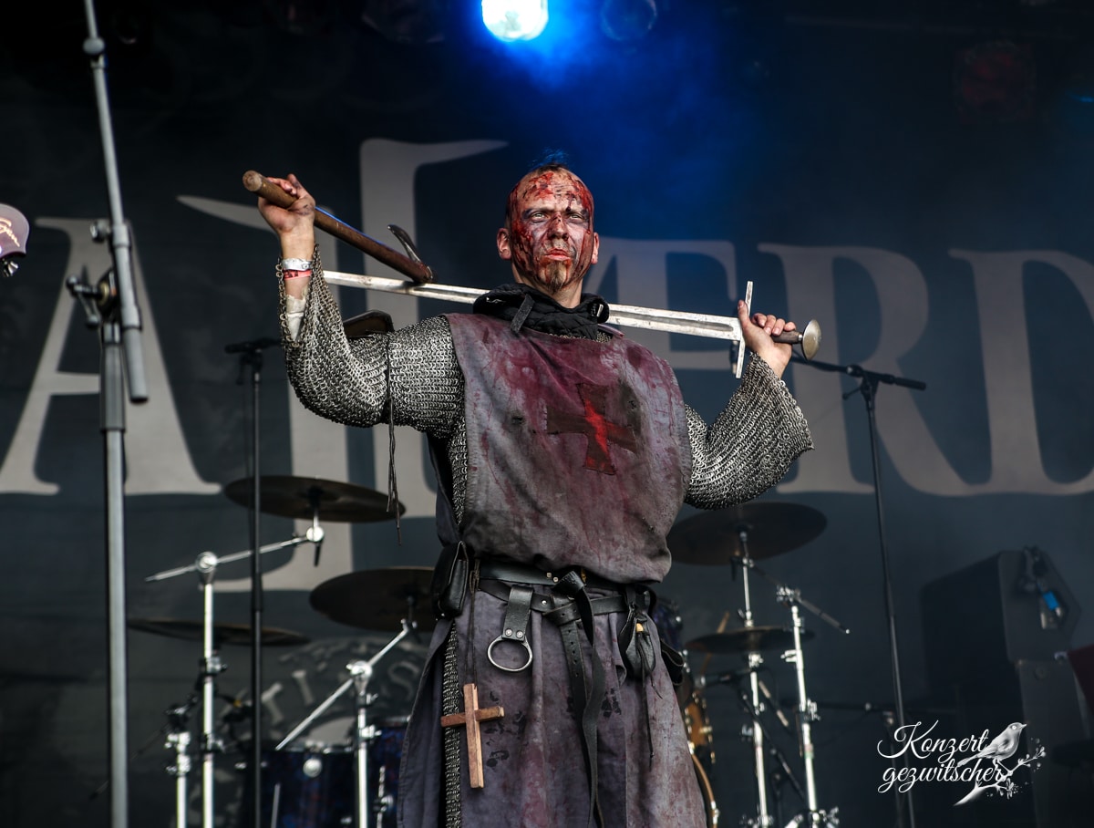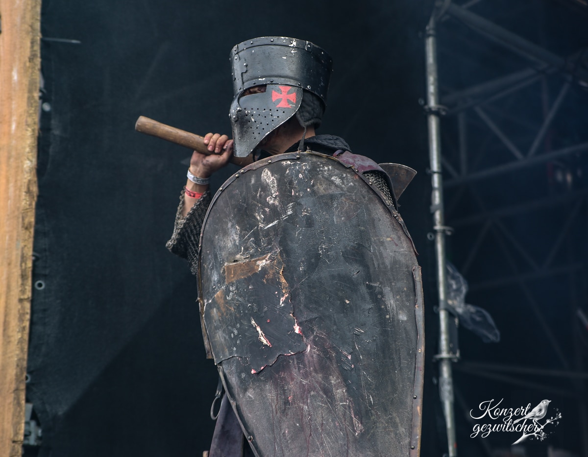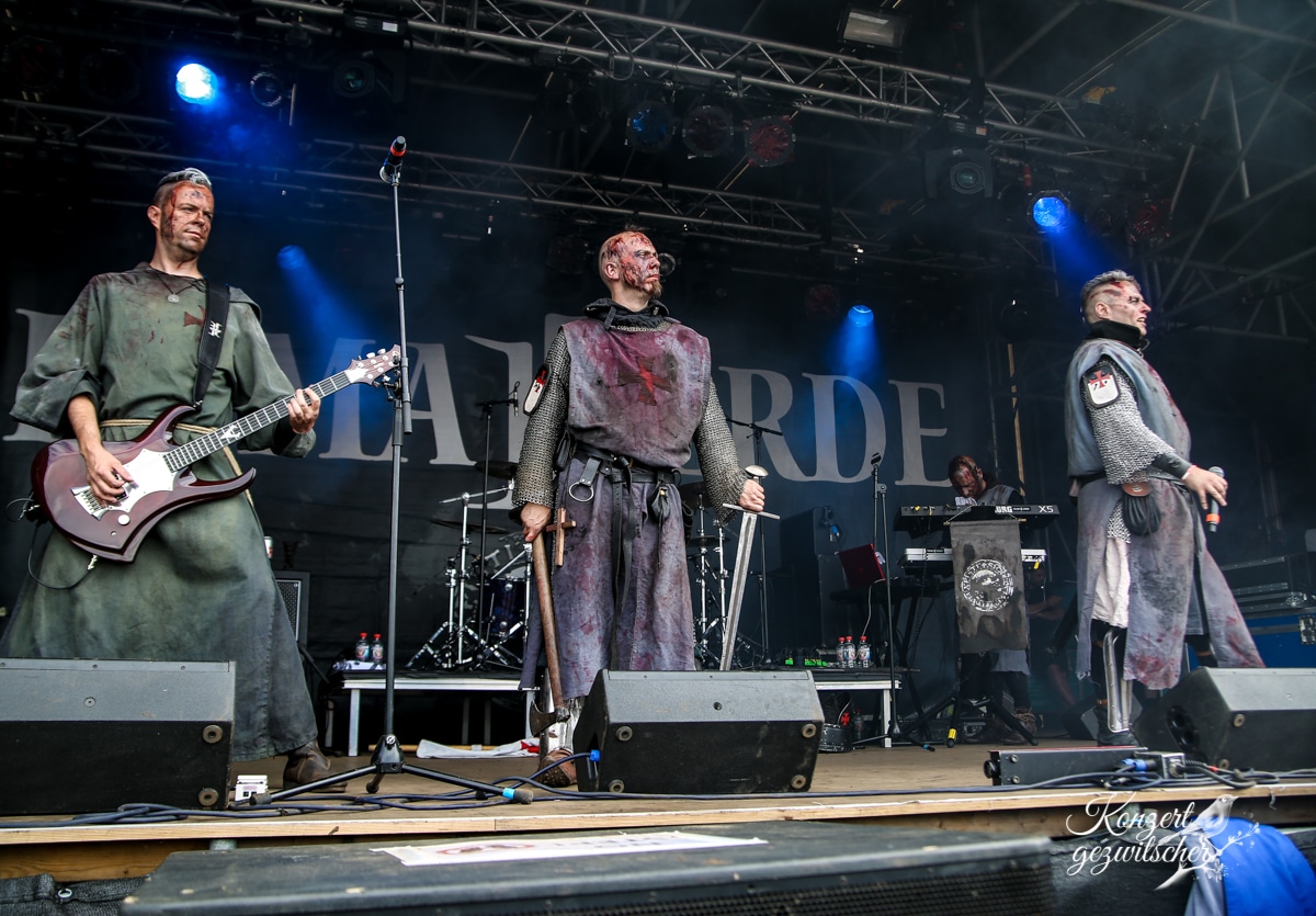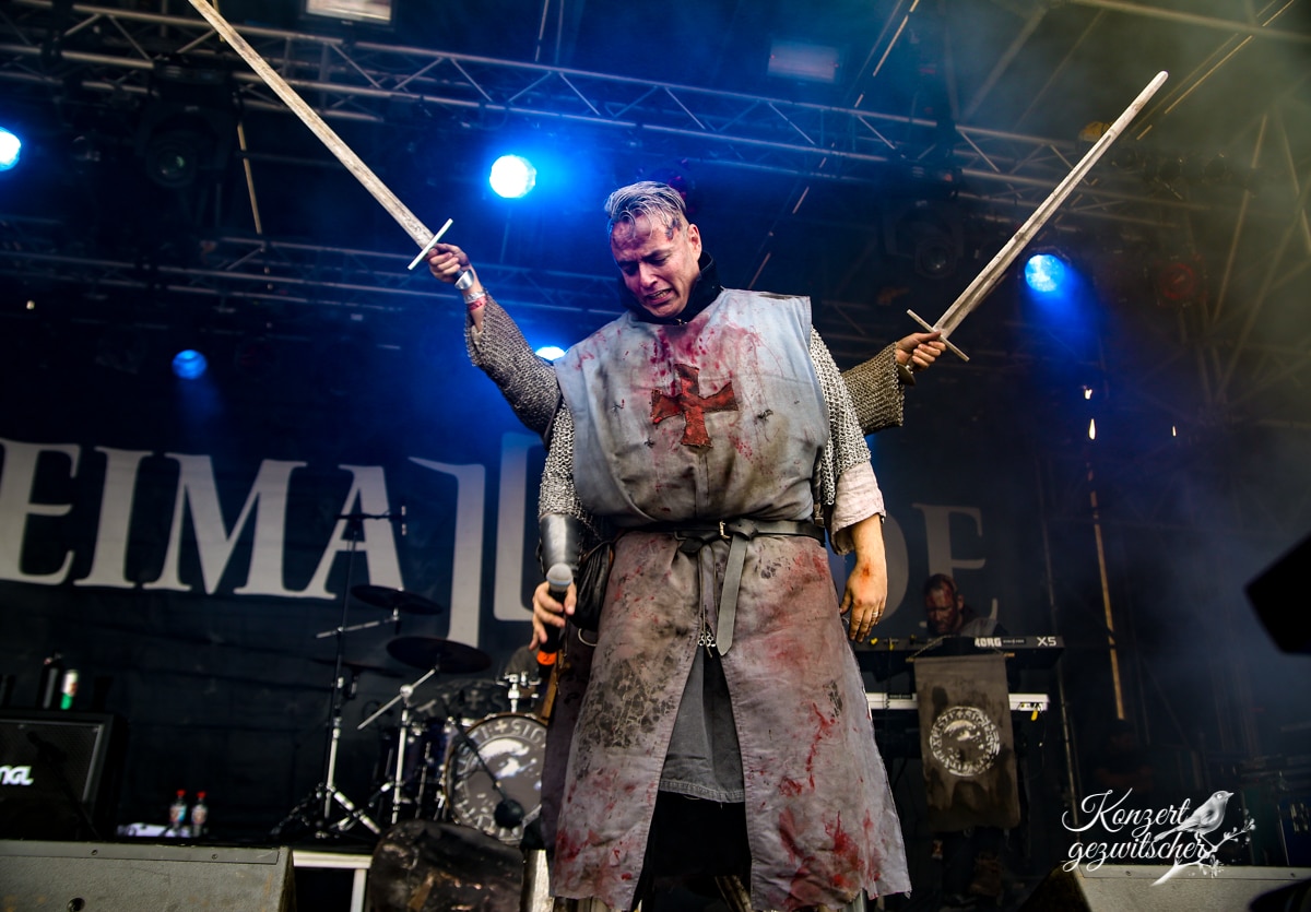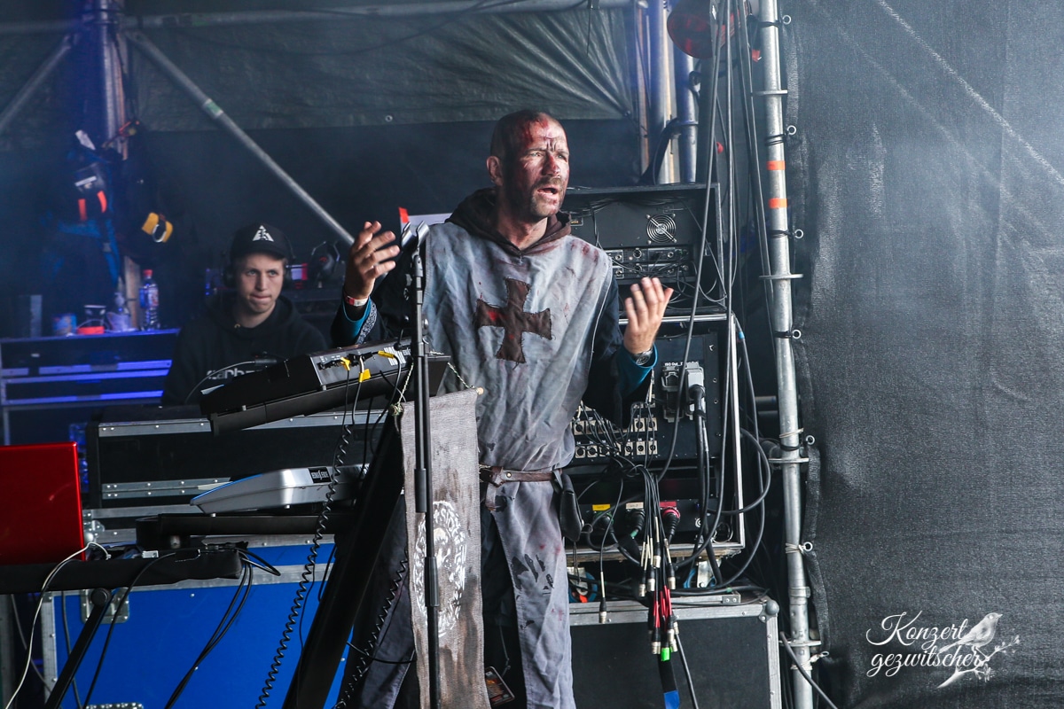 Einfall der untoten Templer: HEIMATAERDE besucht am letzten Tag des Festivals die Wackinger Stage und hat neben Äxten, Schwertern und Kunstblut auch jede Menge Partylaune im Gepäck. Denn trotz heroischen Einzugs zum Opener ‚Aerdenbrand‘ der gleichnamigen Platte wollen die Herrschaften um Ashlar von Megalon im hohen Norden vor allem eins: Mit den zahlreichen Besuchern auf dem mittelalterlichen Gelände des Holy Grounds jede Menge Spaß haben. Schließlich haben die Medieval Electro Musiker einen Ruf als „Scooter der schwarzen Szene“ zu verteidigen. Und so mischt sich mit dem Auftritt von HEIMATAERDE eingängige, tanzbare Beats mit einer schaurig-schönen Bühnenshow einschließlich der Exekution von Ignatius von Schneeberg vor dem Publikum beim letzten Song (‚Hick Hack Hackebeil‘). Im Vergleich zu den bisherigen Auftritten der Band ist man dabei um ein Mitglied gewachsen; mit einem Drummer im Rücken hat HEIMATAERDE auf dem WACKEN OPEN AIR rhythmisch einiges an Auftrieb. Zu bedauern ist an diesem Tag eigentlich nur das Fehlen von Bruder Ansgar von Hucretha, der krankheitsbedingt für das Festival ausfällt. Umso höher der Respekt vor den Jungs von HEIMATAERDE, die ihren Auftritt auch trotz Probleme erstklassig über die Bühne bringen – Party-Feeling auf der Wackinger!