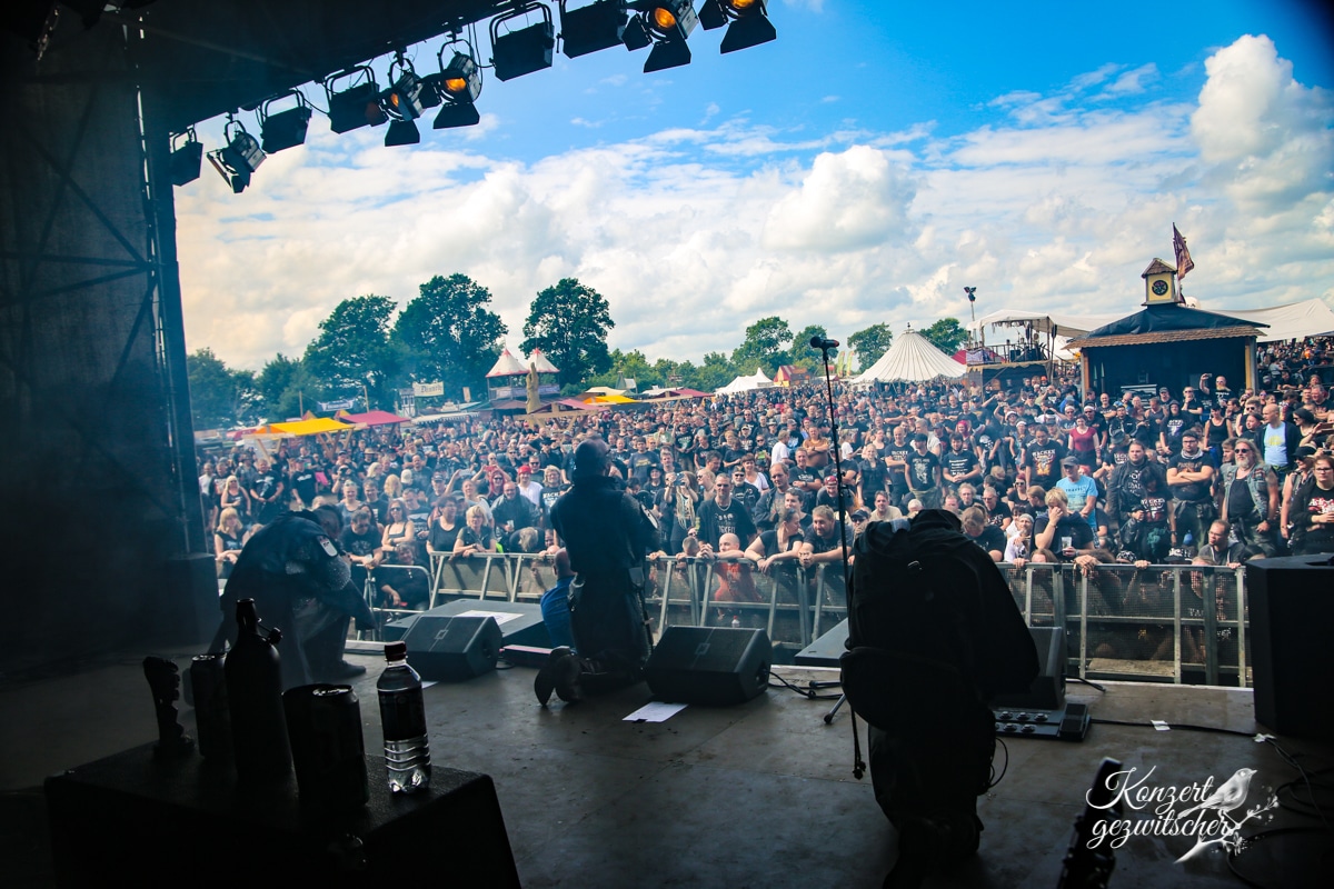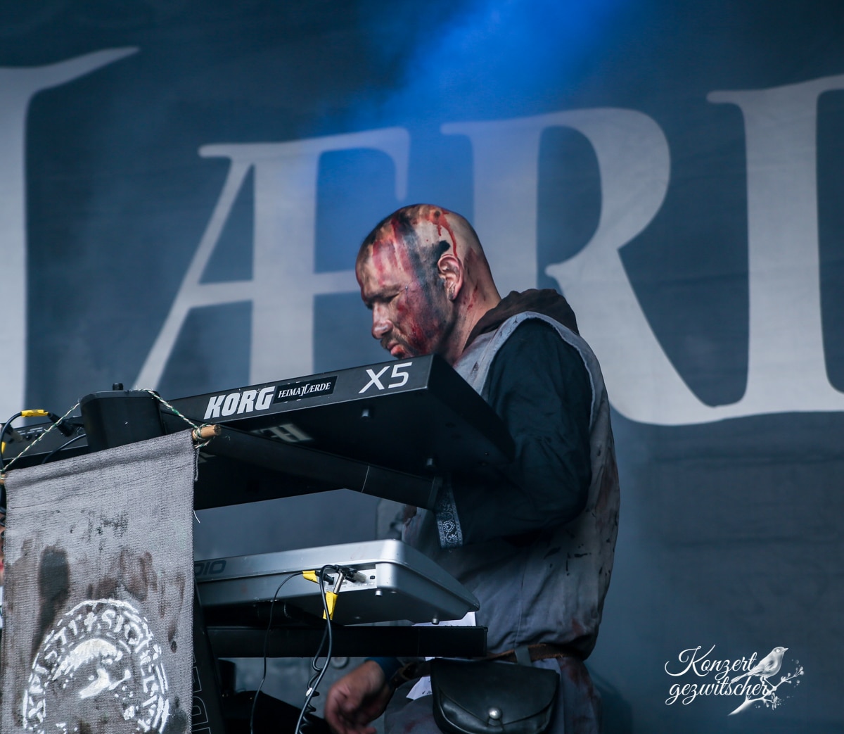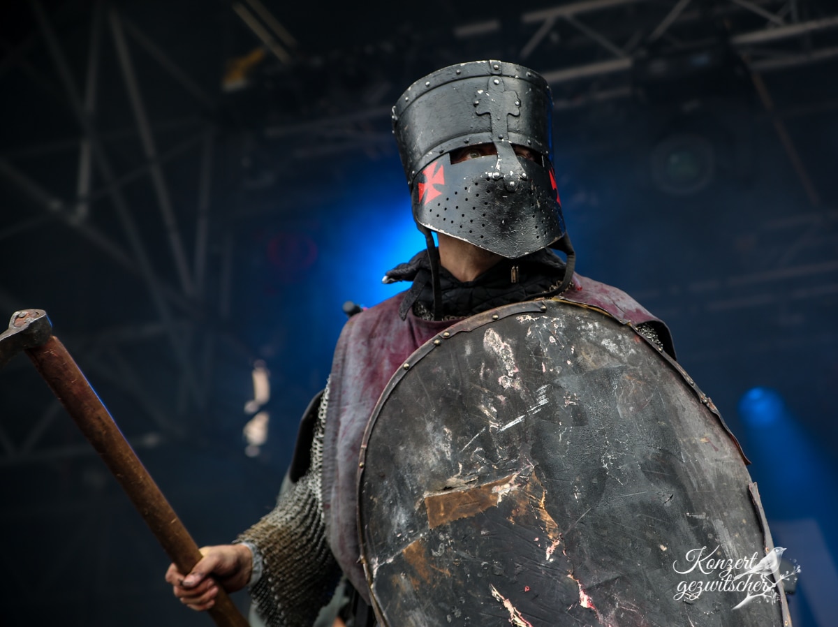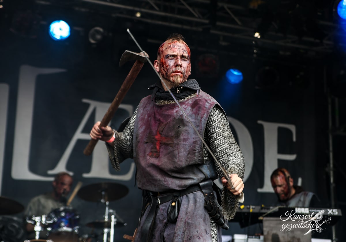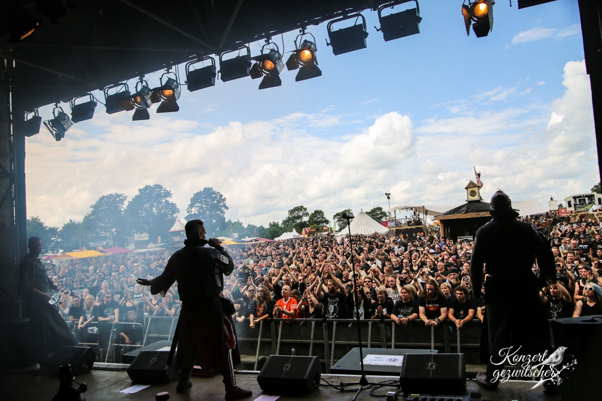 Einfall der untoten Templer: HEIMATAERDE besucht am letzten Tag des Festivals die Wackinger Stage und hat neben Äxten, Schwertern und Kunstblut auch jede Menge Partylaune im Gepäck. Denn trotz heroischen Einzugs zum Opener ‚Aerdenbrand‘ der gleichnamigen Platte wollen die Herrschaften um Ashlar von Megalon im hohen Norden vor allem eins: Mit den zahlreichen Besuchern auf dem mittelalterlichen Gelände des Holy Grounds jede Menge Spaß haben. Schließlich haben die Medieval Electro Musiker einen Ruf als „Scooter der schwarzen Szene“ zu verteidigen. Und so mischt sich mit dem Auftritt von HEIMATAERDE eingängige, tanzbare Beats mit einer schaurig-schönen Bühnenshow einschließlich der Exekution von Ignatius von Schneeberg vor dem Publikum beim letzten Song (‚Hick Hack Hackebeil‘). Im Vergleich zu den bisherigen Auftritten der Band ist man dabei um ein Mitglied gewachsen; mit einem Drummer im Rücken hat HEIMATAERDE auf dem WACKEN OPEN AIR rhythmisch einiges an Auftrieb. Zu bedauern ist an diesem Tag eigentlich nur das Fehlen von Bruder Ansgar von Hucretha, der krankheitsbedingt für das Festival ausfällt. Umso höher der Respekt vor den Jungs von HEIMATAERDE, die ihren Auftritt auch trotz Probleme erstklassig über die Bühne bringen – Party-Feeling auf der Wackinger!