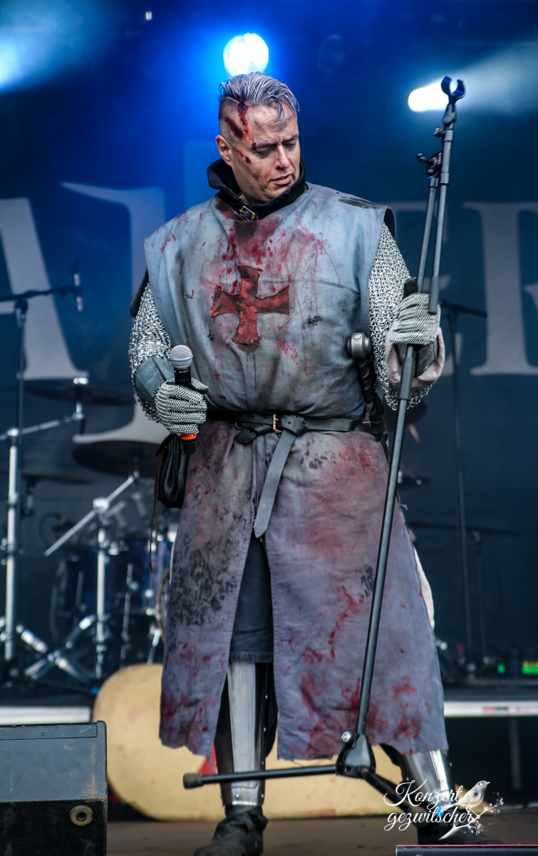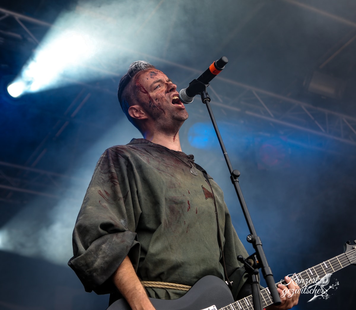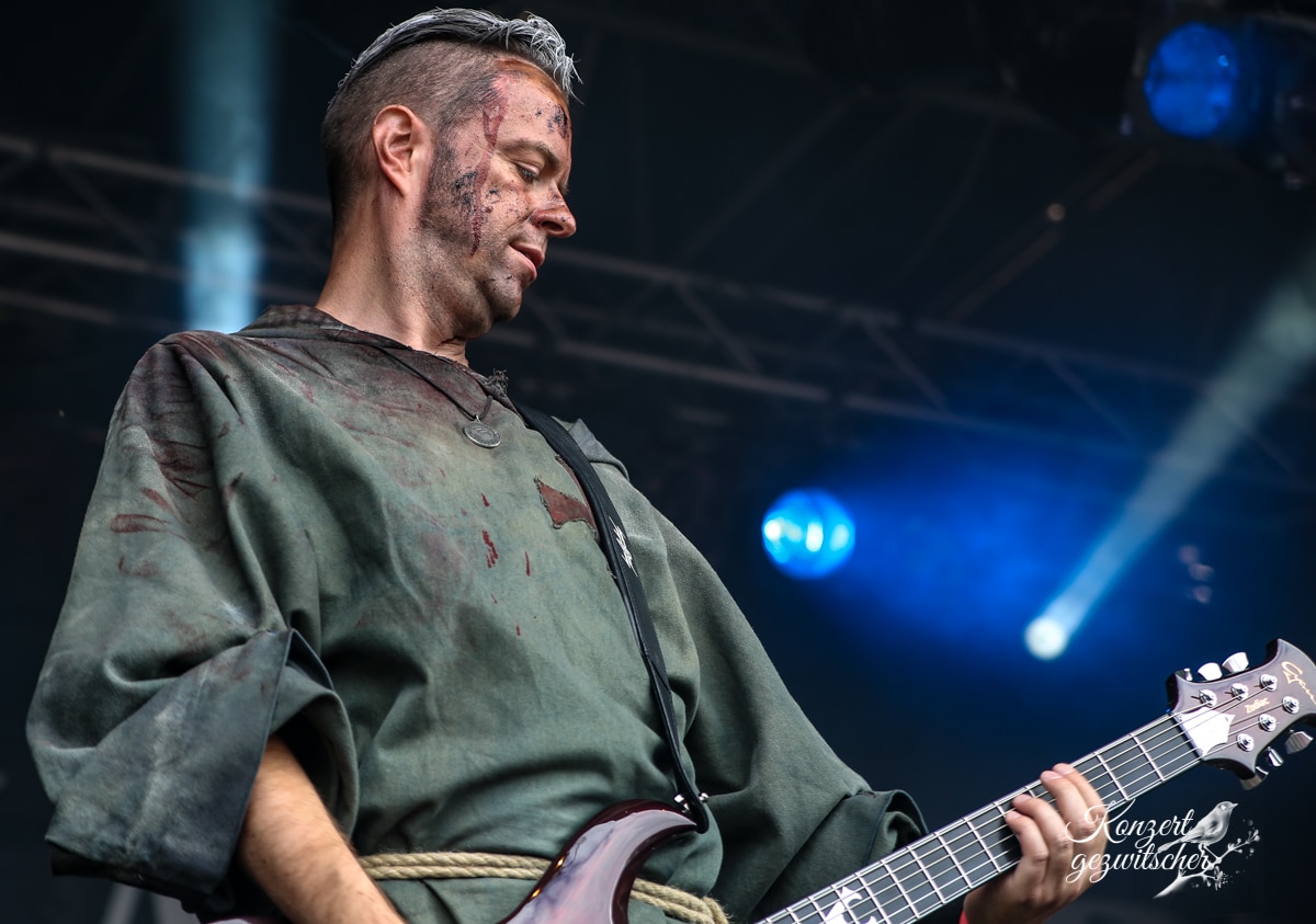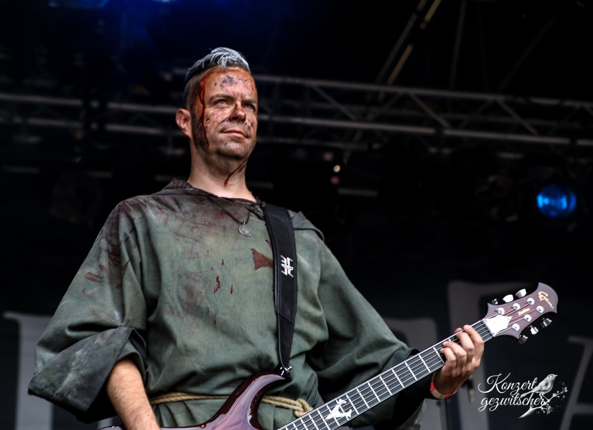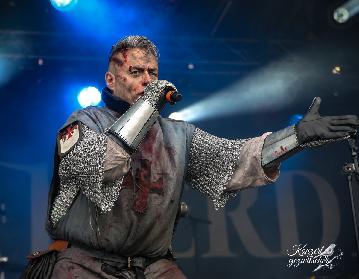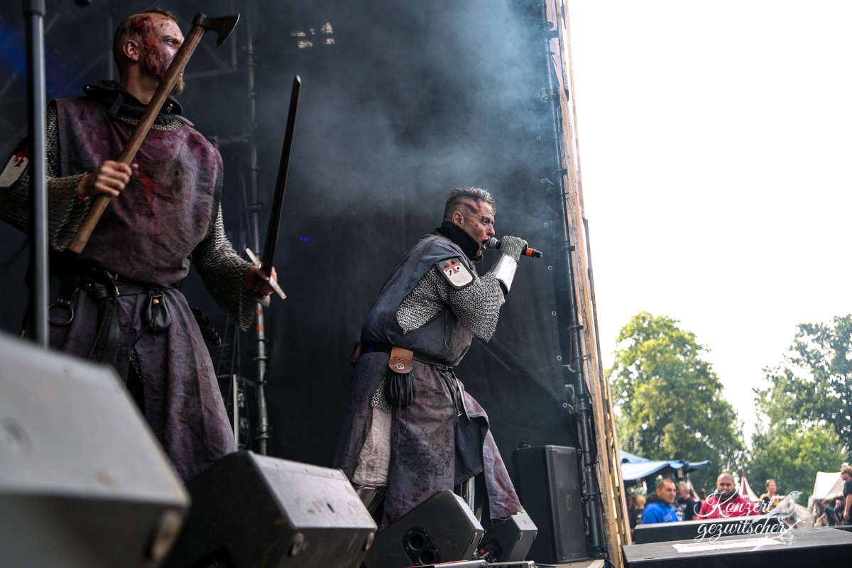 Einfall der untoten Templer: HEIMATAERDE besucht am letzten Tag des Festivals die Wackinger Stage und hat neben Äxten, Schwertern und Kunstblut auch jede Menge Partylaune im Gepäck. Denn trotz heroischen Einzugs zum Opener ‚Aerdenbrand‘ der gleichnamigen Platte wollen die Herrschaften um Ashlar von Megalon im hohen Norden vor allem eins: Mit den zahlreichen Besuchern auf dem mittelalterlichen Gelände des Holy Grounds jede Menge Spaß haben. Schließlich haben die Medieval Electro Musiker einen Ruf als „Scooter der schwarzen Szene“ zu verteidigen. Und so mischt sich mit dem Auftritt von HEIMATAERDE eingängige, tanzbare Beats mit einer schaurig-schönen Bühnenshow einschließlich der Exekution von Ignatius von Schneeberg vor dem Publikum beim letzten Song (‚Hick Hack Hackebeil‘). Im Vergleich zu den bisherigen Auftritten der Band ist man dabei um ein Mitglied gewachsen; mit einem Drummer im Rücken hat HEIMATAERDE auf dem WACKEN OPEN AIR rhythmisch einiges an Auftrieb. Zu bedauern ist an diesem Tag eigentlich nur das Fehlen von Bruder Ansgar von Hucretha, der krankheitsbedingt für das Festival ausfällt. Umso höher der Respekt vor den Jungs von HEIMATAERDE, die ihren Auftritt auch trotz Probleme erstklassig über die Bühne bringen – Party-Feeling auf der Wackinger!