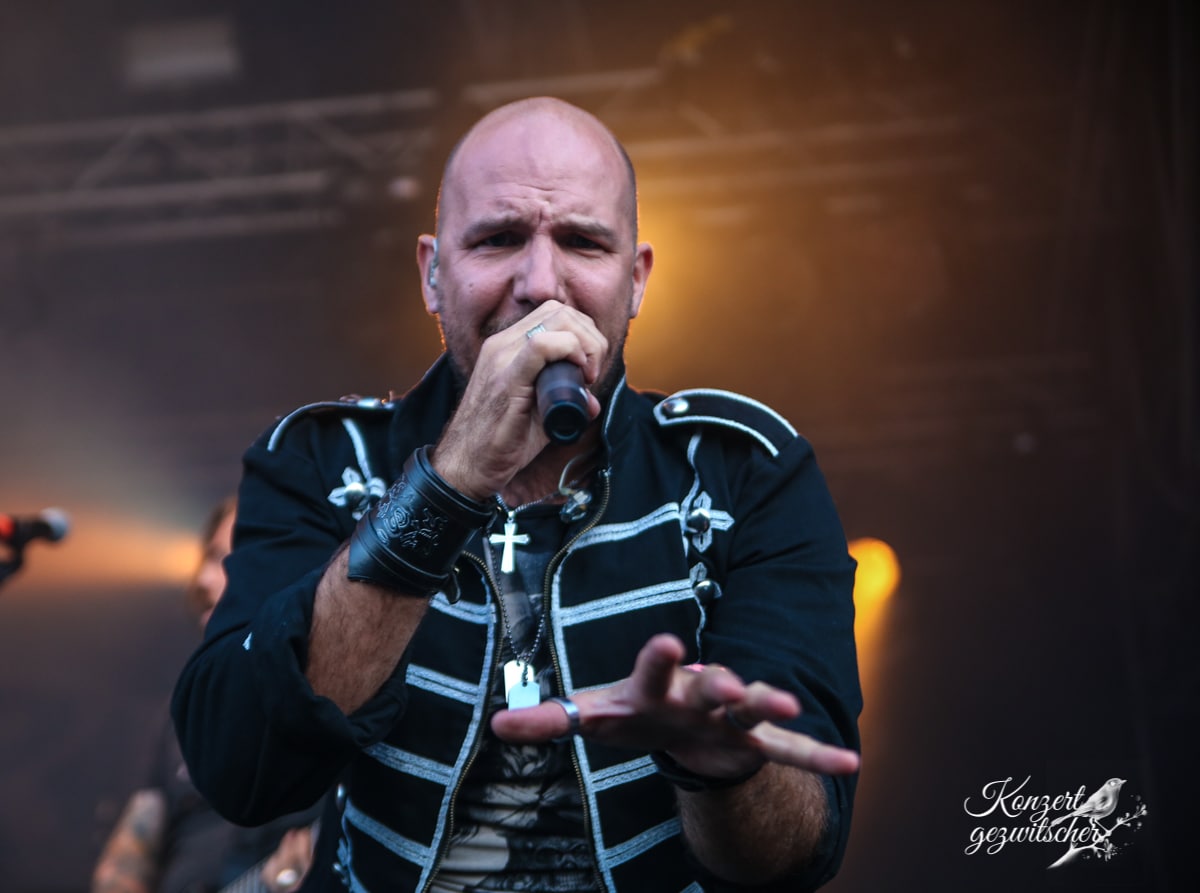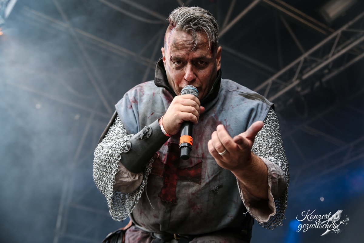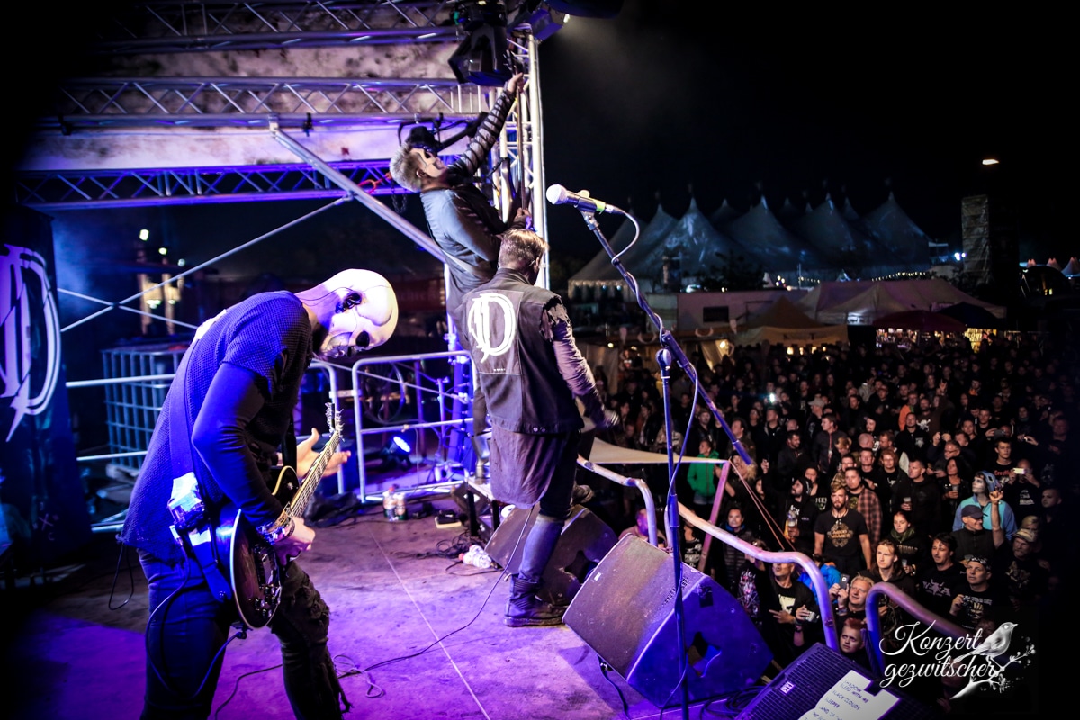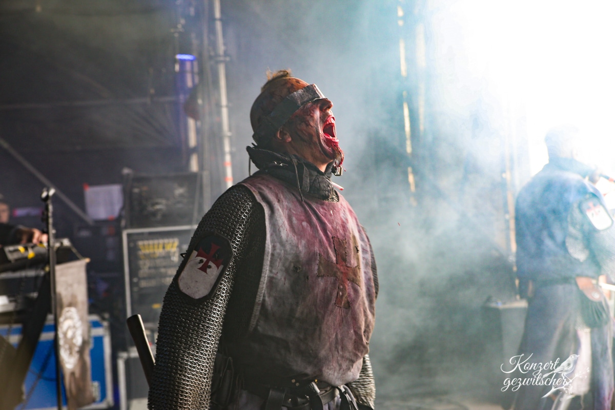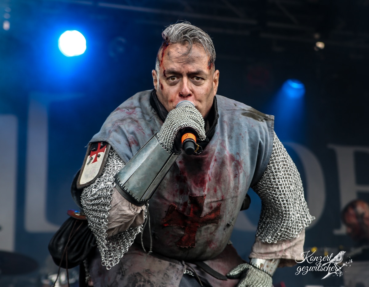 Einfall der untoten Templer: HEIMATAERDE besucht am letzten Tag des Festivals die Wackinger Stage und hat neben Äxten, Schwertern und Kunstblut auch jede Menge Partylaune im Gepäck. Denn trotz heroischen Einzugs zum Opener ‚Aerdenbrand‘ der gleichnamigen Platte wollen die Herrschaften um Ashlar von Megalon im hohen Norden vor allem eins: Mit den zahlreichen Besuchern auf dem mittelalterlichen Gelände des Holy Grounds jede Menge Spaß haben. Schließlich haben die Medieval Electro Musiker einen Ruf als „Scooter der schwarzen Szene“ zu verteidigen. Und so mischt sich mit dem Auftritt von HEIMATAERDE eingängige, tanzbare Beats mit einer schaurig-schönen Bühnenshow einschließlich der Exekution von Ignatius von Schneeberg vor dem Publikum beim letzten Song (‚Hick Hack Hackebeil‘). Im Vergleich zu den bisherigen Auftritten der Band ist man dabei um ein Mitglied gewachsen; mit einem Drummer im Rücken hat HEIMATAERDE auf dem WACKEN OPEN AIR rhythmisch einiges an Auftrieb. Zu bedauern ist an diesem Tag eigentlich nur das Fehlen von Bruder Ansgar von Hucretha, der krankheitsbedingt für das Festival ausfällt. Umso höher der Respekt vor den Jungs von HEIMATAERDE, die ihren Auftritt auch trotz Probleme erstklassig über die Bühne bringen – Party-Feeling auf der Wackinger!