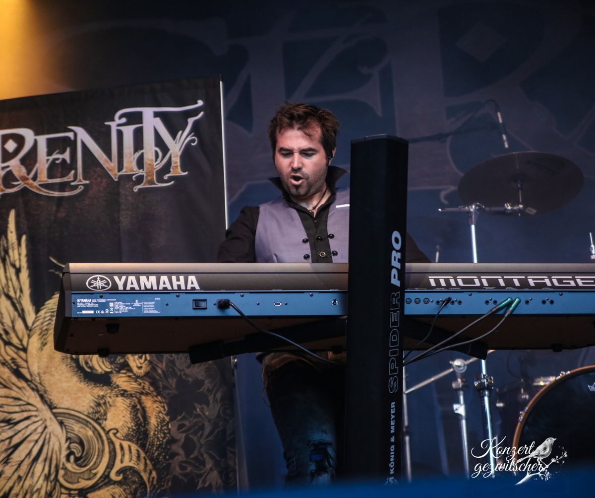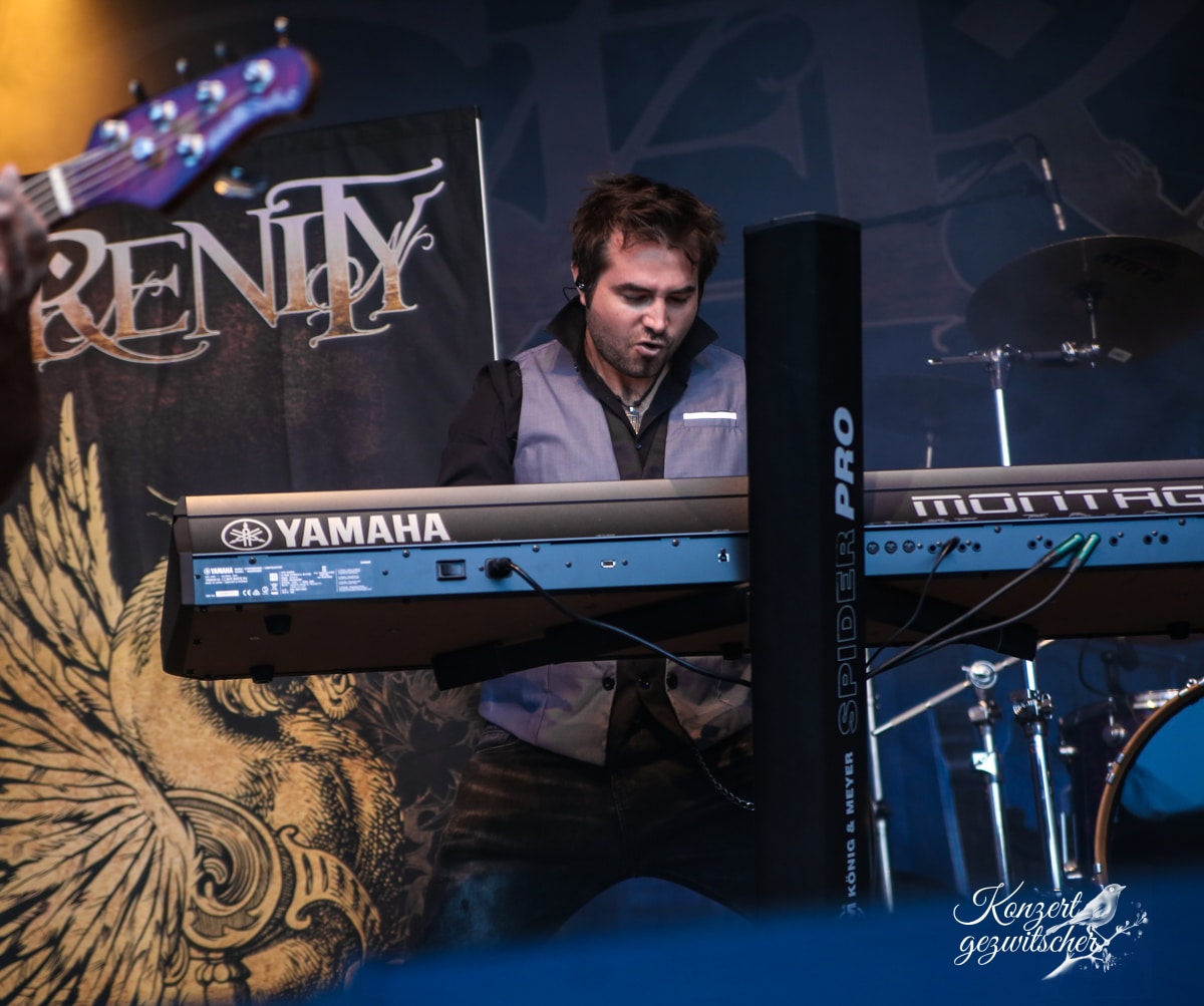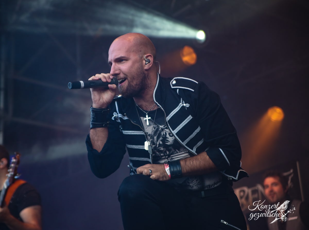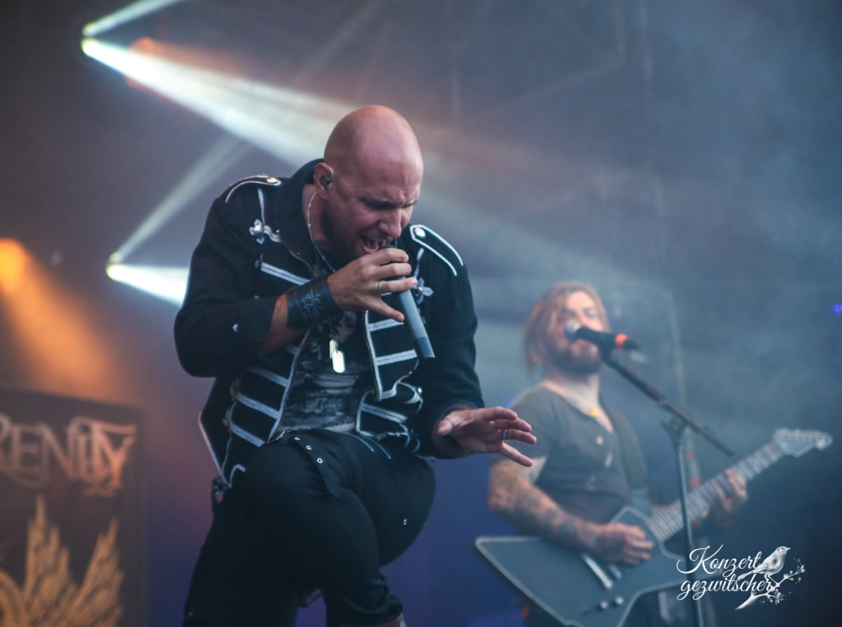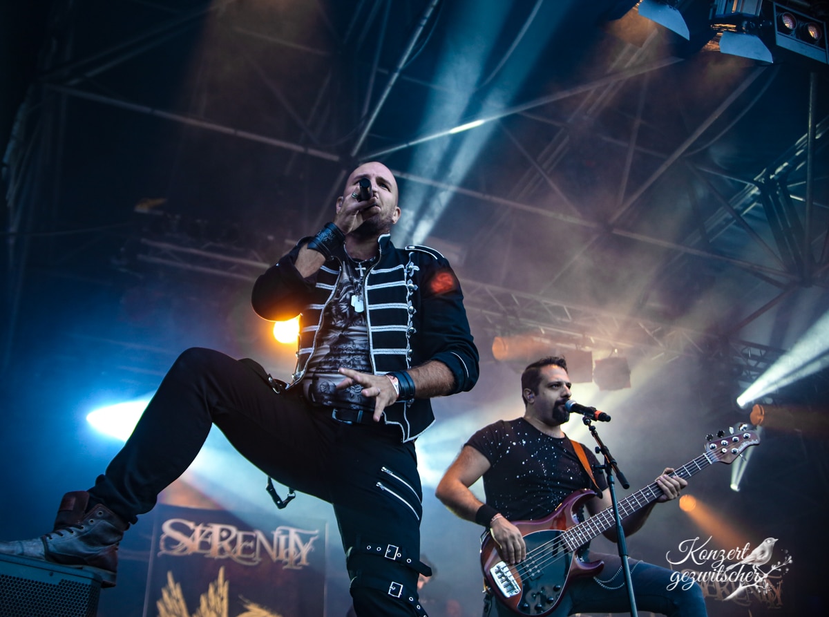 Mit SERENITY bekomme ich am letzten Tag des WACKEN OPEN AIR noch einen weiteren Beweis für die hohe Qualität, die sich auf dem Festival im hohen Norden auch auf den Nebenbühnen abspielt. Denn die Österreicher haben ihr Level, das sie schon auf dem CASTLE ROCK Ende Juni eindrucksvoll bewiesen haben, noch einmal gesteigert. So sorgt SERENITY erst mit einem stimmungsvollen Bühnenbild und schließlich den epischen Klängen des „Codex Atlanticus“ für einen Hauch Mystik. Nach dem sehr gediegenen Intro setzt Sänger Georg Neuhauser gleich mit dem ersten Titel ‚Follow Me‘ für einen neuen Standard an Agilität und Dynamik: Es wird gesprungen, gebangt und gefeiert, sodass der Funke über den virtuosen Chris Hermsdörfer an der Gitarre quer durch die Band geht. SERENITY präsentiert sich am Samstag wahlweise als Geschichtenerzähler, Heroen mit Titeln wie ‚Leonardo‘ oder einfach nur als grandiose Partymacher. Den Sympathiebonus des Publikums erspielen sich die Österreicher mühelos innerhalb weniger Stücke: Man möchte SERENITY am liebsten gar nicht mehr von der Bühne lassen. Nur noch eine Geschichte… äh… ein Lied. Gänsehautfaktor pur! Ein besonderes Schmankerl, mit dem Sänger Georg bei seinen Kollegen für Verwirrung und beim Publikum für Belustigung sorgt, schließlich die wohl bemerkenswerteste Aussage auf dem WACKEN OPEN AIR an diesem Wochenende (neben der Drohung Marilyn Mansons, die Bühne zu verlassen, wenn das Publikum nicht bald mal aus den Puschen kommt): „Macht ihr mal ein Abschlussbild, ich gehe Crowdsurfen!“ Der Rock’n Roll ist auch auf der Wackinger Stage mehr als lebendig, er trägt den Namen SERENITY!