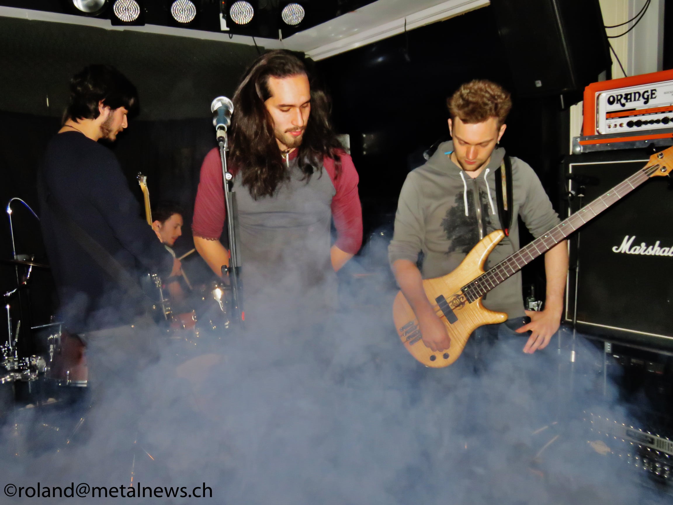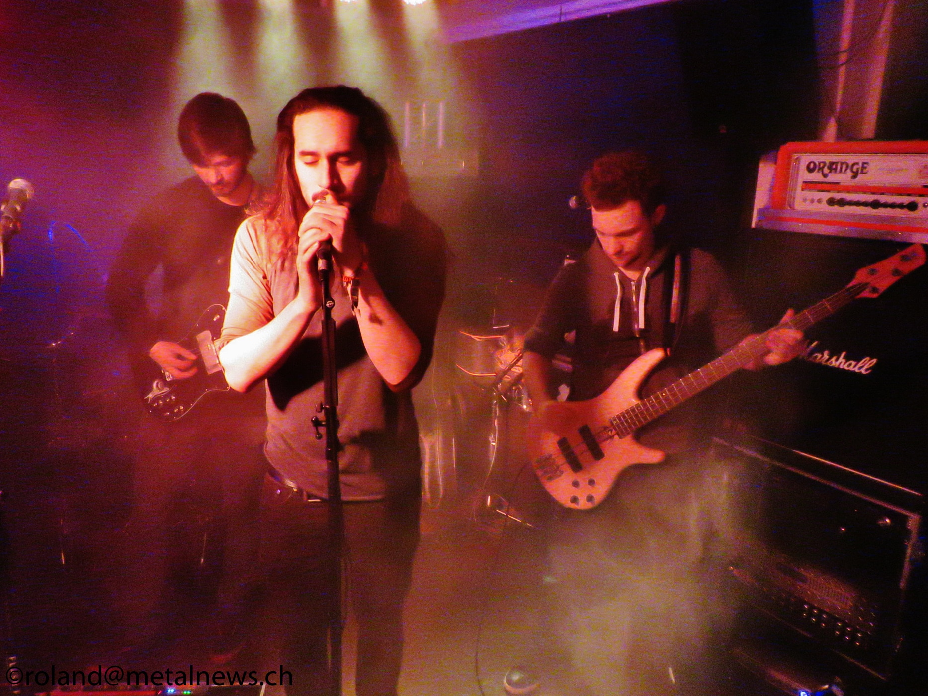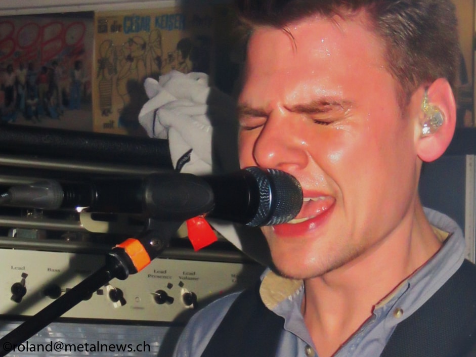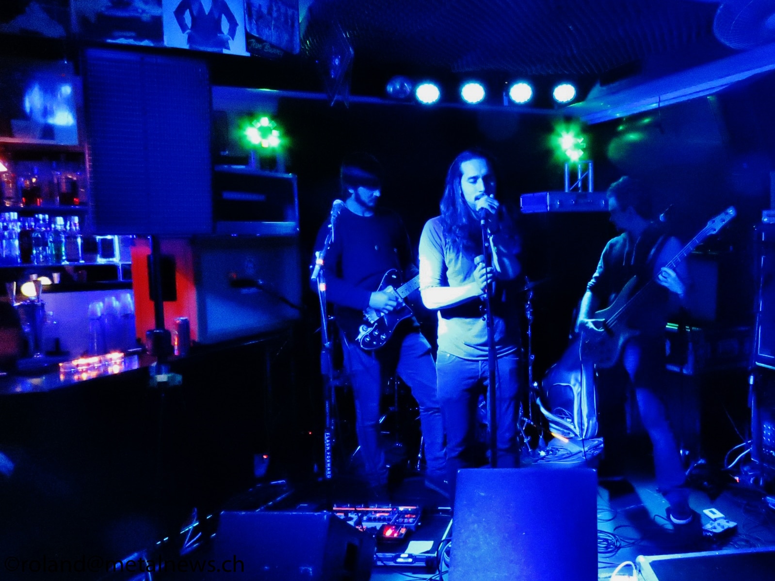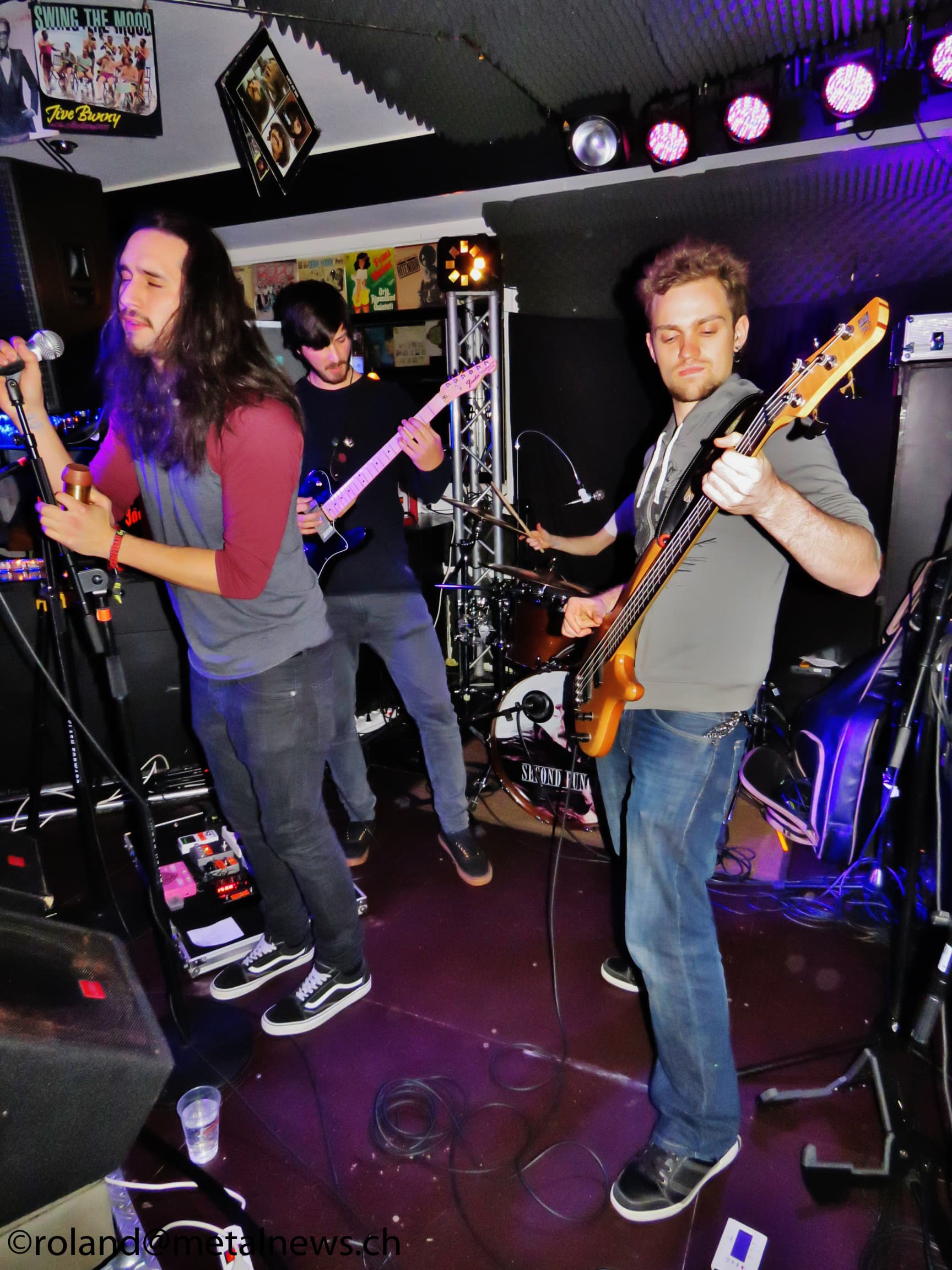 Der Soundcheck geht zügig über die Bühne und dann beginnt auch schon die erste Band zu spielen. Es ist dies die Zürcher Progressive Rock Band OPEN EYED, bestehend aus vier Mitgliedern. Optisch auffällig an ihrem Gig ist dass der Sänger oftmals seine Augen geschlossen hält, bedingt durch die Bühnenbeleuchtung. Aus meiner Sicht bietet die Band eine gute Show, sie hält sich aber merklich zurück was die Animation des Publikums zum Mitmachen anbelangt, dennoch fordern die Zuschauer eine Zugabe welche OPEN EYED bereitwillig in Form des Songs „Broken Bells“ gibt. Diese Zugabe sowie die Songs „Trustitude“ und „Tormenta“ kann man sich auf meinen Youtube-Channel „JudR666“ zu Gemüte führen.
