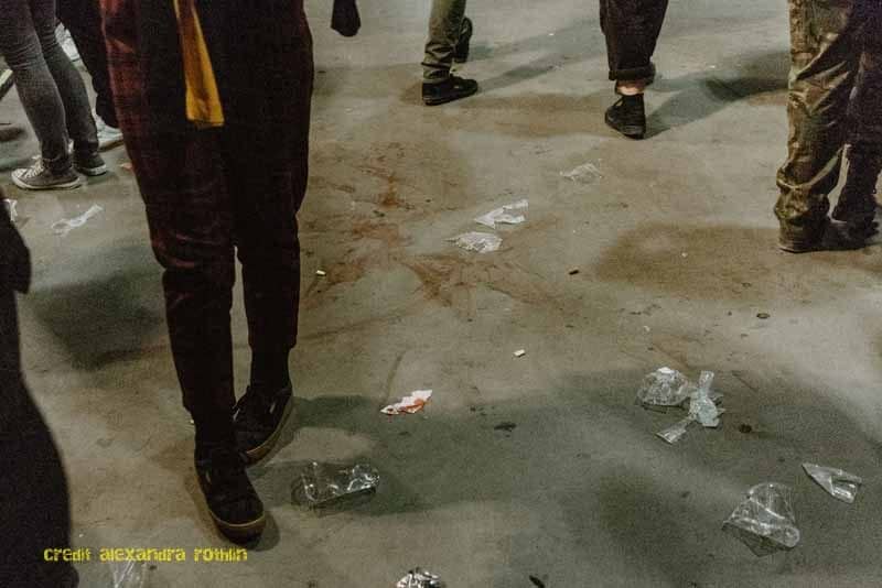 Natürliche war die Stimmung danach eher nervös. Es tönte laut hinter dem Merchstand hervor: „make some space for the guy!“ und innerhalb kürzester Zeit war eine Rettungsgasse bereit. Die Securitys halfen einem grossen Mann mit einer blutenden Kopfwunde hinaus. Währenddessen setzte jemand von den SEA SHEPERDS zu einem Applaus an. Der ganze Saal hat mit eingestimmt, so wurde für einen ehrenvollen Abgang gesorgt.