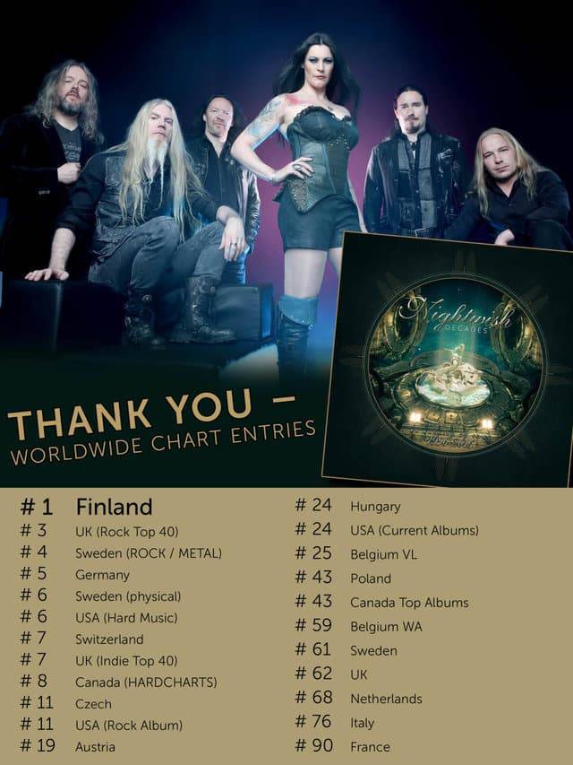 Heute können NIGHTWISH stolz die Chart-Ergebnisse zu „Decades“ verkünden, welches sich in zahlreichen Ländern in den Top 10 platzieren konnte, darunter auch einen sagenhaften 1. Platz in Finnland und #5 in Deutschland! Alle Resultate hier im Überblick: