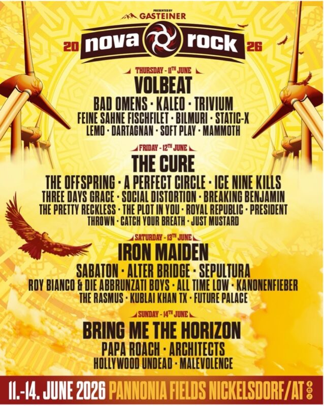 Das NOVA ROCK findet von Donnerstag, 11. Juni, bis Sonntag, 14. Juni 2026 auf den Pannonischen Feldern II in Nickelsdorf (Burgenland, Österreich) statt.
