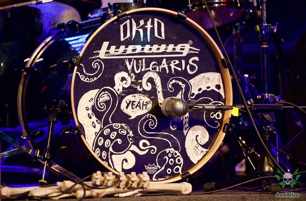 Die lokalen Helden des Abends waren OKTO VULGARIS und hatten auch die meisten Fans dabei. Ein wenig Wohnzimmer Atmosphäre wurde durch eine alte Kommode sowie zwei kleinen rote Tischlämpchen verbreitet. Auch der Mikroständer der Sängerin war mit einem Mix aus Blumen und Totenköpfen verziert.