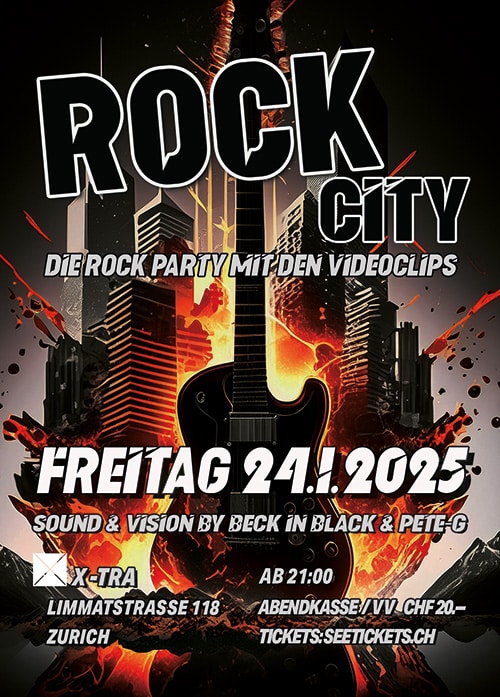 ROCK CITY ist eine neue Rock Party im X-TRA Zürich mit DJ Beck in Black und Pete-G. Jeder Song wird mit dem dazugehörigen Videoclip gespielt. Am 24. Januar findet die Party zum zweiten Mal statt.