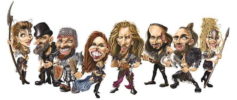 FEUERSCHWANZ are Hauptmann Feuerschwanz (vocals, acoustic guitar), Johanna von der Vögelweide alias Stephanie Pracht (violin, hurdy-gurdy), Hans der Aufrechte alias Hans Platz (electric guitar), Prinz R. Hodenherz III alias Benjamin Metzner (acoustic guitar, flutes, rauschpfeife, bagpipes, vocals), Jarne Hodinsson alias Jan Jamaszyk (electric bass), Rollo H. Schönhaar alias Rolf Hering (drums), Mieze Musch-Musch (performance & dance) and Mieze Myu alias Jenny Diehl (performance, dance, harp).
