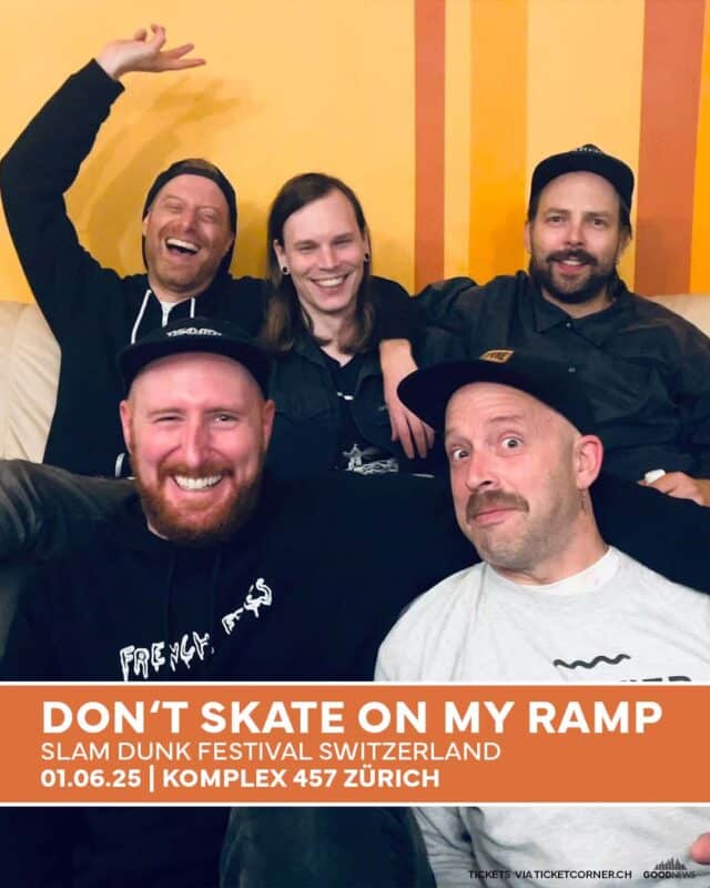 Bestehend aus Mitgliedern verschiedener Schweizer Bands – darunter Kevin von NOFNOG, Kris von HUNTED LIKE THIEVES, Nik von USELESS und ANGR MGMT., Phil von WOLF AND THE HEART OF und Ron von KRANK – liefert DON’T SKATE ON MY RAMP eine epische und unterhaltsame Show voller Knaller und Nostalgie. Ihre Setlist enthält all deine Lieblingshits von legendären Bands wie MILLENCOlIN, BAD RELIGION, LAGWAGON, CONSUMED, RAGE AGAINST THE MACHINE und vielen, vielen mehr.
