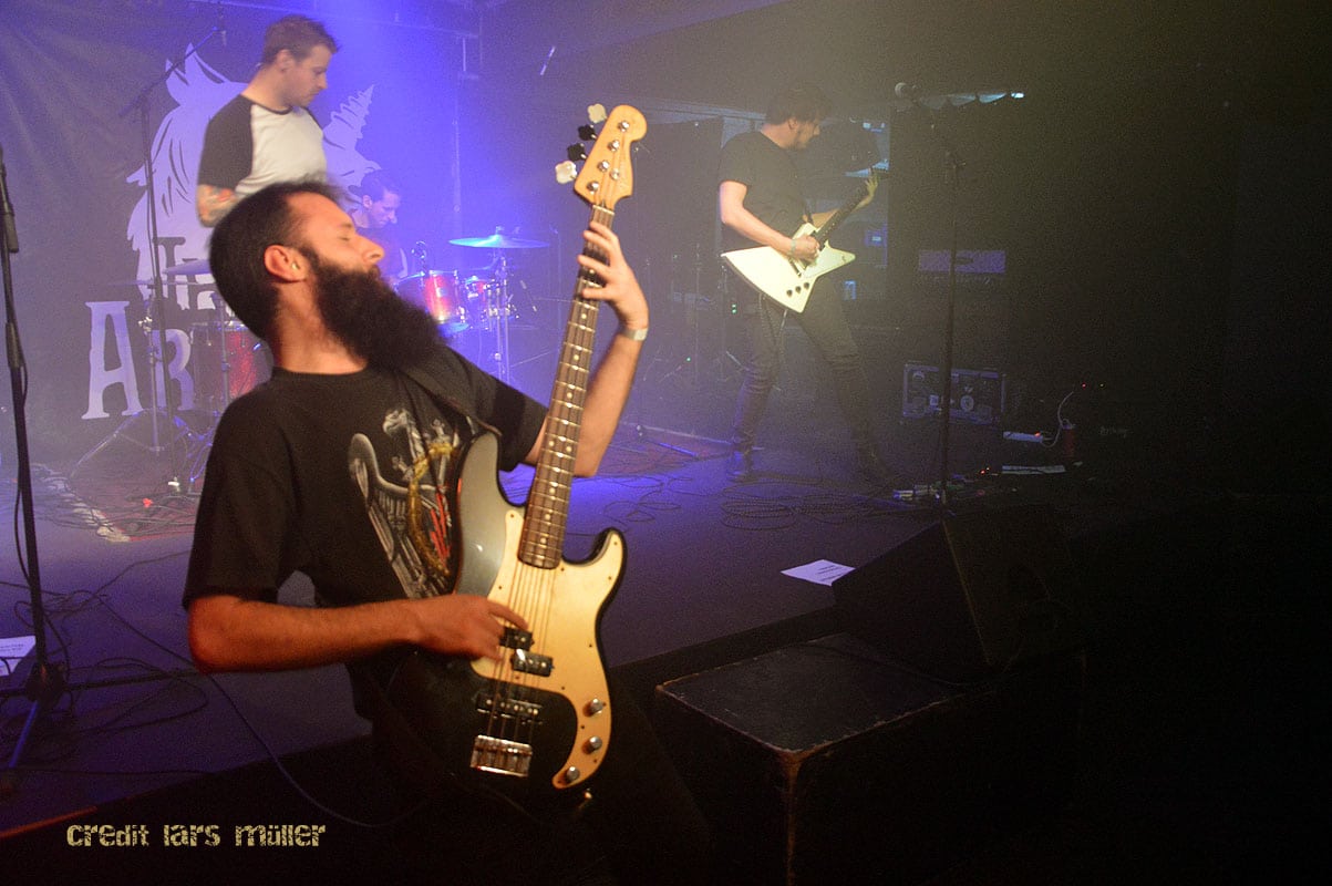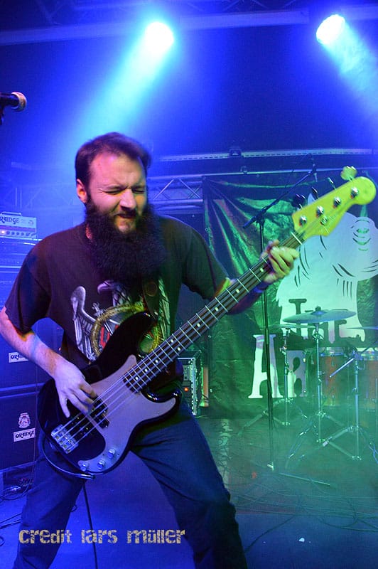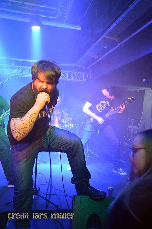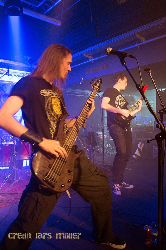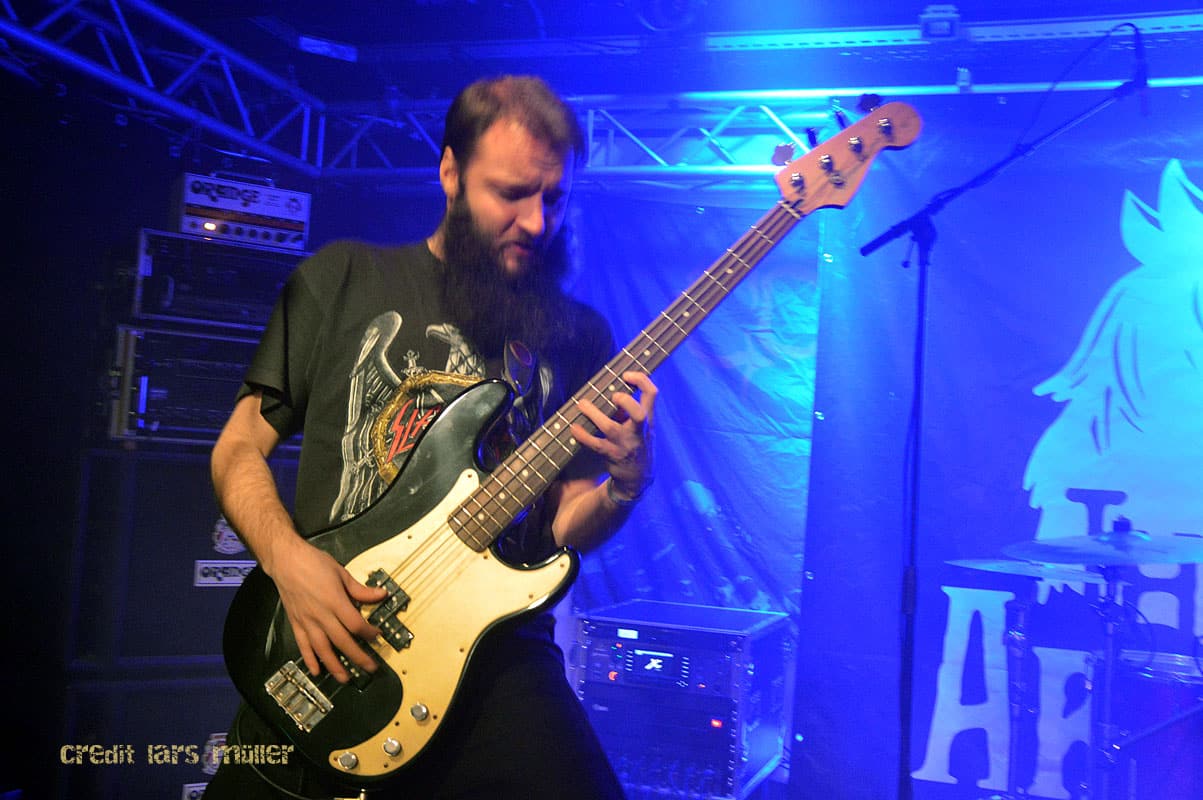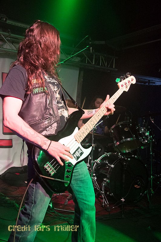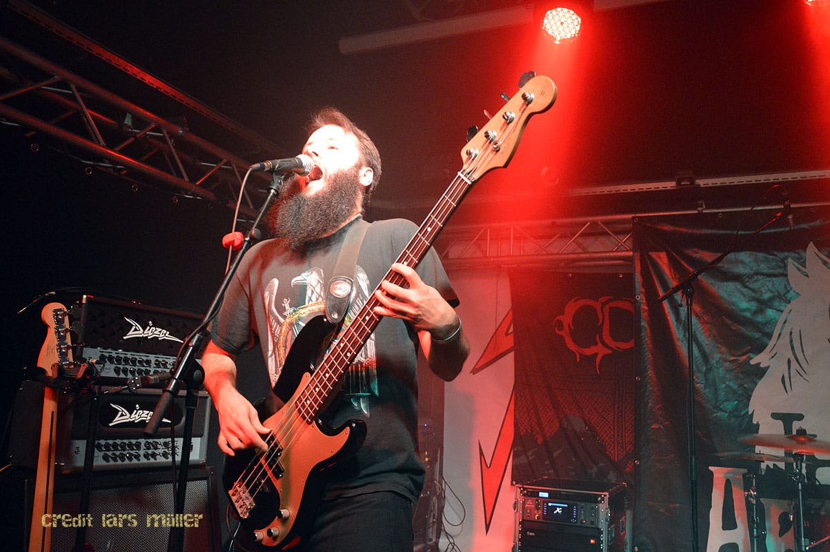Da es vor der Bühne sehr viel Platz hatte, dachte sich wohl auch der Vollbärtige Basser Flo, dass man soh die Bühne erweitern könne. Mit Erfolg. Da in letzter Zeit eine regelrechte Grippenwelle umherzog, schien es so, als hätte es auch keinen halt vor Sänger Mike gemacht. Zwischendurch hustete auch er immer wieder. Zum Glück gab es keinen Abriss bei seiner brachialen Stimme.